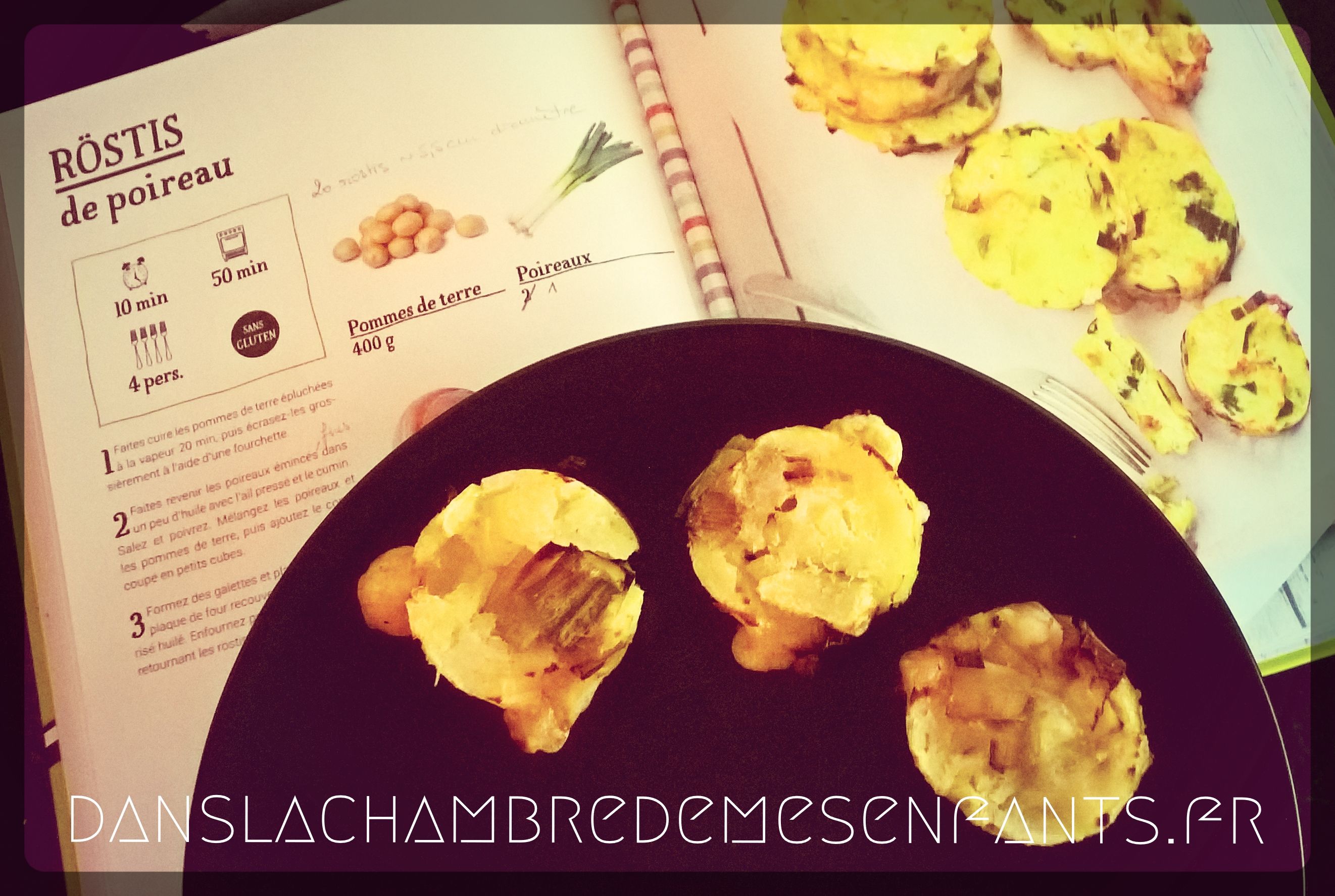 Test 3 : J’ai laissé le choix à mon fils qui a retenu les röstis de poireau. J’ai eu trop de quantité de poireau (1 seul au lieu de 2 aurait suffi) et pas assez de fromage. Jusque là, rien de grave car j’ai joué au chef en rajustant 😉 J’ai entrepris de bien faire les choses en formant les röstis à l’aide d’un emporte-pièce, tassant les légumes à la cuillère (précision non faite dans le livre) ce qui a été pertinent. Mais, à la cuisson (four), un tiers des disques se sont déformés (peut-être que trop de cubes de comté ont été regroupés). J’ai trouvé utile de prendre en photo les plus jolis et ceux défaits (adjugés à Alex, fan de Star Wars 🙂 ).