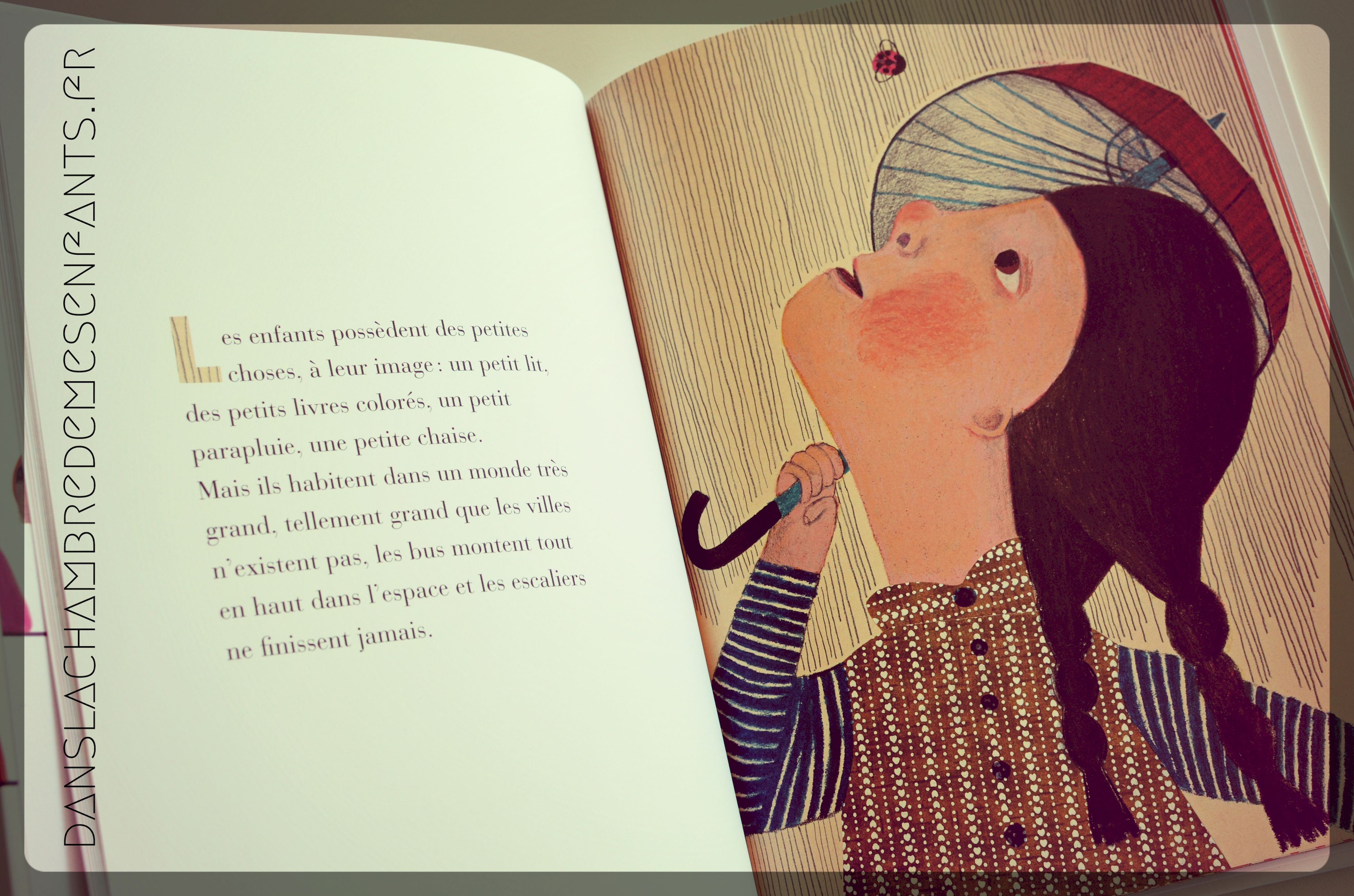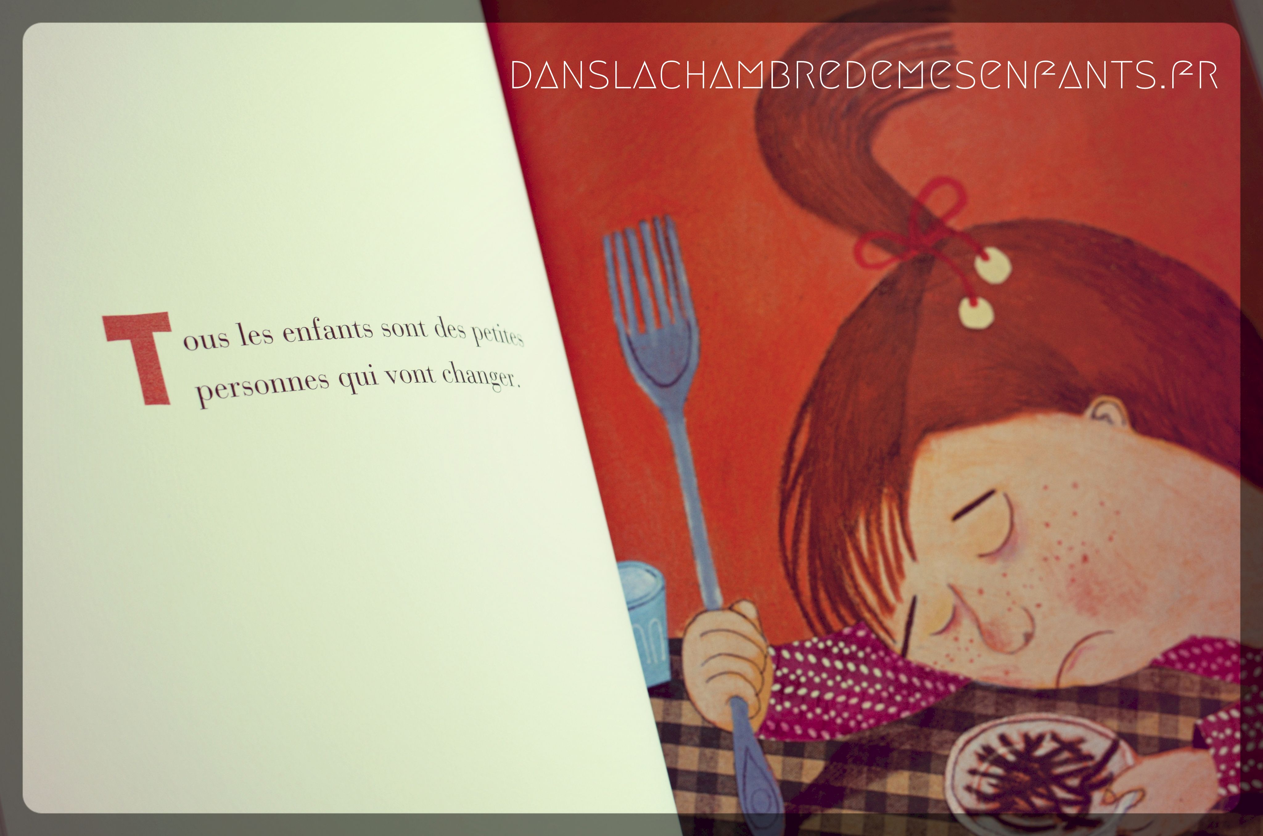Les dessins ont des airs enfantins : ils ne sont pas parfaits mais expressifs, parfois amusants. Cela permet une proximité avec le lecteur, à partir de 4 ans, et c’est bien là l’essentiel. L’histoire essaie simplement de décrire ce qu’est un enfant : « Un enfant est une petite personne. Il est petit pour un petit moment, puis il grandit. Il change sans y faire attention […] Un enfant a des petites mains, des petits pieds et des petites oreilles, mais pas toujours des petites idées. […] ». Jusqu’à l’âge où ils seront des adultes qui « feront des caprices pour des choses étranges comme un téléphone qui ne sonne pas ou la circulation ». Le fil conducteur entre les enfants et les adultes est ainsi joliment et doucement décrit à travers l’histoire pour conclure : « Un enfant est une petite personne. A présent, pour s’endormir, il a besoin des yeux gentils. Et de la petite lumière à côté du lit. »