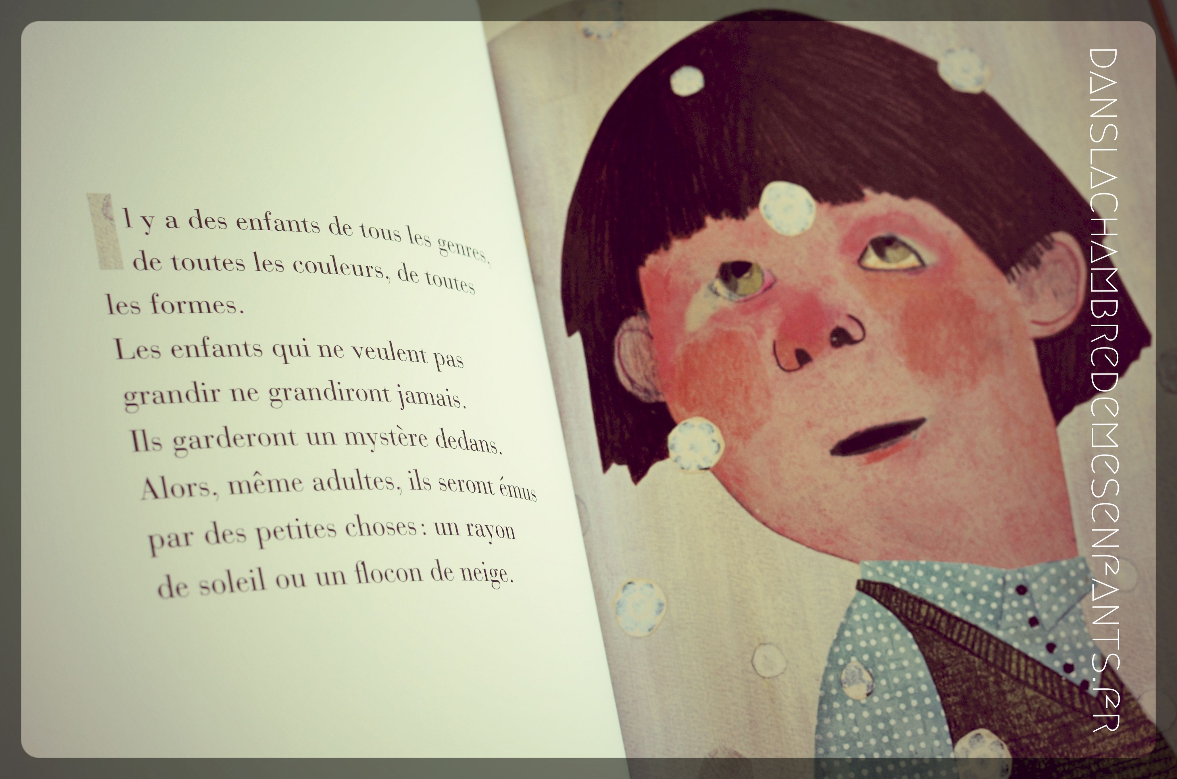 Ai-je vraiment besoin de commenter davantage ? Tout est si bien dit ! Tellement que je suis particulièrement touchée par un passage : « Les enfants qui ne veulent pas grandir ne grandiront jamais. Ils garderont un mystère dedans. Alors, même adultes, ils seront émus par des petites choses : un rayon de soleil ou un flocon de neige. » car ce livre parle aussi aux adultes, tant il est bon de formuler simplement les choses évidentes. Et voilà… maintenant je suis obligée de reconnaître qu’il a tout d’un livre coup de cœur ! C’est aussi ça la lecture 🙂
