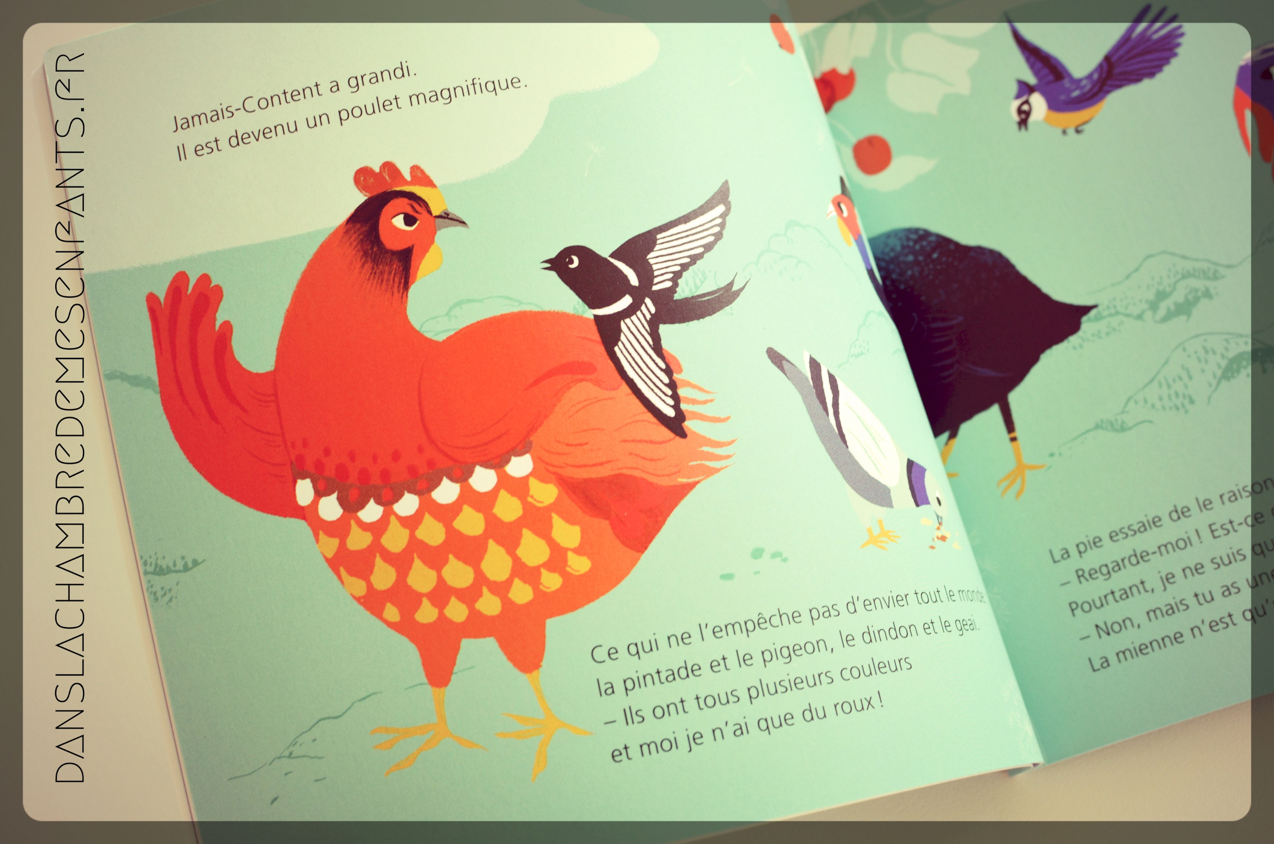 Tout commence ainsi : « A peine sorti de l’œuf, le poussin jaune commence à se plaindre. A cinq pas de sa coquille il rencontre un rouge-gorge. Pourquoi as-tu du rouge au jabot, toi ? Moi je n’en ai pas et j’en voudrais ! s’écrie le poussin grognon […] Mère poule n’a pas besoin de chercher comment appeler son poussin, son nom est tout trouvé : Jamais-Content […] ». En grandissant il devient aussi beau qu’envieux, jusqu’à solliciter Mère Nature pour changer insatiablement. La situation devient de plus en plus ridicule et il ne trouve le bonheur que lorsqu’il rencontre quelqu’un qui l’accepte, comme il est, portant un œil sur lui différent du sien.