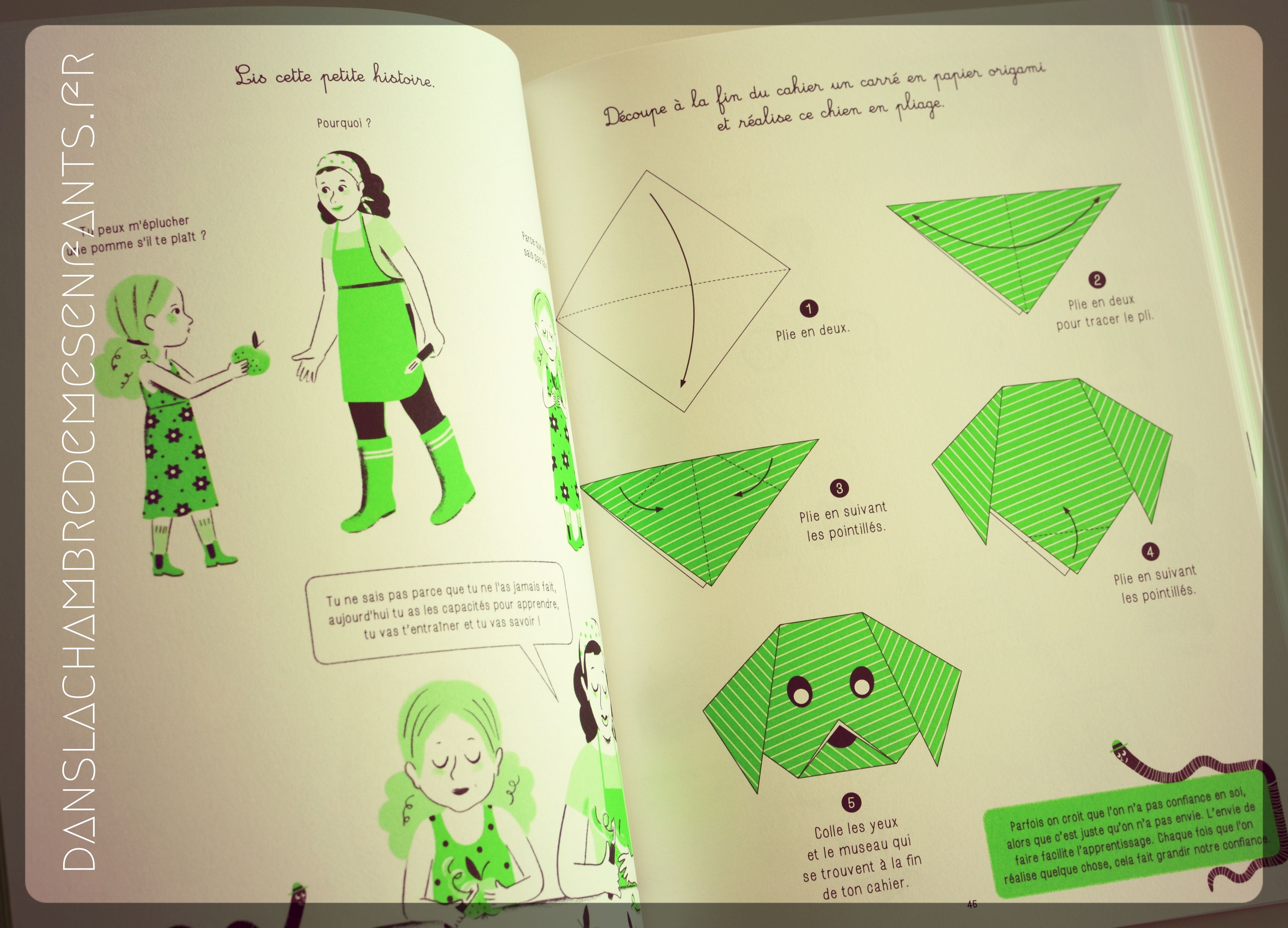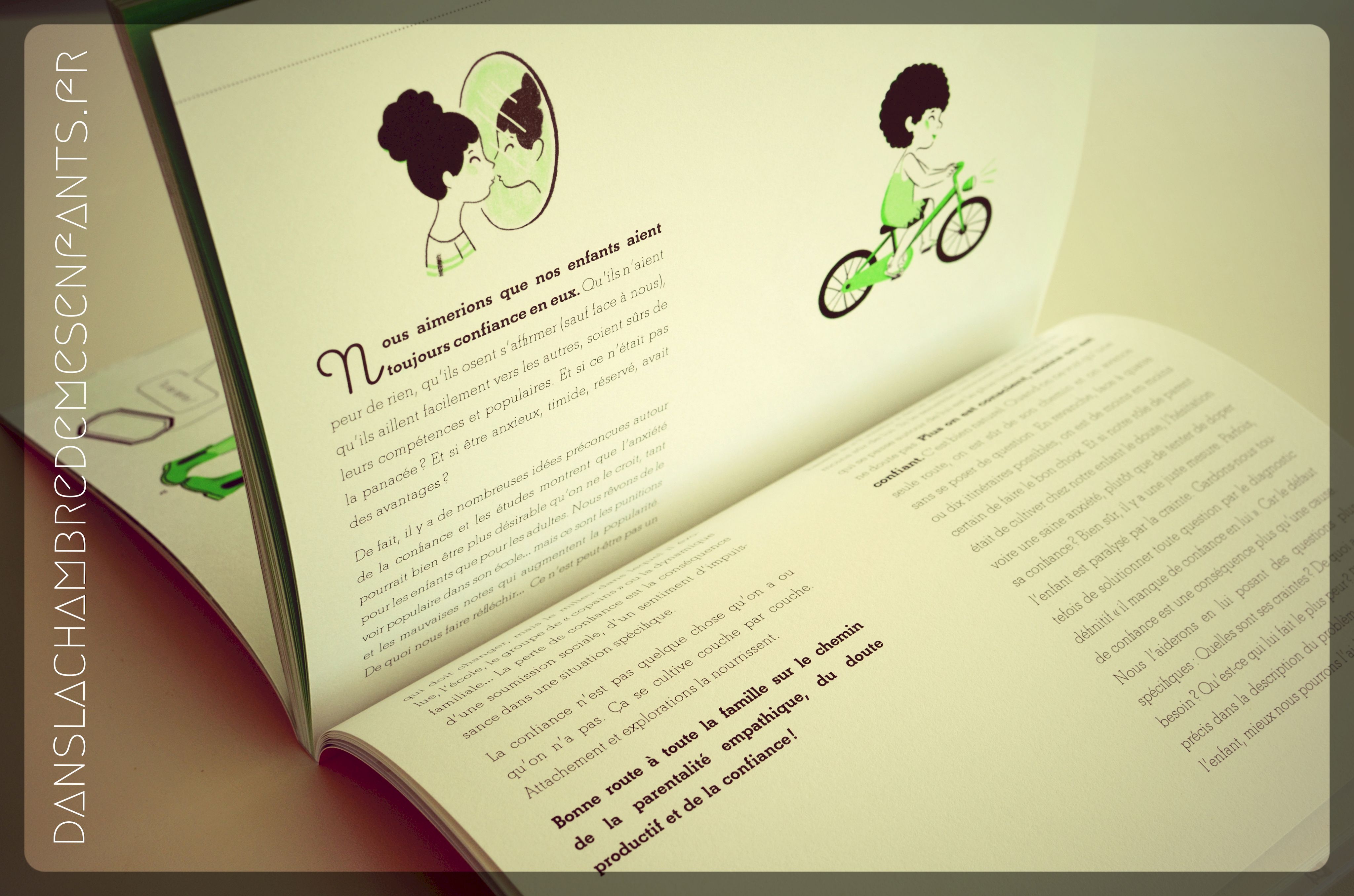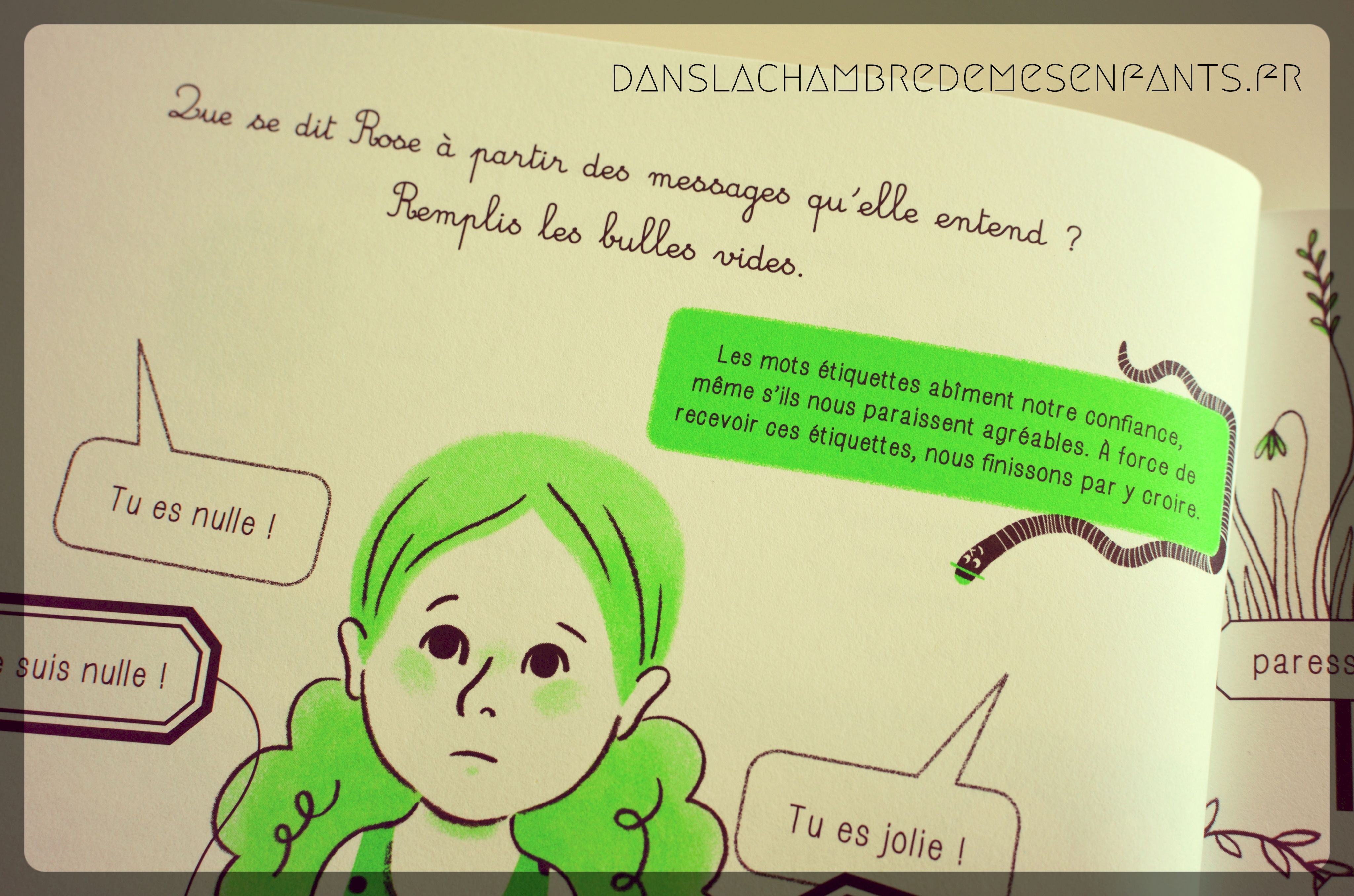 Les parents ne sont pas oubliés puisqu’un livret est à découper pour mieux comprendre la démarche. J’y ai relevé tout particulièrement une phrase qui résume bien l’utilité de ce cahier : « Le manque de confiance en soi est proportionnel à l’absence de pouvoir sur soi, sur sa vie. » ce qui n’est pas étranger aux enfants entre 5 et 10 ans, alors en période d’apprentissage y compris de soi (période entre la sortie de la maternelle à celle d’adolescence). D’autant plus que la confiance en soi induit l’aisance à s’exprimer et à développer ses compétences.