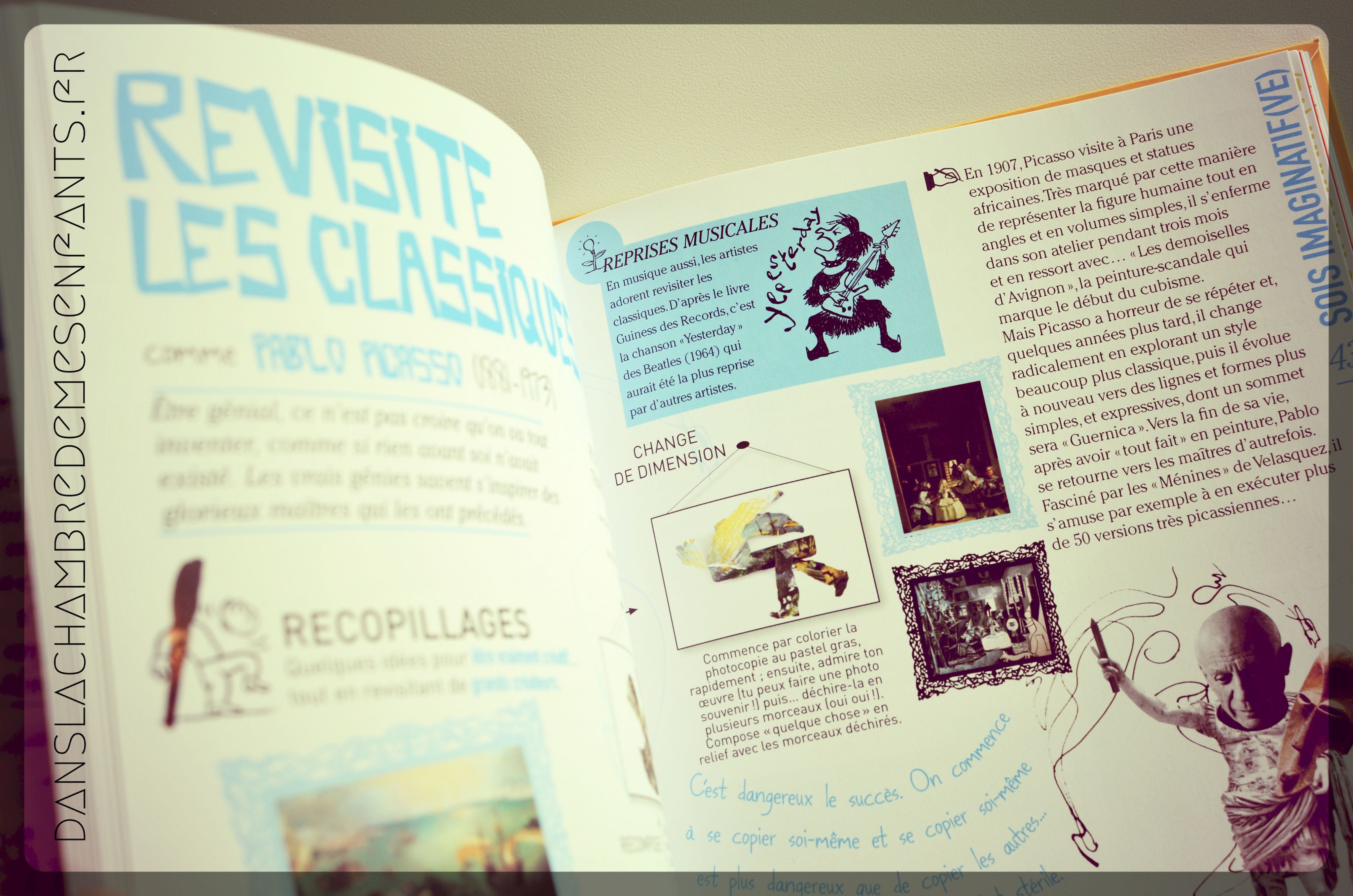La réflexion est aussi chose à exercer : tels de grands penseurs, les enfants peuvent faire germer leurs idées pour peu qu’on leur ouvre (le livre) les portes de la liberté de penser et de créer. Les mises en situation sont ici bien illustrées puisque la lecture se prolonge par des activités maison !