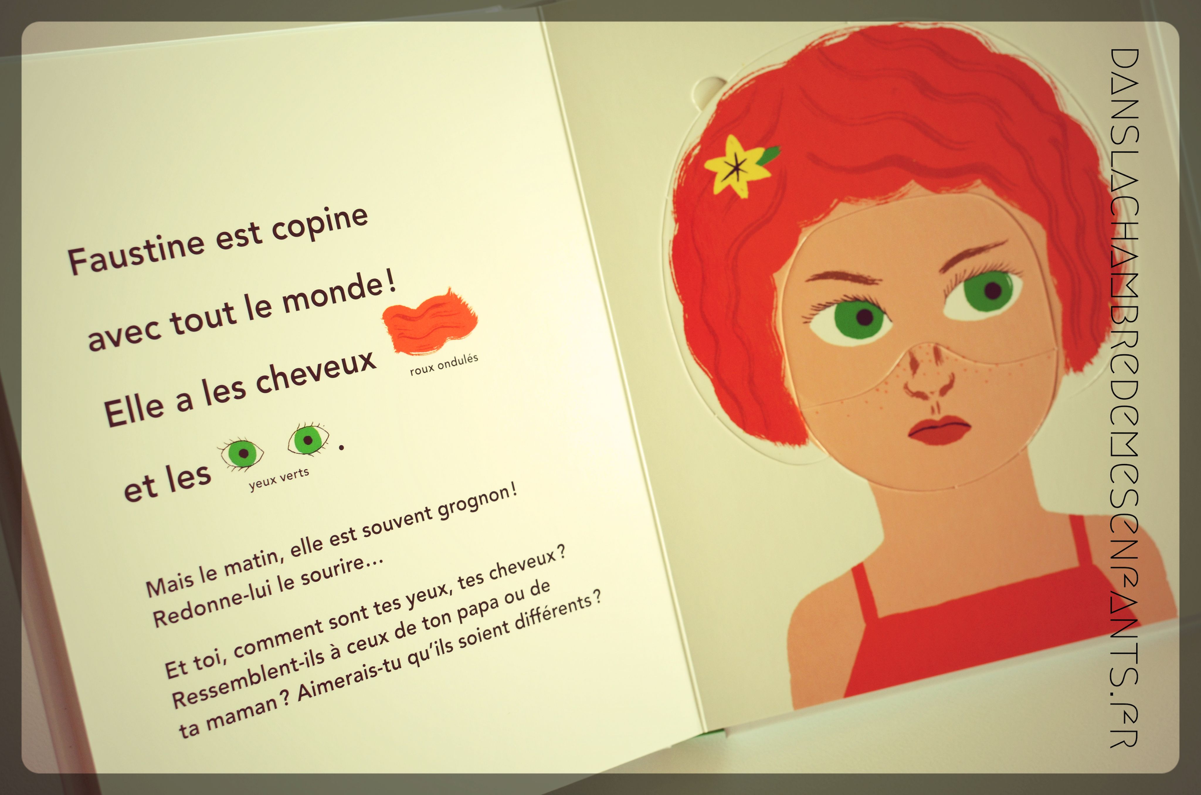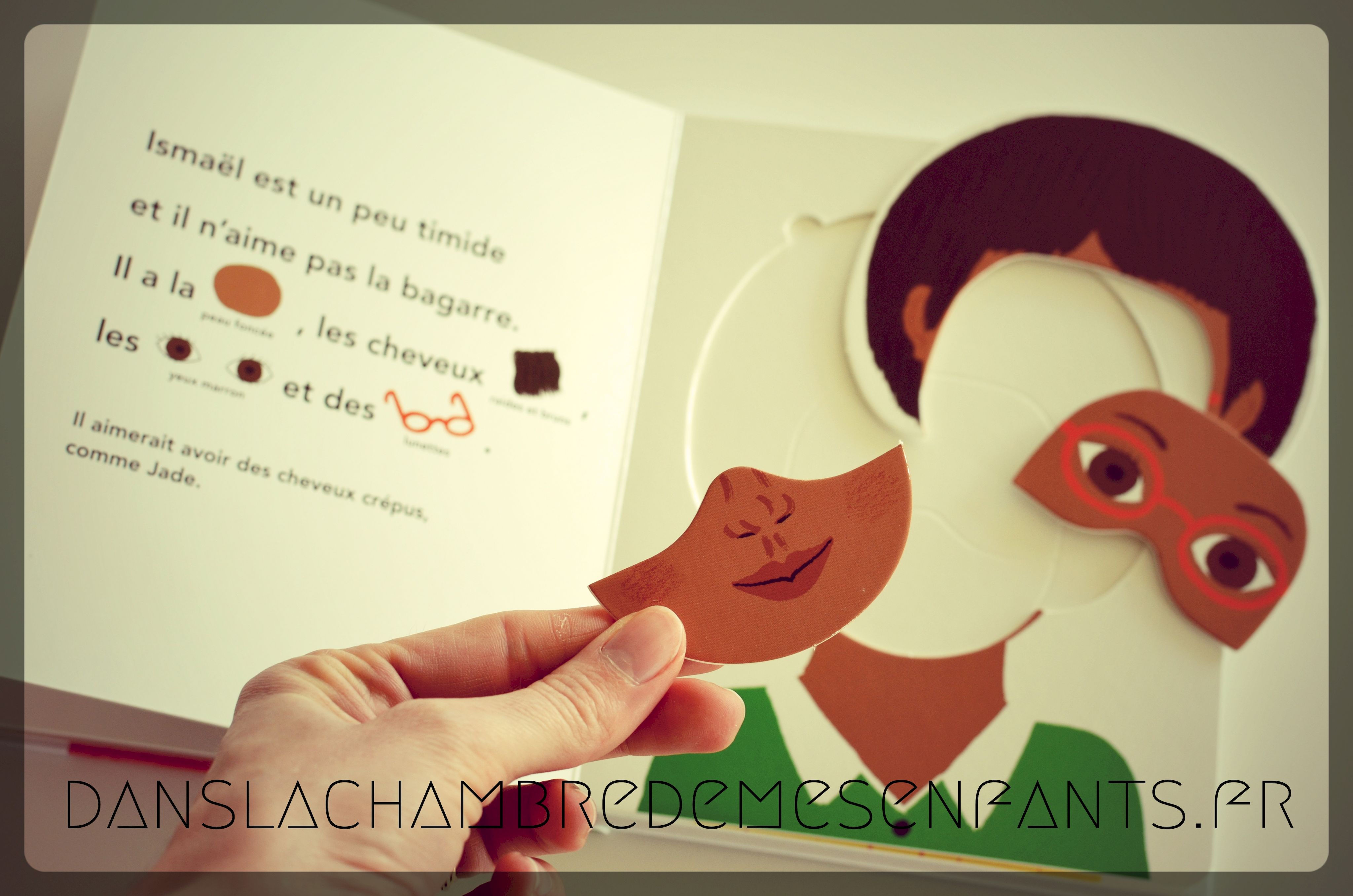 Chaque enfant est présenté en 2 phrases à travers des critères physiques illustrés dans le texte (ex : « Il a la peau claire, les cheveux raides |…] ») et des traits de caractère. Le portrait fait face à la description et il se compose de 3 pièces de grande taille (haut du visage, bas du visage, cheveux et oreilles), de mêmes dimensions pour les 5 personnages à découvrir.