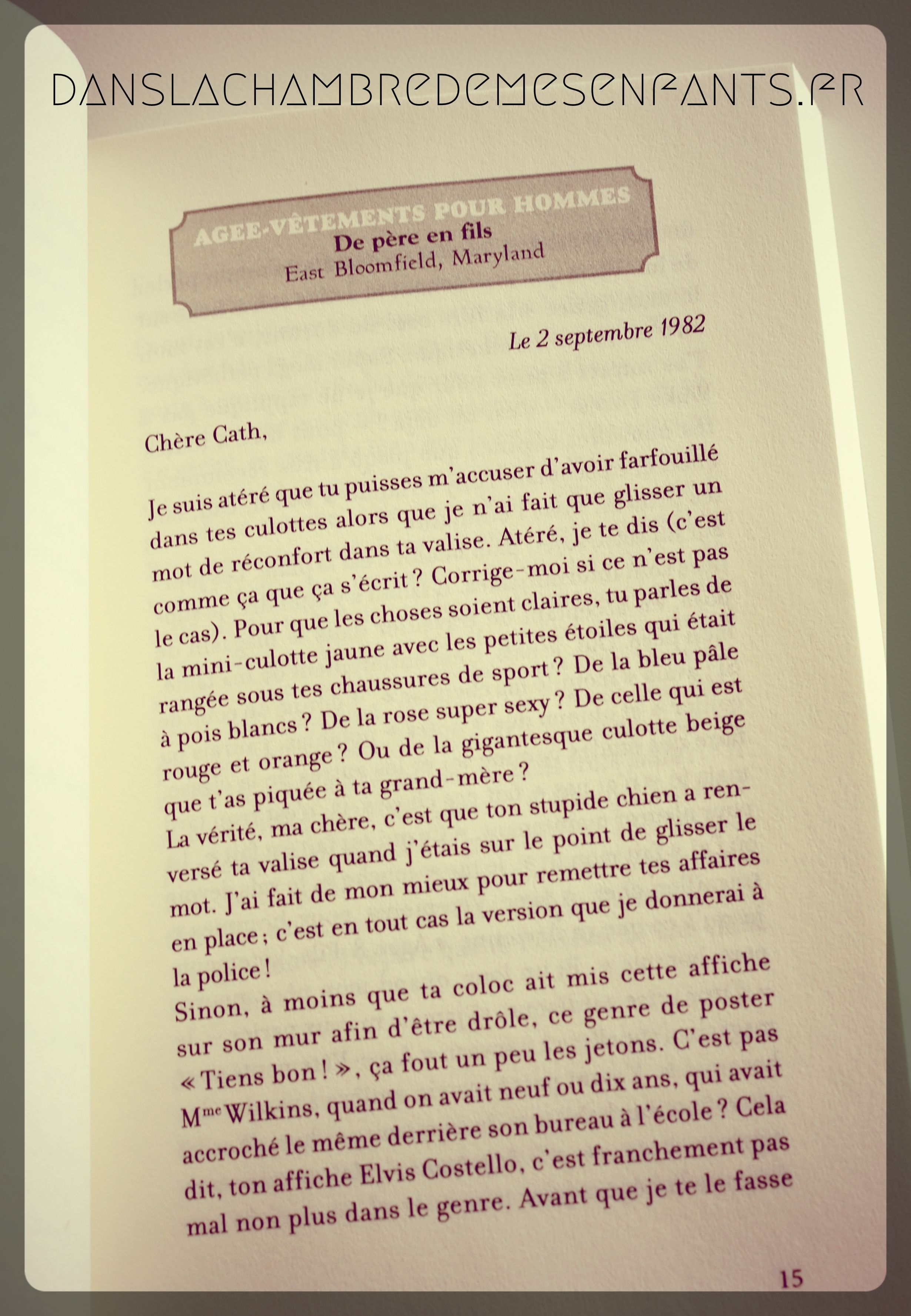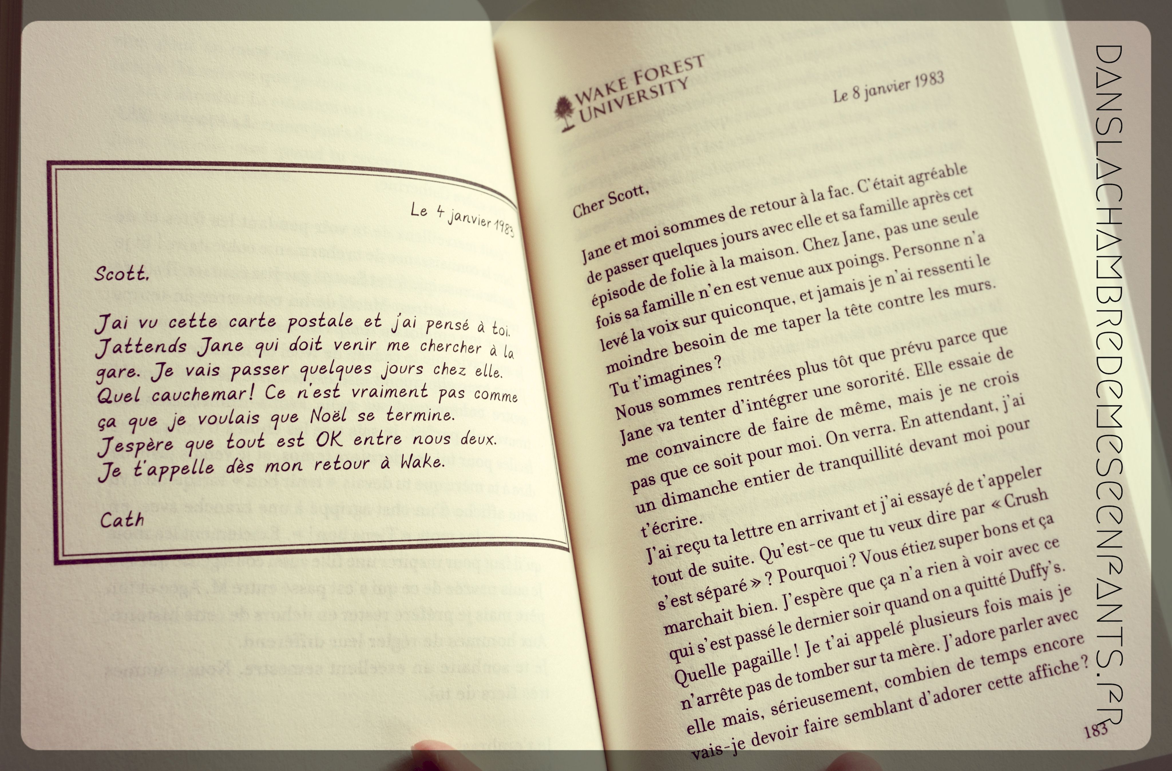 Ce roman essaie également de retranscrire une histoire à travers les écrits des personnages principaux : Cath et Scott sont des adolescents qui maintiennent le contact à distance par des échanges de lettres et de petits mots. Leur histoire évolue ainsi et c’est une forme assez personnelle pour mieux connaître les personnages, d’autant plus qu’elle a été construite par deux auteurs différents, également liés d’amitié. Pour cela, il faut se replacer en 1982, époque sans texto ni mail, et suivre la 1ère année à la faculté de Cath tandis que son ami est resté travaillé dans l’entreprise familiale.