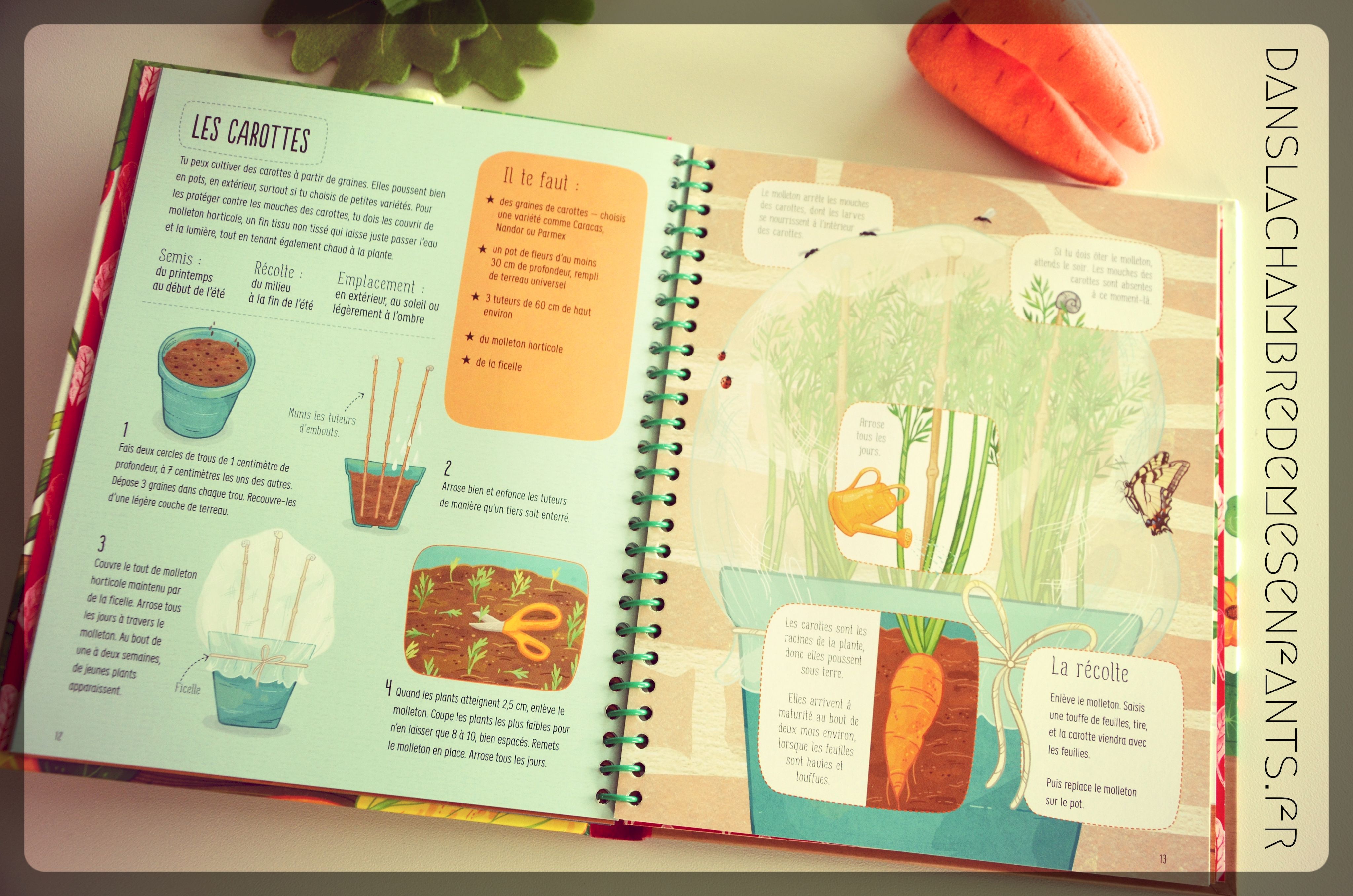 L’avis des enfants : Alex voulait justement faire un petit potager et il semble qu’il a trouvé là ce qu’il attendait pour y parvenir. Son père s’y est aussi intéressé et ils ont décidé d’acheter des pots (on n’est pas vraiment sûr d’entretenir un vrai potager pour l’instant) pour des carottes et quelques autres plants. Bon, le mauvais temps nous a dissuadés de partir à la jardinerie et de commencer (ce n’est pas écrit dans le livre mais le beau temps est primordial pour motiver les troupes !). J’ai donc bien envie de laisser les hommes de la maison s’y mettre, normalement, très prochainement, et je vous tiens au courant sur les réseaux sociaux (Instagram, Facebook et Twitter).