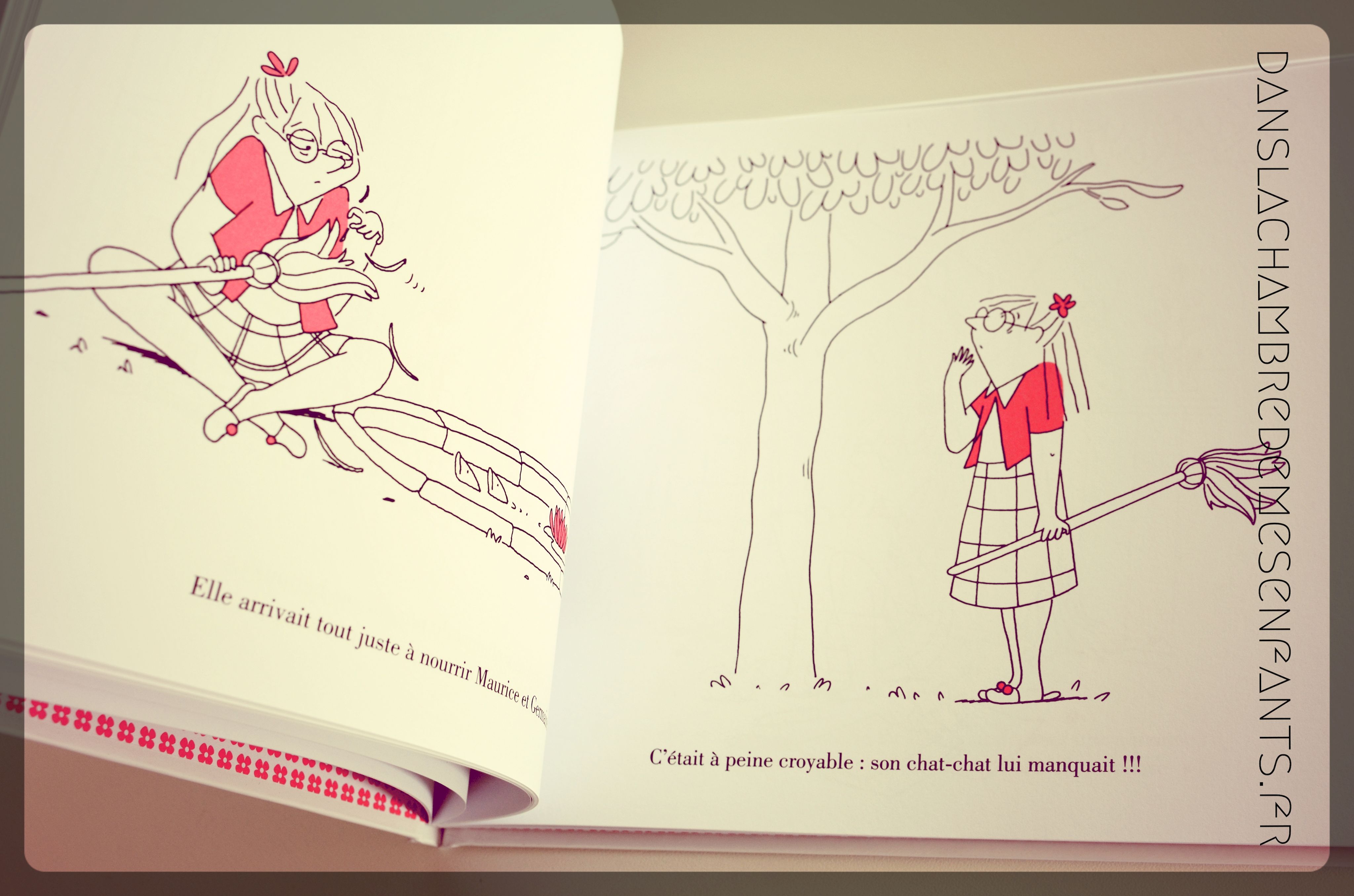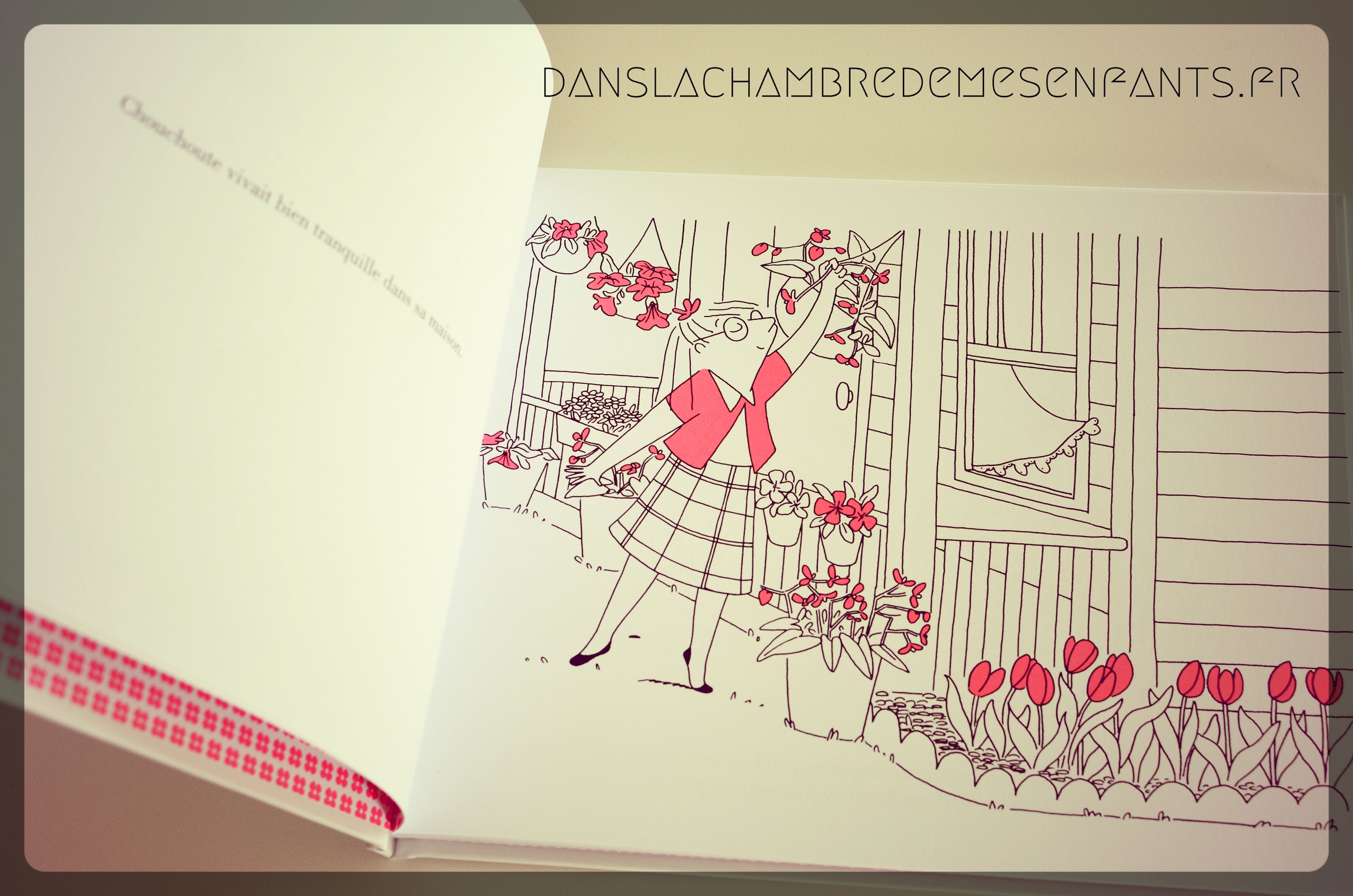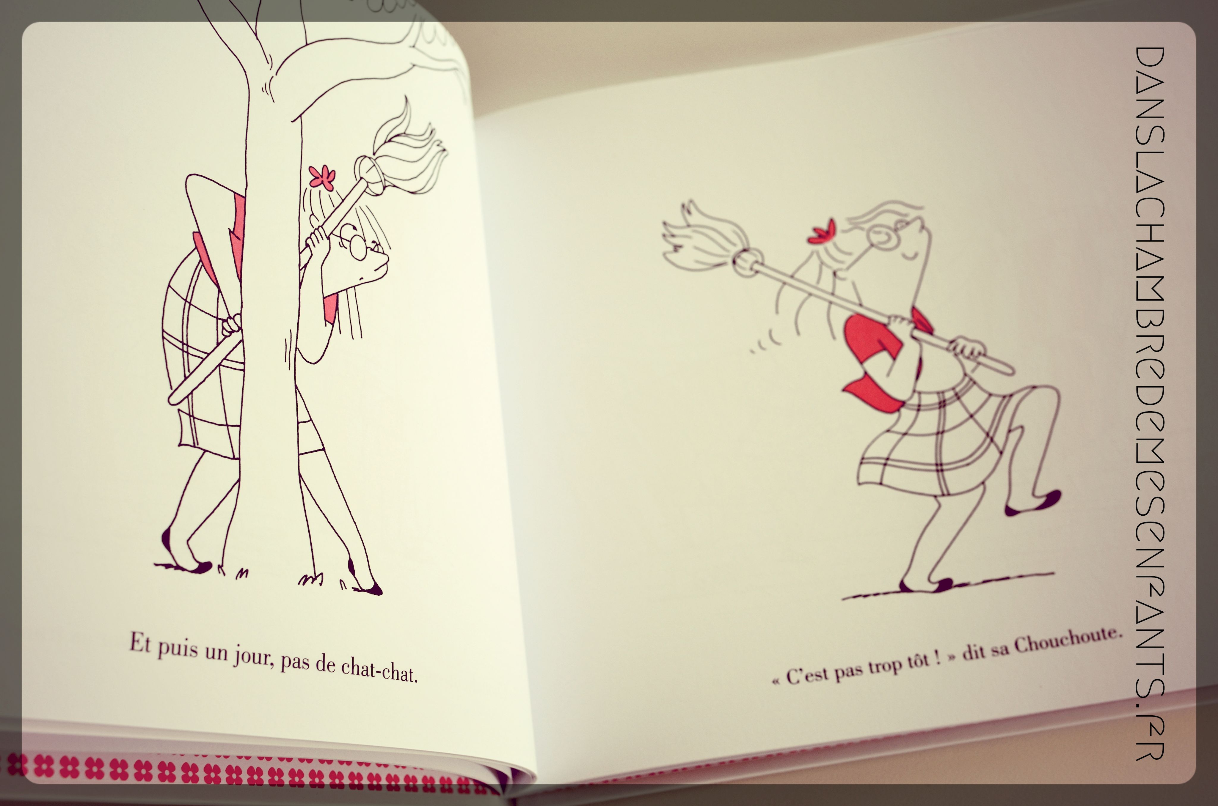 Ce livre annonce l’ouverture d’une fenêtre sur une histoire sur un ton frais et léger à travers des illustrations en noir et blanc aux touches rosées. Il s’agit de celle d’une jeune fille, Chouchoute, qui a une routine bien établie mais qui ne la rend pas très accueillante. Pourtant, un jour, un chat tombe dans son jardin et chamboule cet ordre. L’affaire se répète plusieurs fois à son grand désespoir. Lorsque le calme est enfin de retour, elle retrouve le sourire mais pas pour longtemps. Elle se rend compte que l’animal manque finalement à sa vie, « Alors, elle décida de s’installer sous l’arbre de son chat-chat avec une couverture et du chocolat chaud. Elle attendit un jour, deux jours, trois jours. […] ». Bien sûr, la fin est heureuse et avec une chute assez étonnante et amusante.