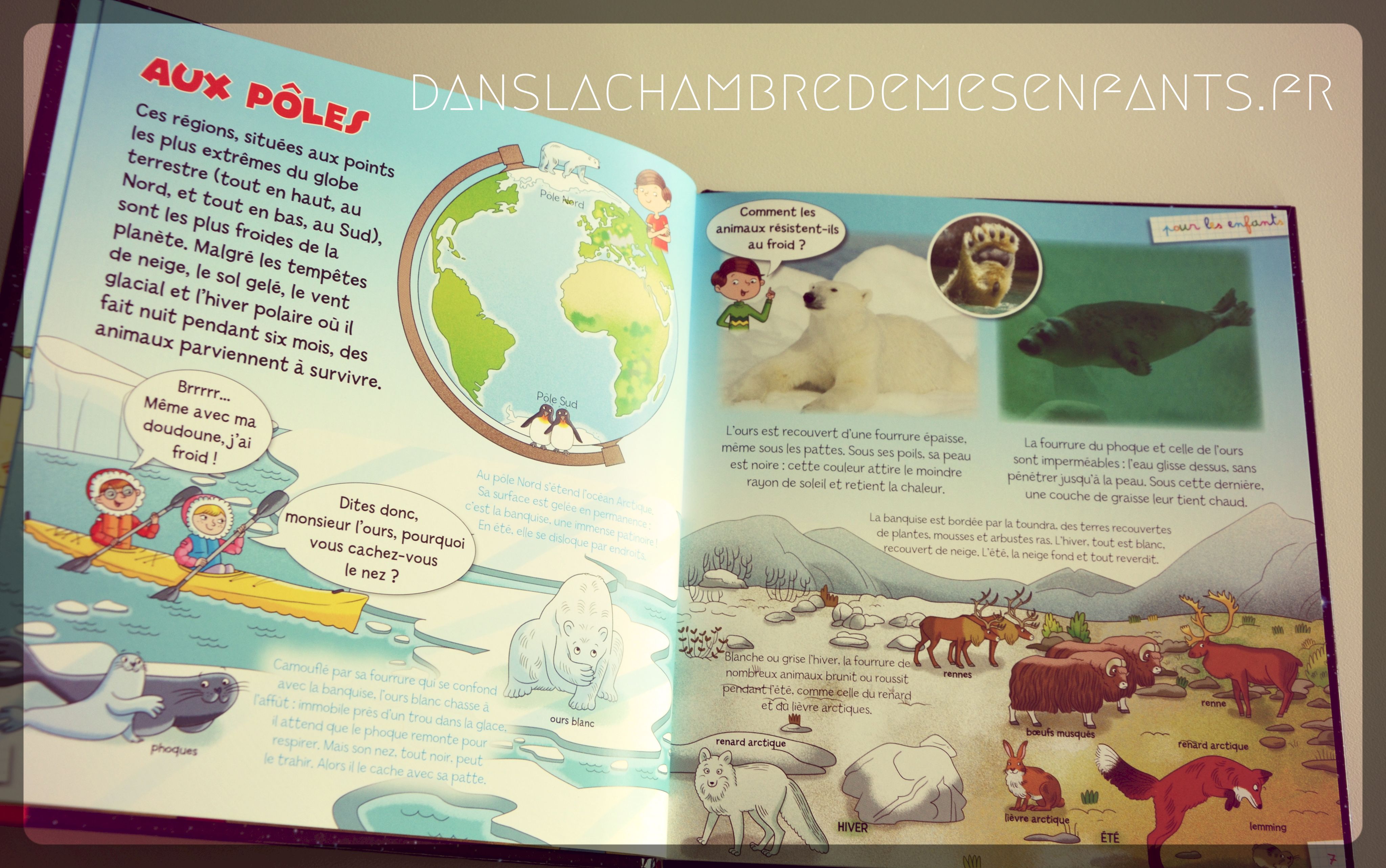 Le sujet est vaste et il est ici traité à partir des différents milieux de vie : aux pôles, dans le désert, dans la savane, dans la jungle, en forêt, dans la prairie… C’est un choix intéressant car cela permet aux jeunes enfants de comprendre le lien entre les espèces et la nature. On découvre ainsi leurs modes de vie, leurs espèces, leurs particularités, etc. Cette présentation permet également d’avoir une vue sur une grande variété d’animaux, notamment les marins ou, plus commun, ceux du jardin jusqu’aux insectes.