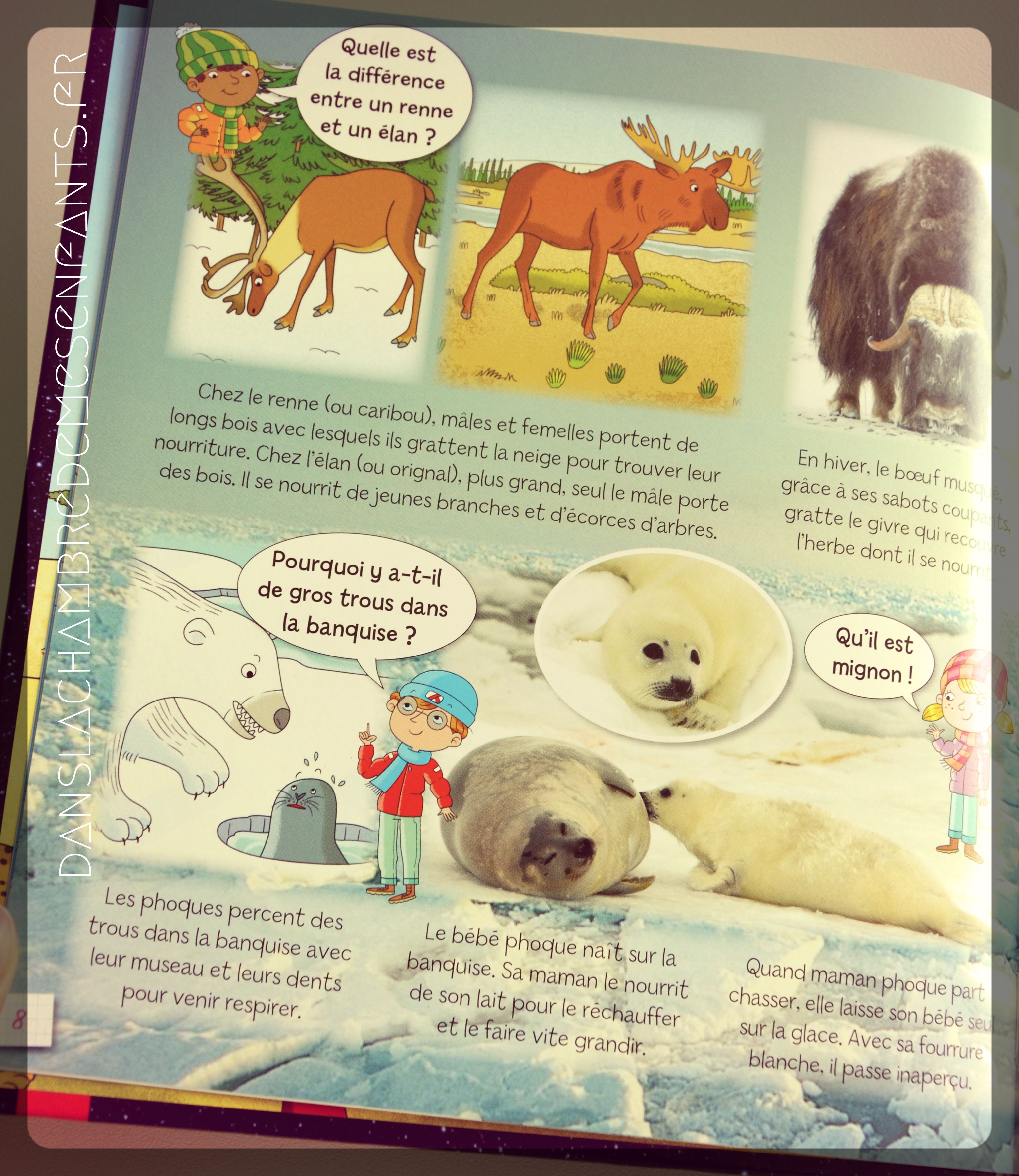 J’ai tendance à trouver cette présentation un peu trop encombrée mais, pour ce titre, je reconnais qu’elle aide la compréhension avec en fond, par exemple, des images de leurs cadres de vie. Je ne suis pas sûre que l’on arrive au bout de la liste de questions des enfants mais le défi est relevé et l’ouvrage est bien réalisé et agréable.