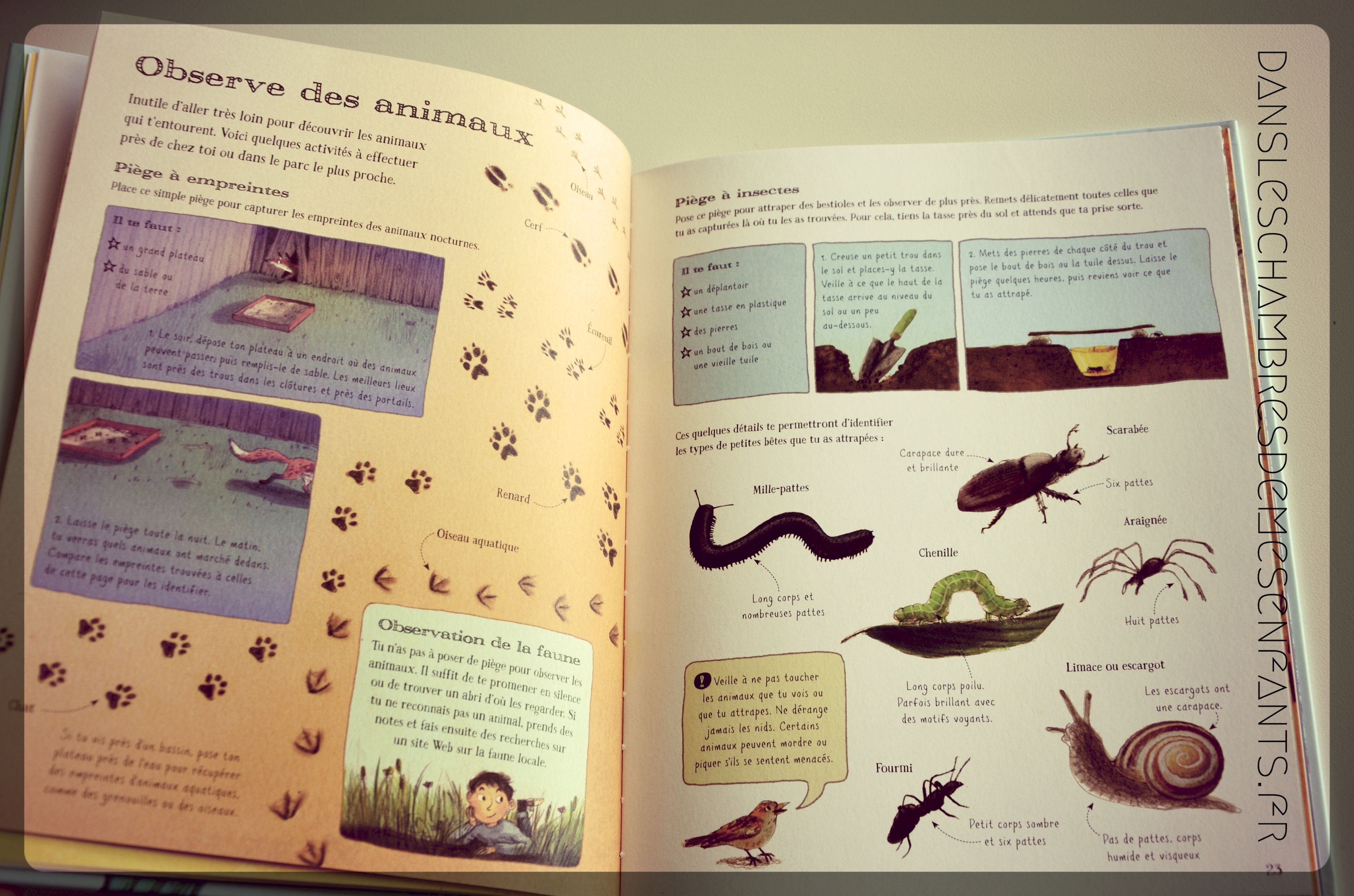 En effet, cet ouvrage nous fait sortir de notre tanière pour (re)découvrir la nature à travers différentes activités. Il propose d’observer (feuillage, marée…), de découvrir et d’identifier la faune et la flore, de réaliser des activités (pêche au crabe, construction d’un barrage, dessin d’une carte…) et des jeux (fléchettes sur le sable, parcours d’obstacles…) :