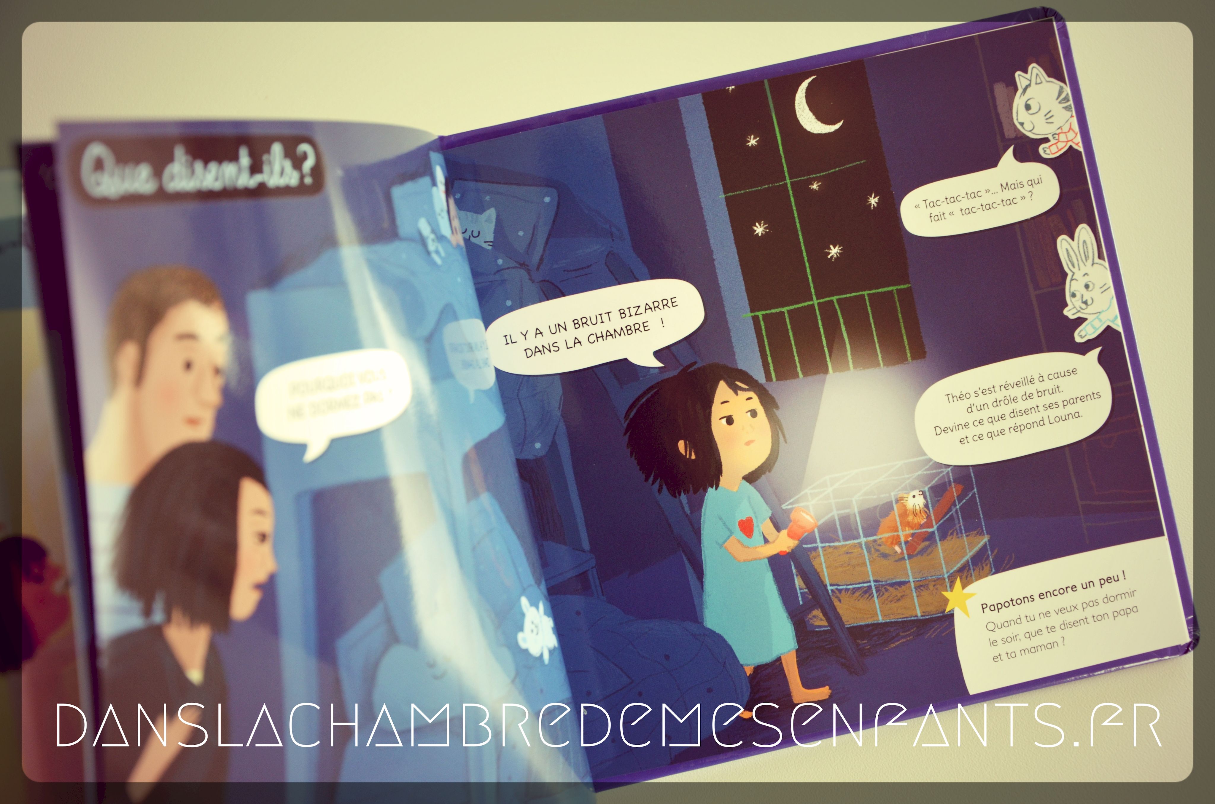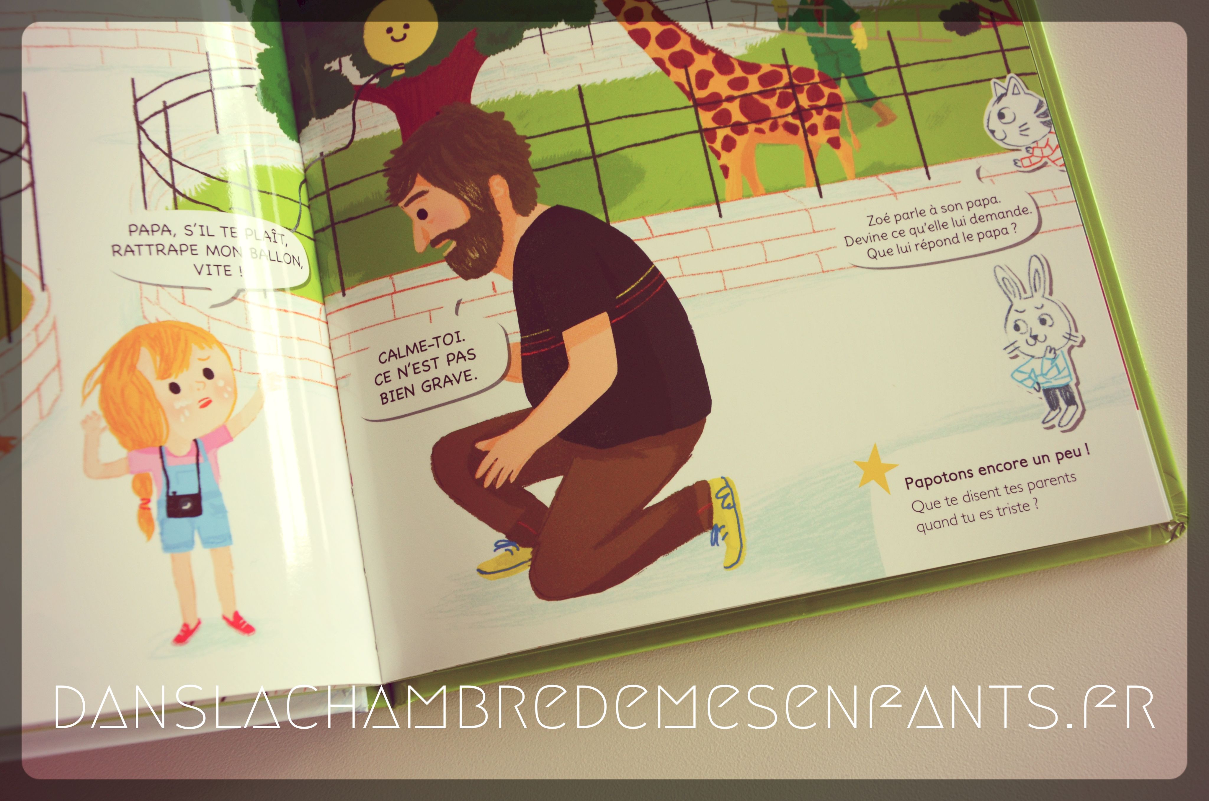 C’est de nouveau l’occasion d’observer des lieux connus et qui sont agréables aux enfants (zoo, chambre d’enfant) ainsi que des scènes où leur sensibilité est exprimée (joie, peine…). Ces courtes histoires sont agréables et les illustrations y sont pour beaucoup, surtout en l’absence de texte (à l’exception du dialogue de la scène où l’émotion s’exprime et des commentaires de Papoti et Papota). Je remarque qu’il est un peu difficile de faire comprendre seul à l’enfant que Louna, la petite fille du 2ème livre, est gênée par un bruit mais celui sur la visite du zoo est plus accessible et, par conséquent, plus intéressant sur ce point.