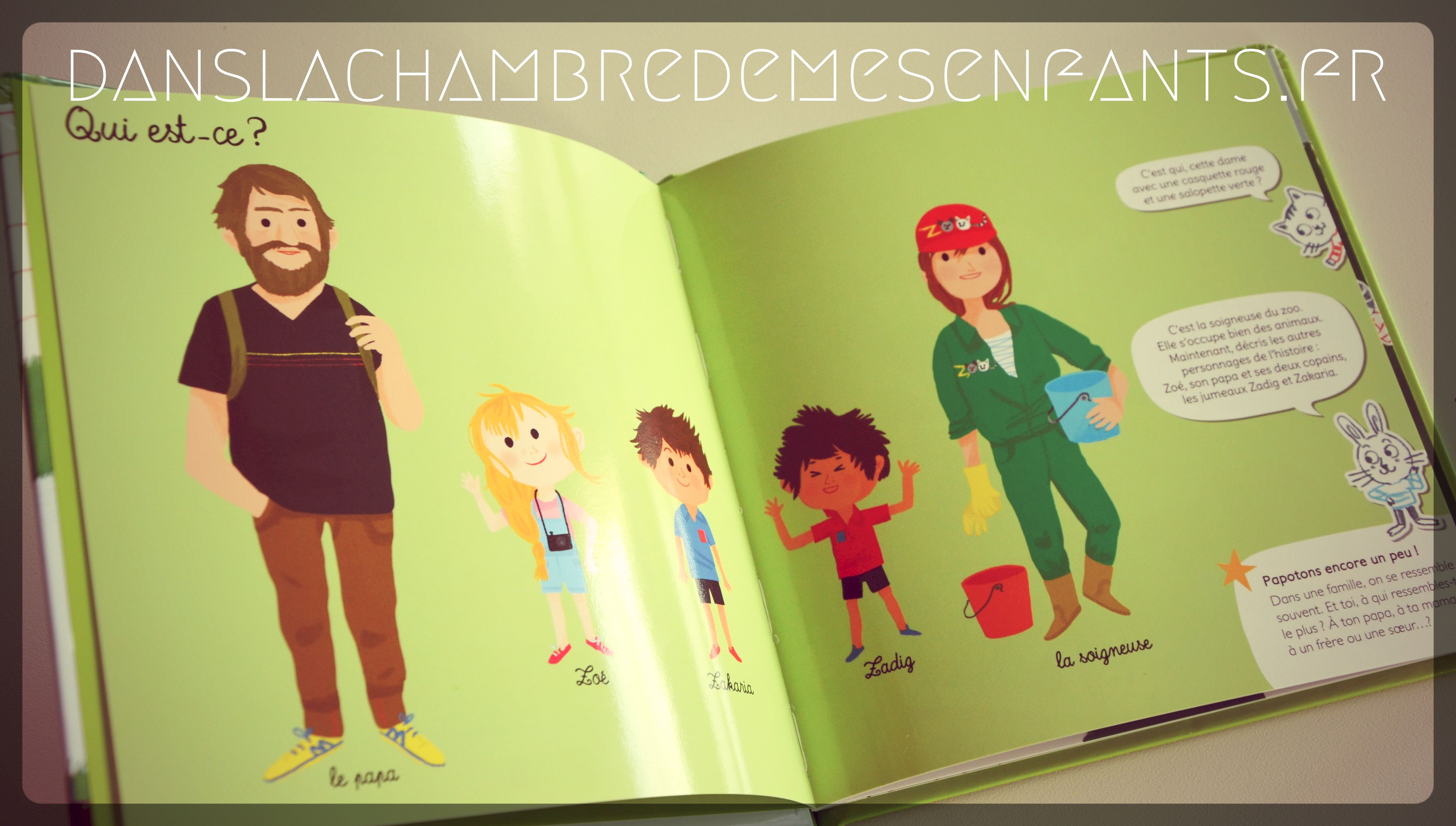 Dans le 1er titre, Zoé, Zakaria et Zadig vont au zoo avec leur père. La visite se déroulent en 7 temps : « Qu’est-ce que c’est ? » « Où sont-ils ? » « Que font-ils ? »… et ils y rencontrent une soigneuse qui récupère le ballon bloqué dans un arbre, mettant fin à la peine de Zoé.