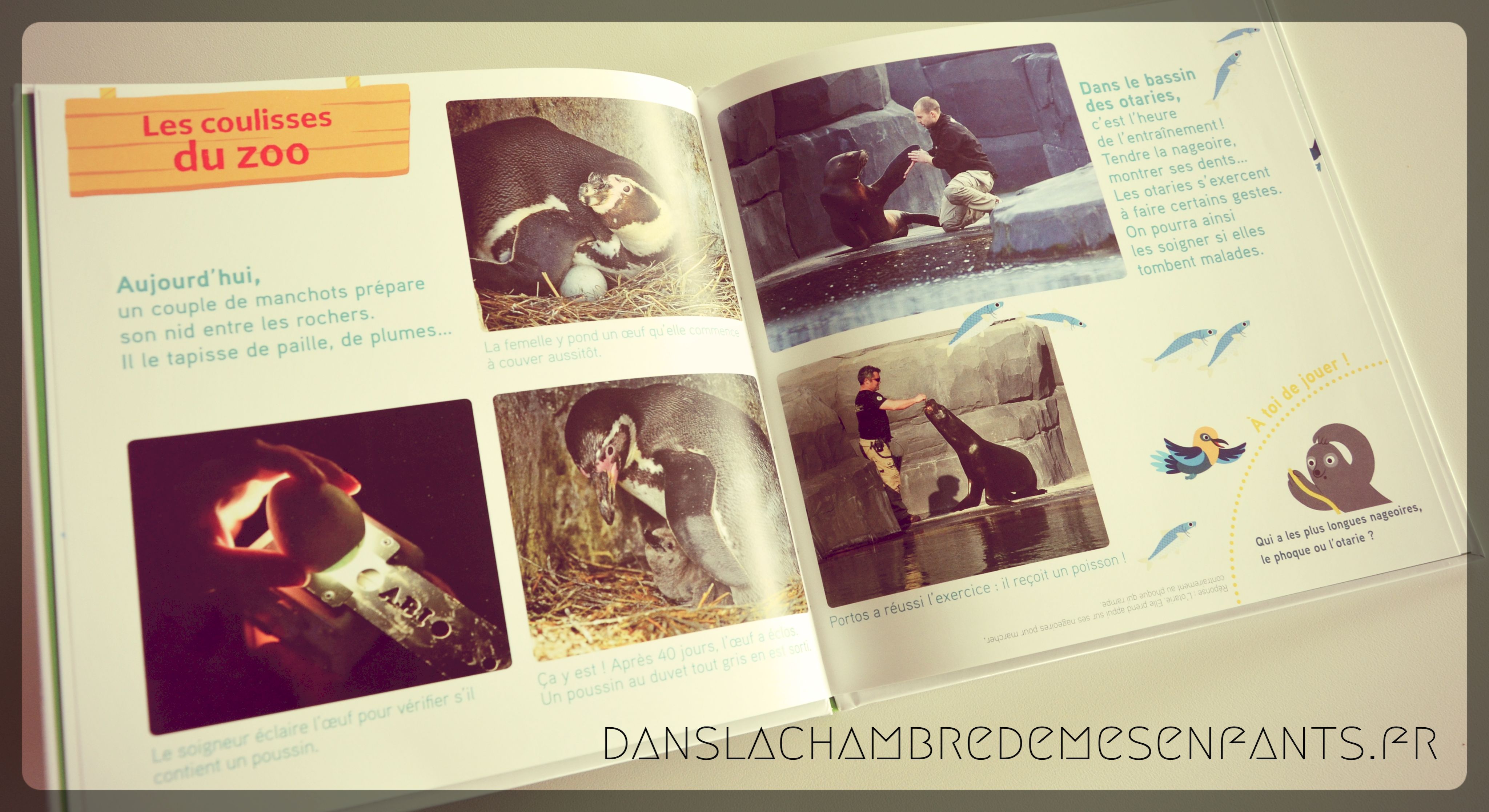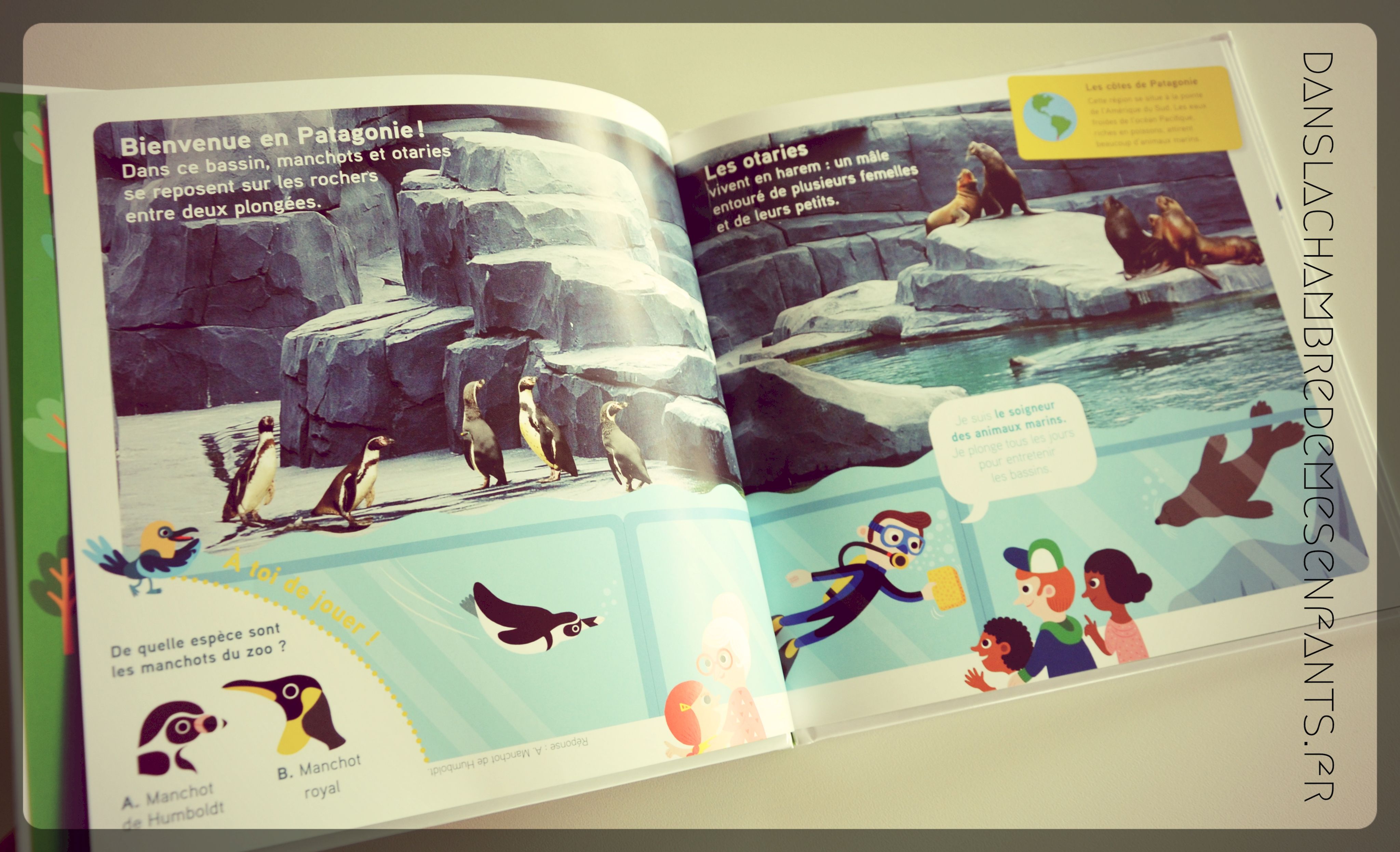 Voici une nouvelle immersion au zoo avec cet ouvrage qui nous ouvre les portes du Parc Zoologique de Paris. Pour intéresser les enfants à partir de 3 ans, ce petit documentaire met en avant de grandes photos et des dessins accompagnés de quelques commentaires, parfois sous encadrés. Un bref quiz « A toi de jouer ! » anime régulièrement la lecture en coin de page (ex : De quelle espèce sont les manchots du zoo ? A – Manchot de Humboldt B – Manchot royal).