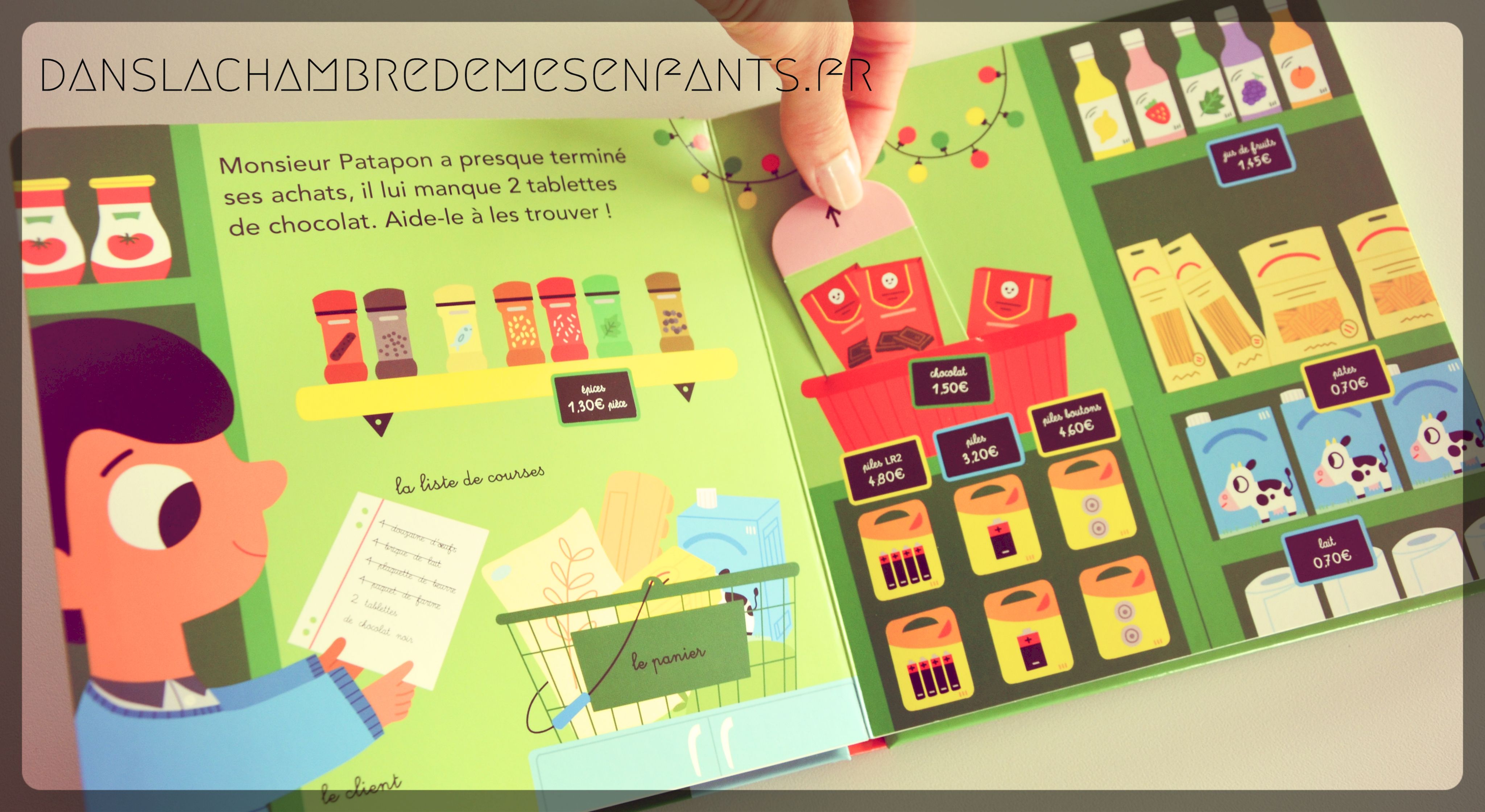 Il est accessible dès 2,5 ans pour découvrir les étalages, le remplissage du panier de Mr Patapon, le paiement des courses avec l’ouverture de la caisse et le compte réalisé, la pesée des fruits et légumes… Pour apporter des précisions supplémentaires à ce premier documentaire, les illustrations sont légendés par endroits (ex : la balance, la liste des courses…).