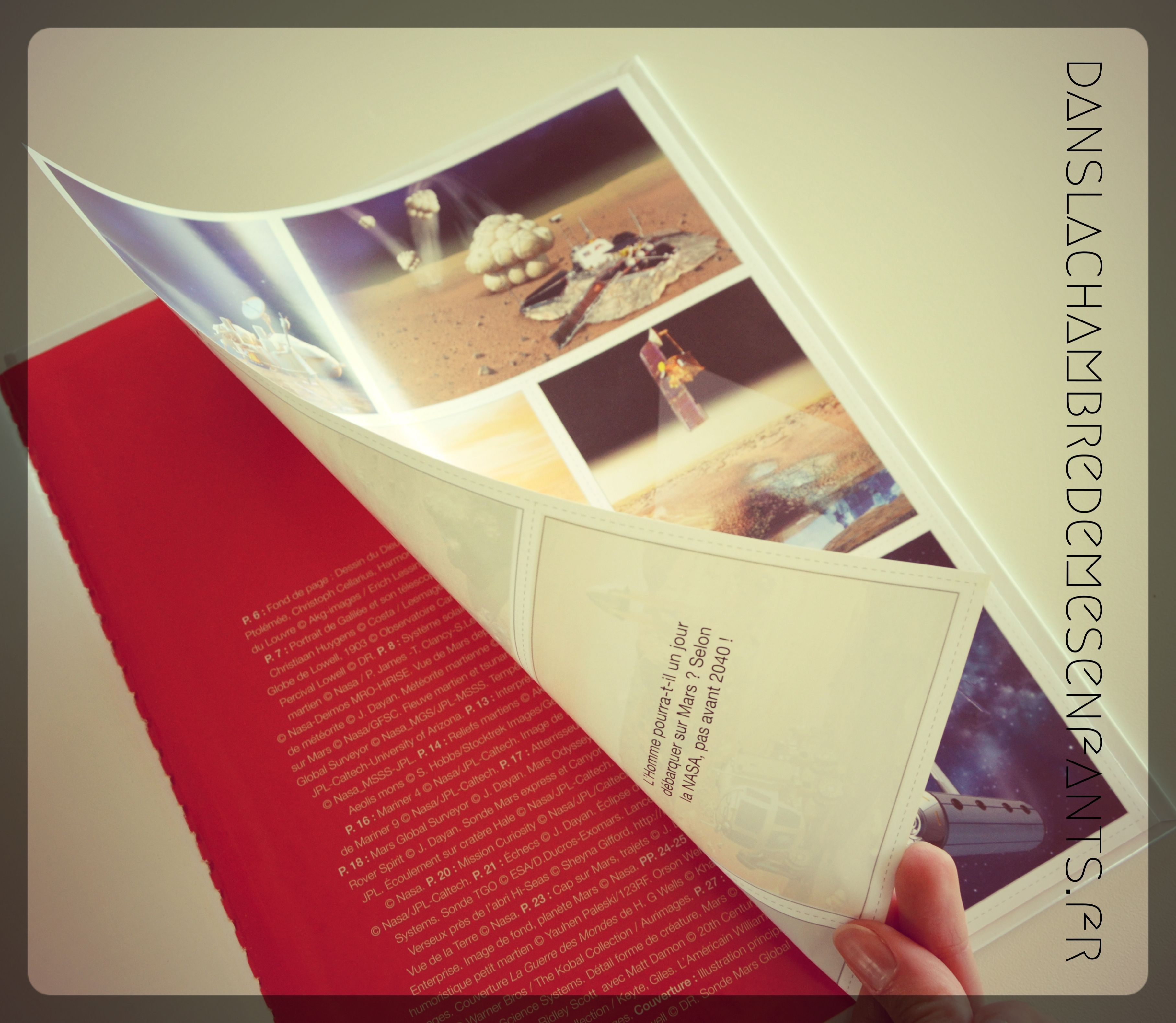Cette fois-ci les posters sont remplacés par 12 fiches à découper sur sa référence dans la mythologie grecque (Arès), le détail de sa surface (bombardement de météorites), sa position dans le système solaire… Je me suis aussi plongée dans cette lecture et j’ai été prise par le sujet bien traité, sous des angles diversifié notamment à travers la fiction, faisant référence à La guerre des mondes et la mise en scène d’Orson Welles en 1938.