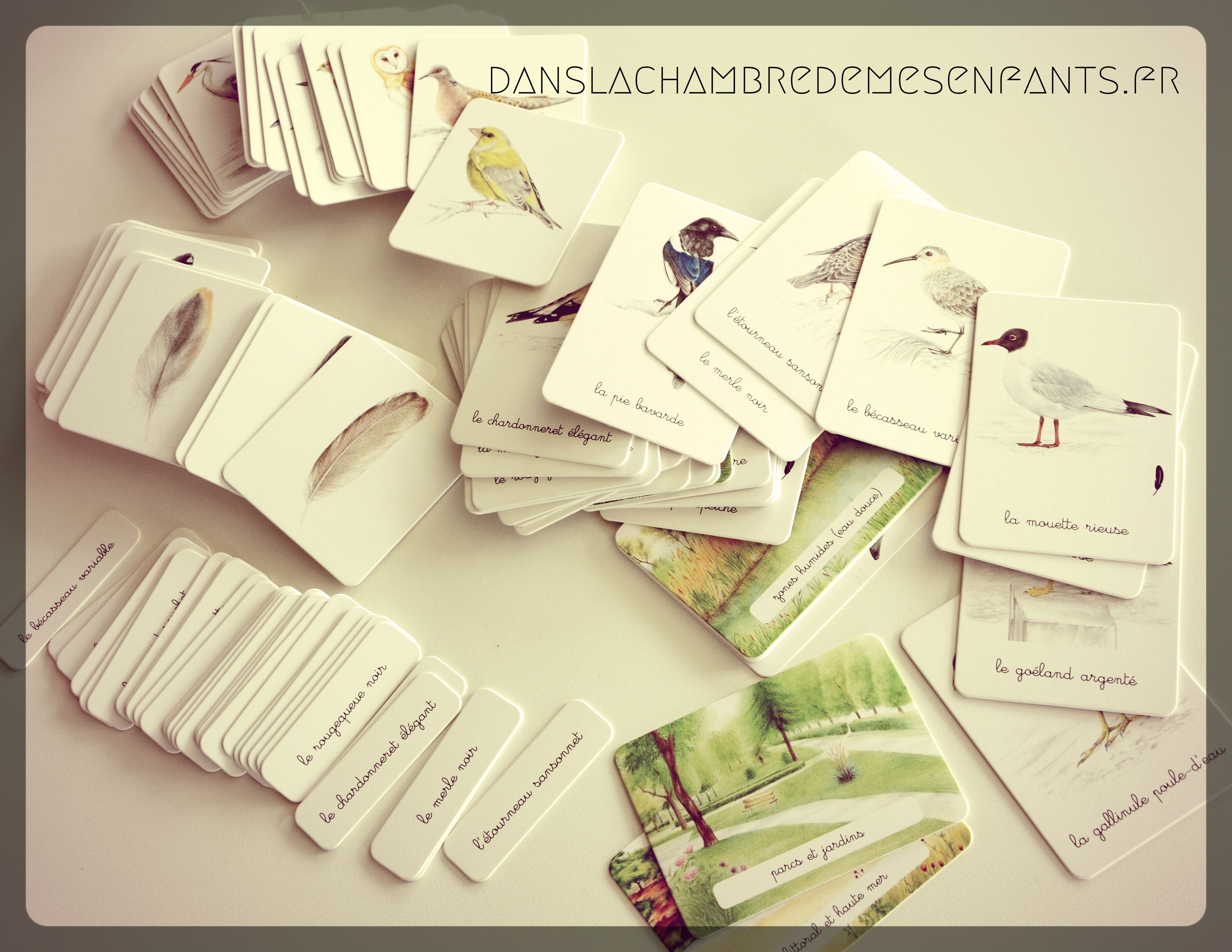 - 30 cartes illustrées d’oiseaux et légendées, avec dessin de leur milieu de vie au verso,