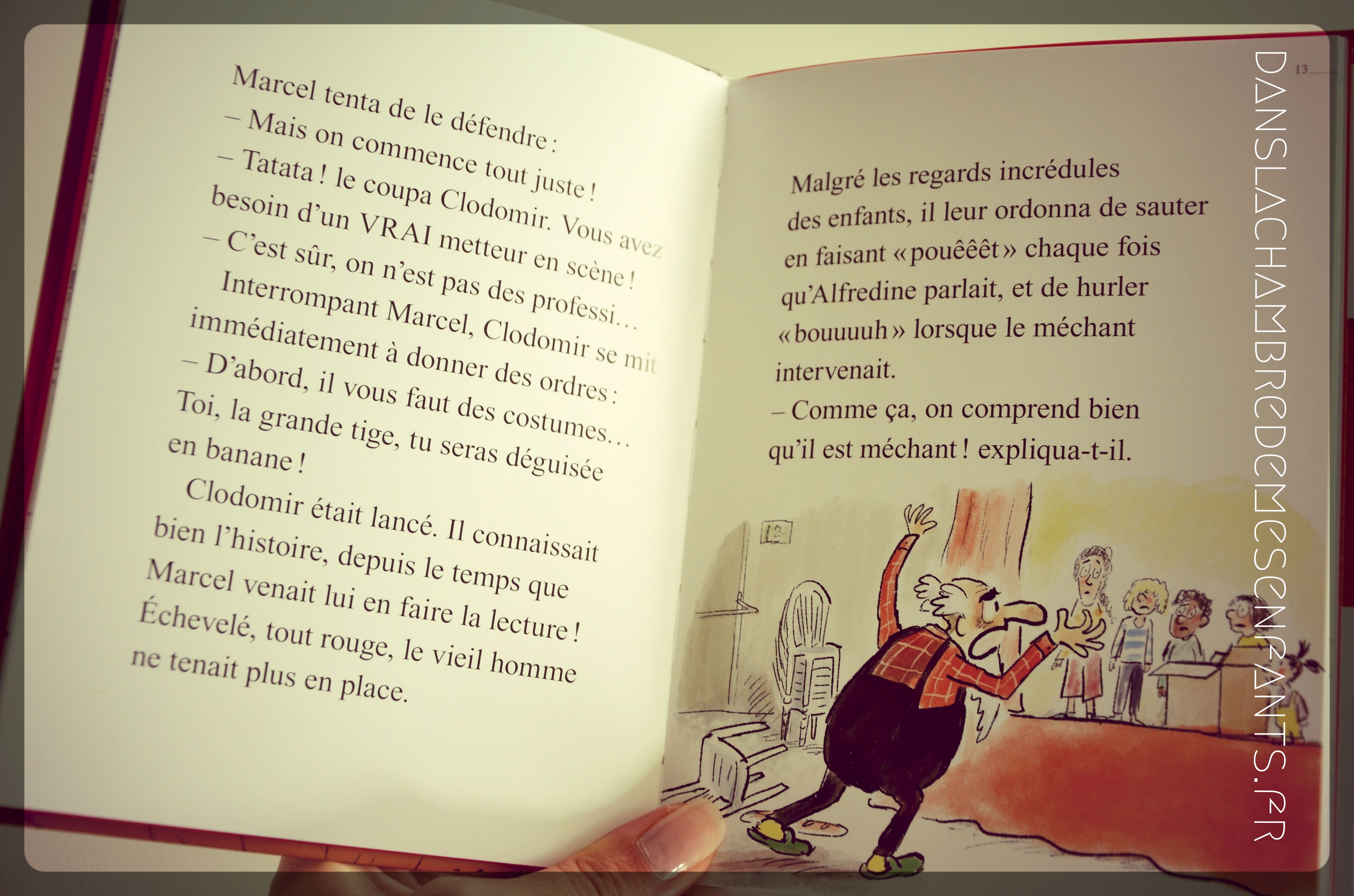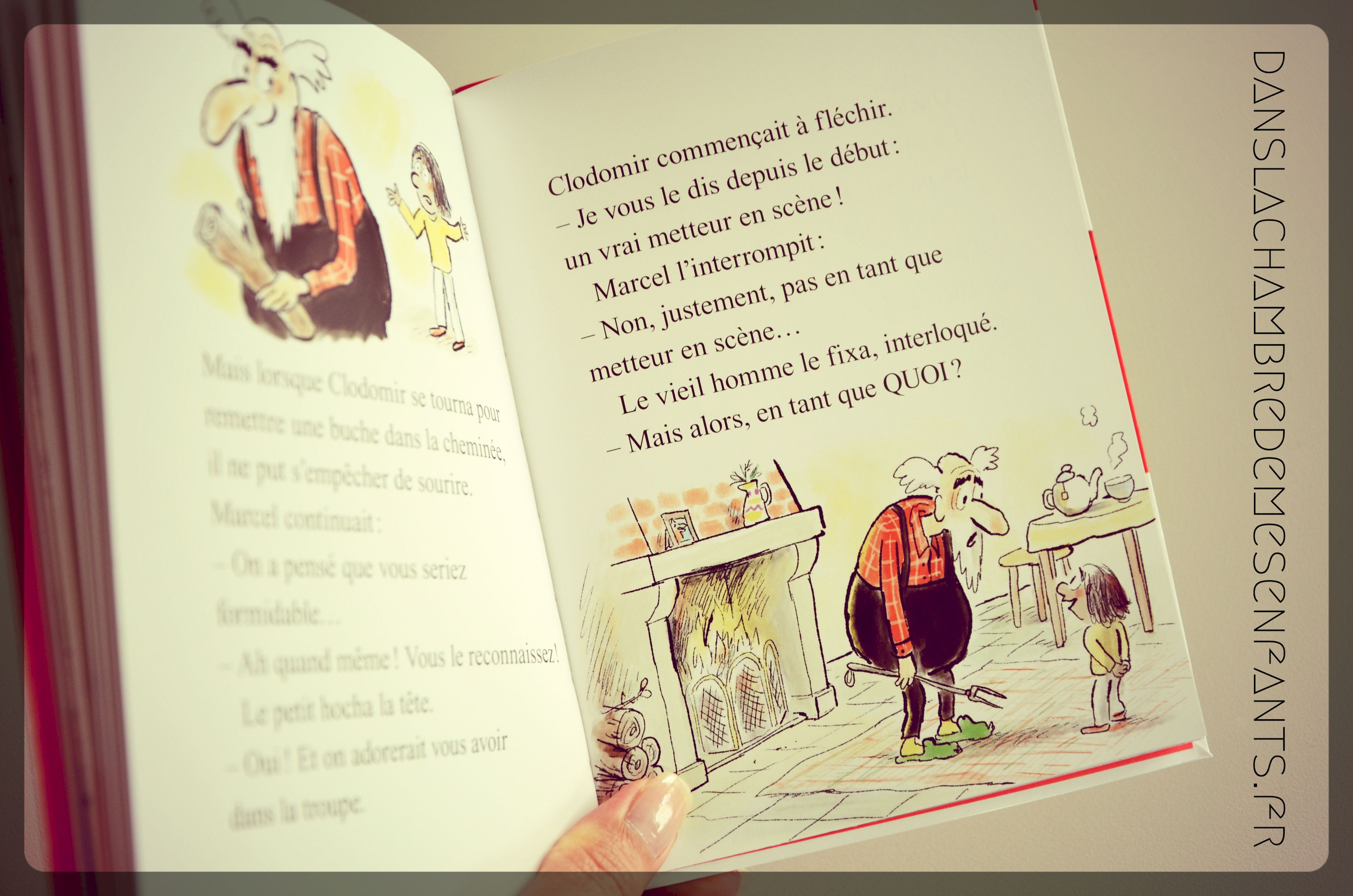 Je ne suis pas personnellement fan du style des illustrations mais j’avoue qu’il se marie bien avec l’histoire. Clodomir est un vieux bonhomme grincheux qui, un peu par hasard, se retrouve aux répétitions d’une pièce du club de théâtre. En fait, c’est le petit Marcel, son voisin, qui a cru bon de l’inviter mais Clodomir râle, critique et revoit la mise en scène. Les enfants ont une idée pour l’accepter comme il est sans bousculer la petite troupe.