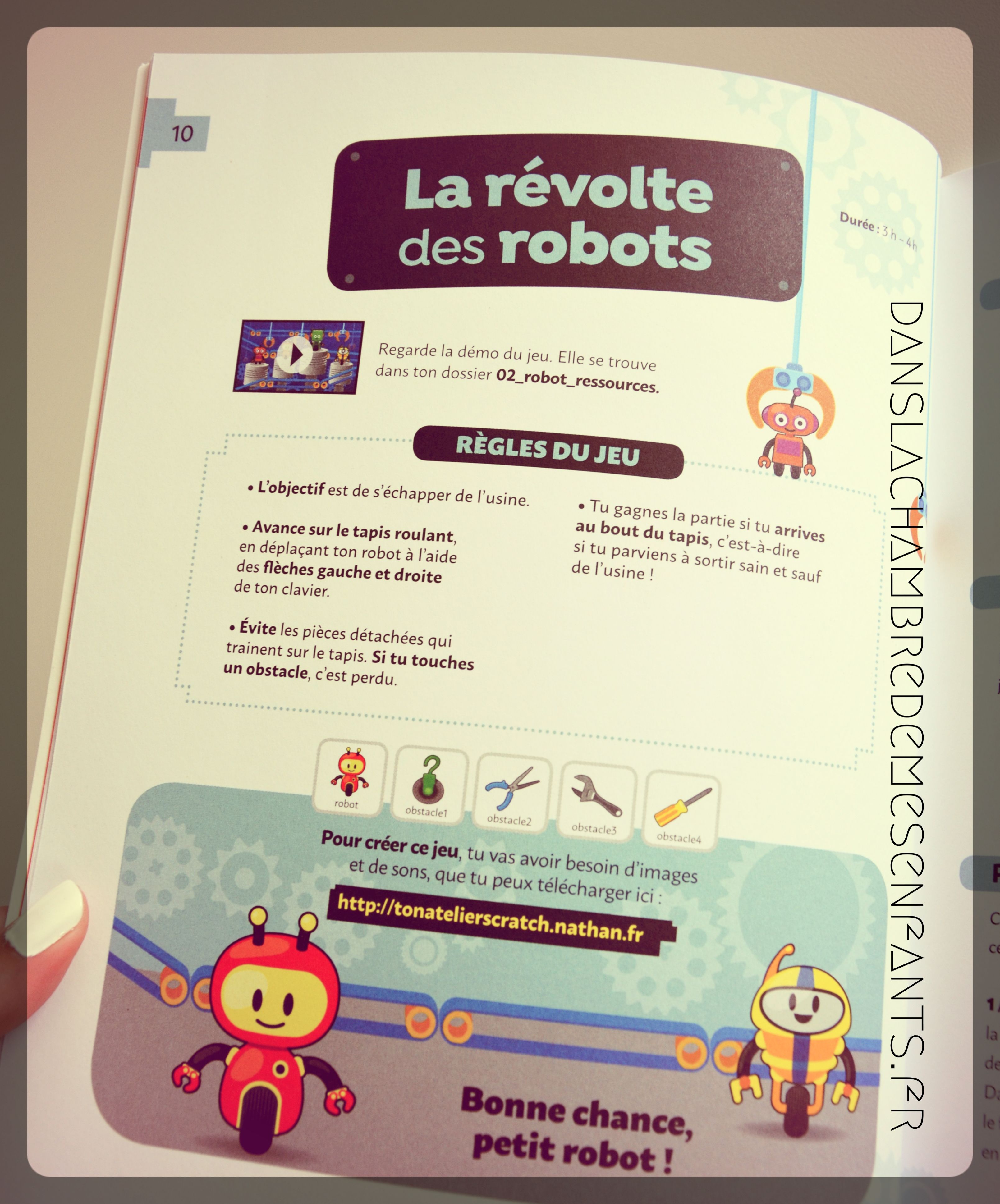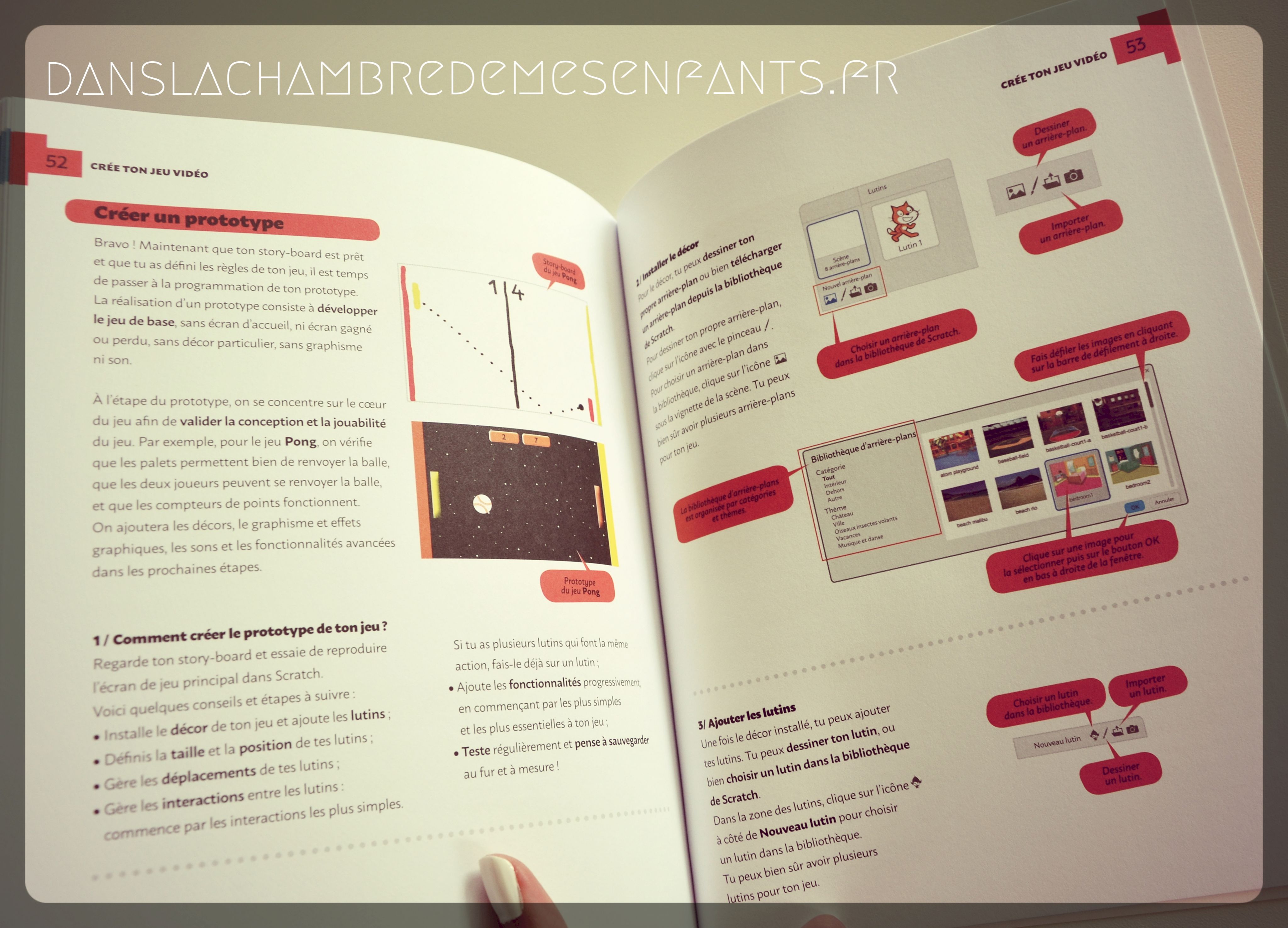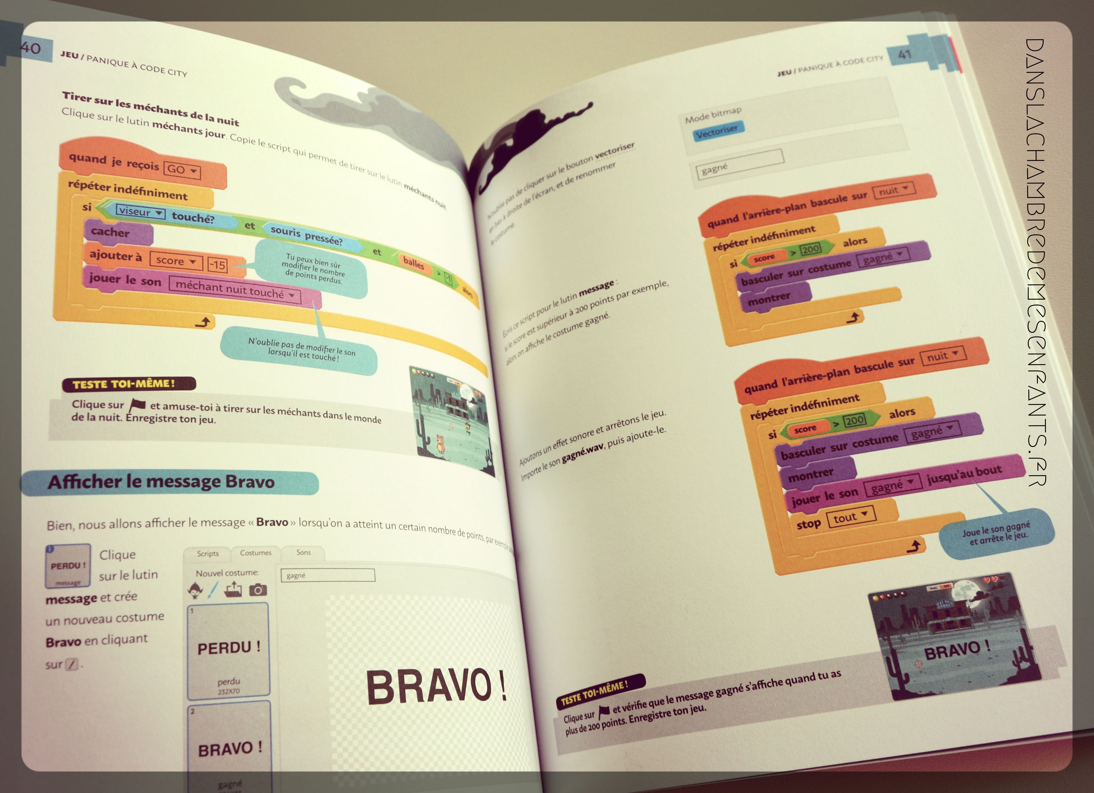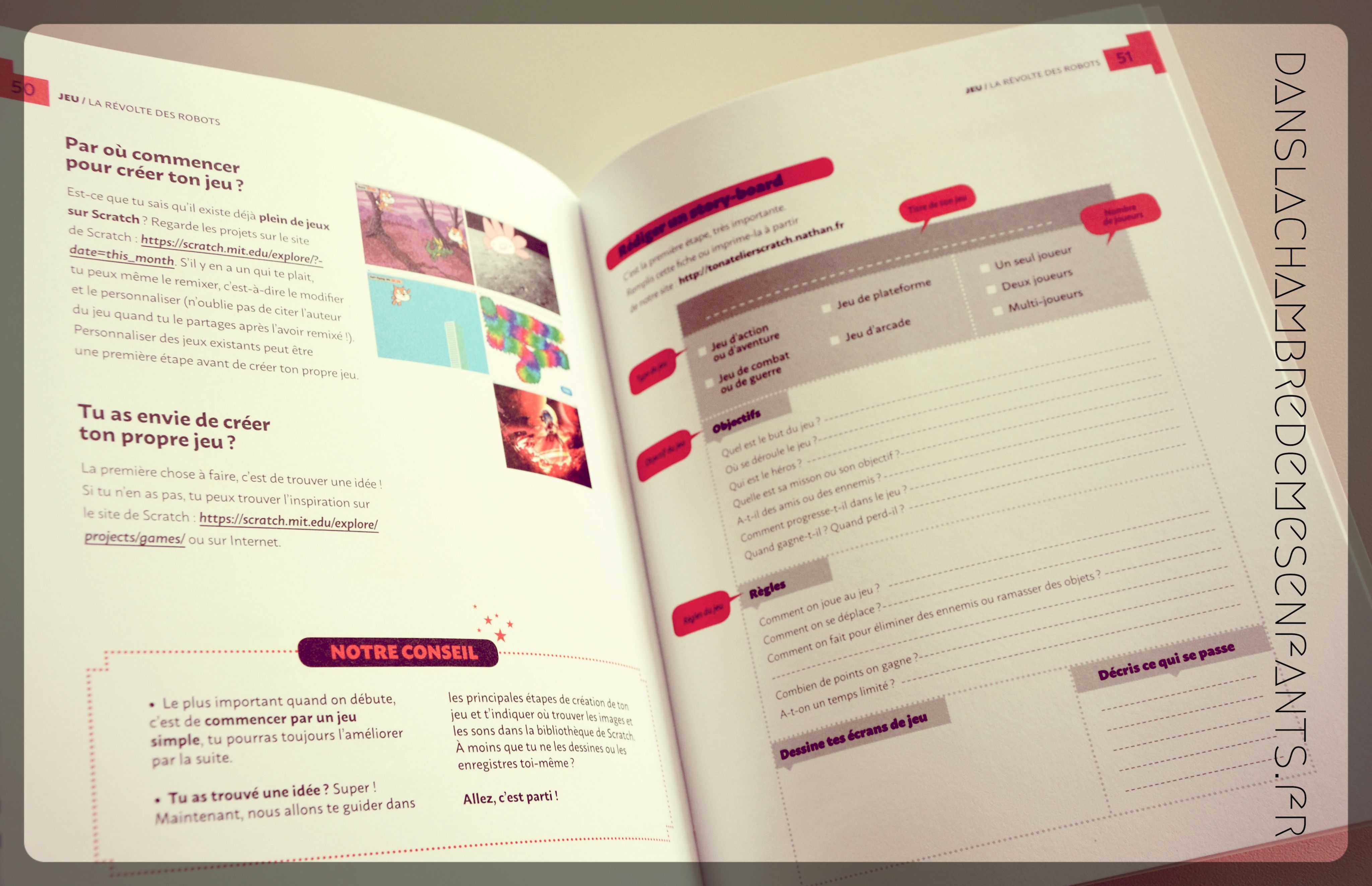 Ces ouvrages présentent d’abord des informations générales (le langage informatique, le codage…) puis un jeu de niveau différent, à partir de 8 ans pour « La révolte des robots » (débutant) et dès 10 ans pour « Panique à Code City » (avancé), réalisables en 4H (temps moyen). Les cahiers se terminent par une partie de conseils et astuces pour que l’enfant code son propre jeu (story-board, prototype…).