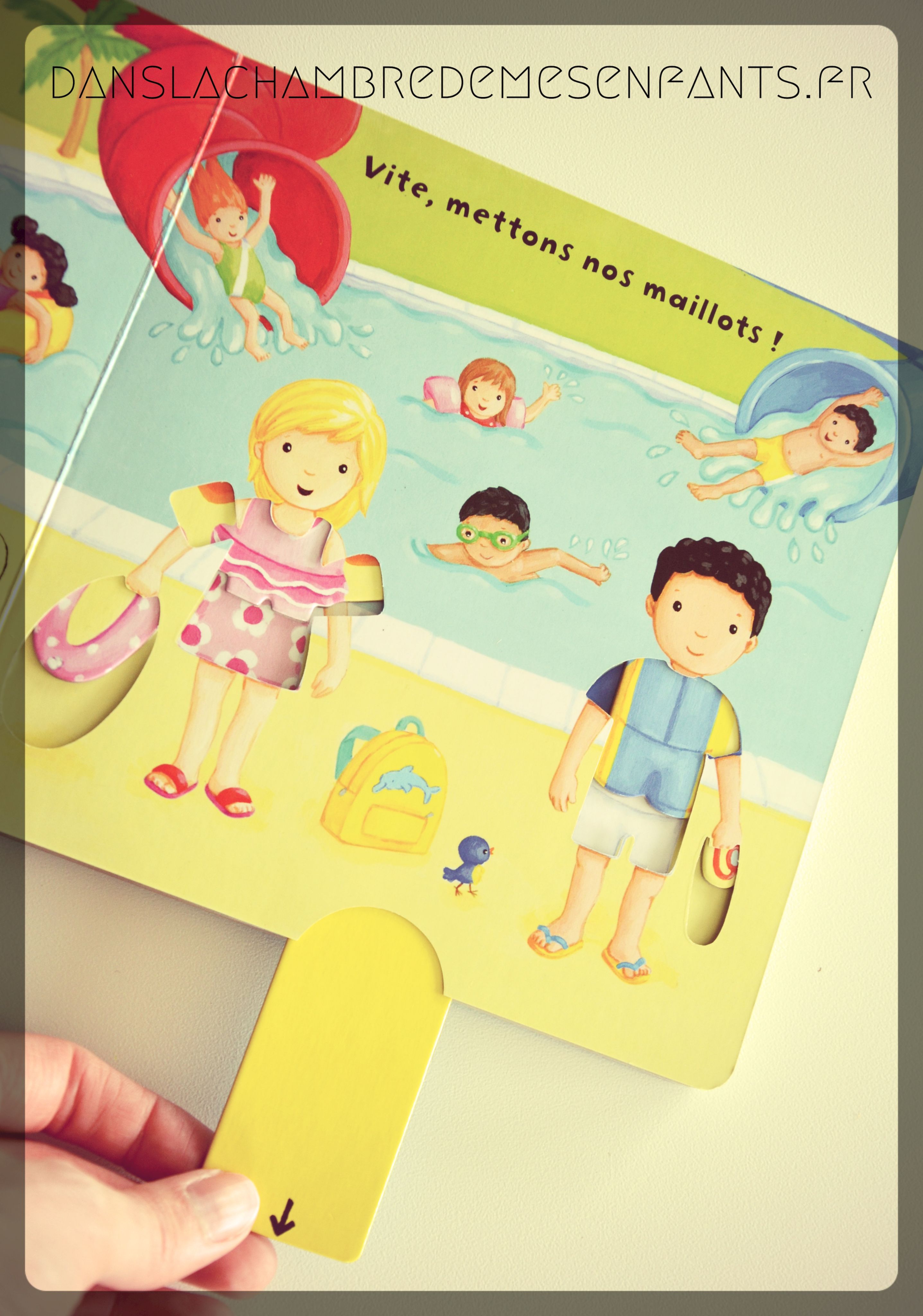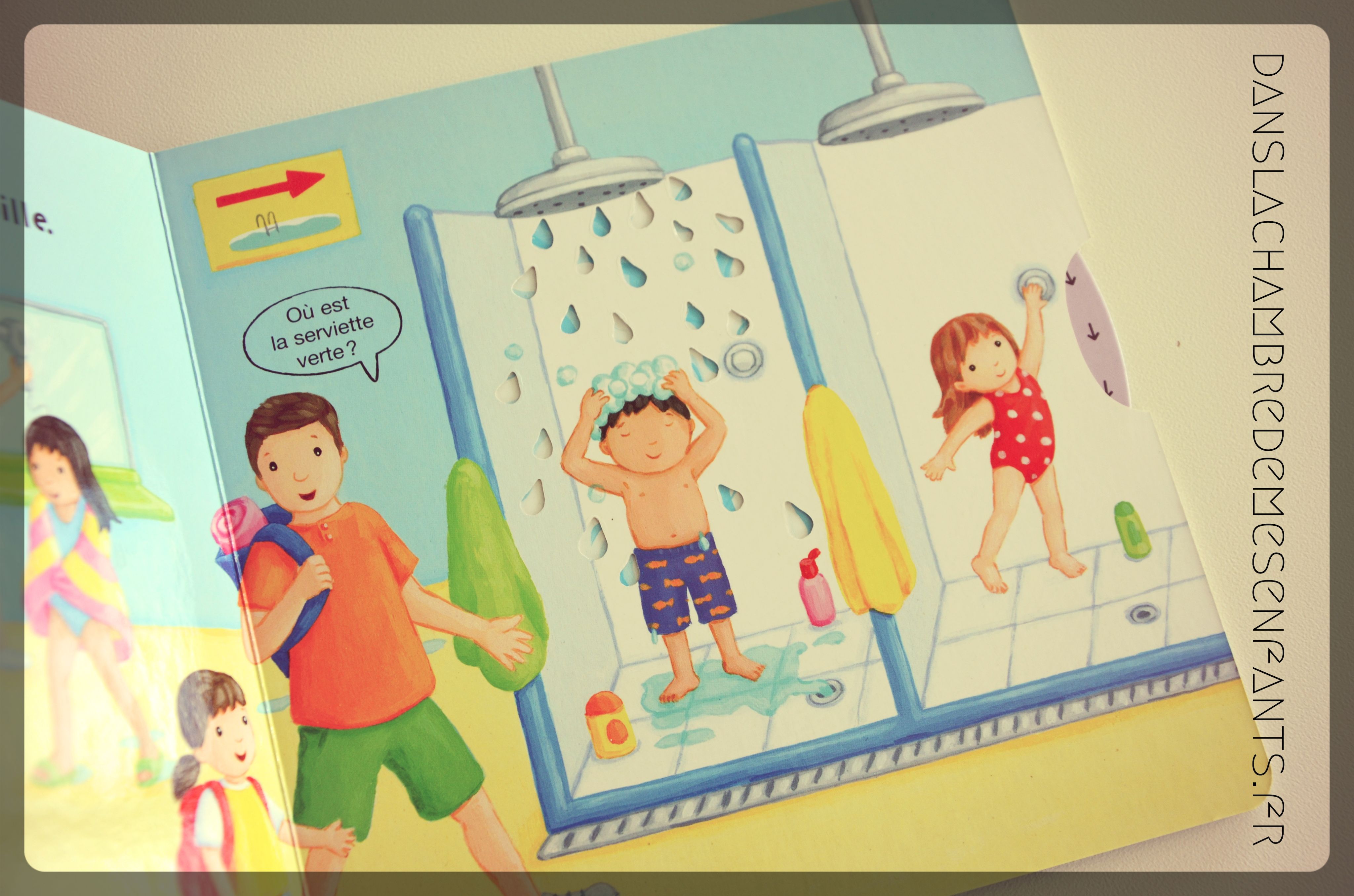 Dans « Ma piscine animée », on commence par habiller les enfants en maillot, puis on continue par l’animation de jeux dans l’eau avant de prendre la douche. Les illustrations sont un peu moins modernes mais toujours douces et gaies.
