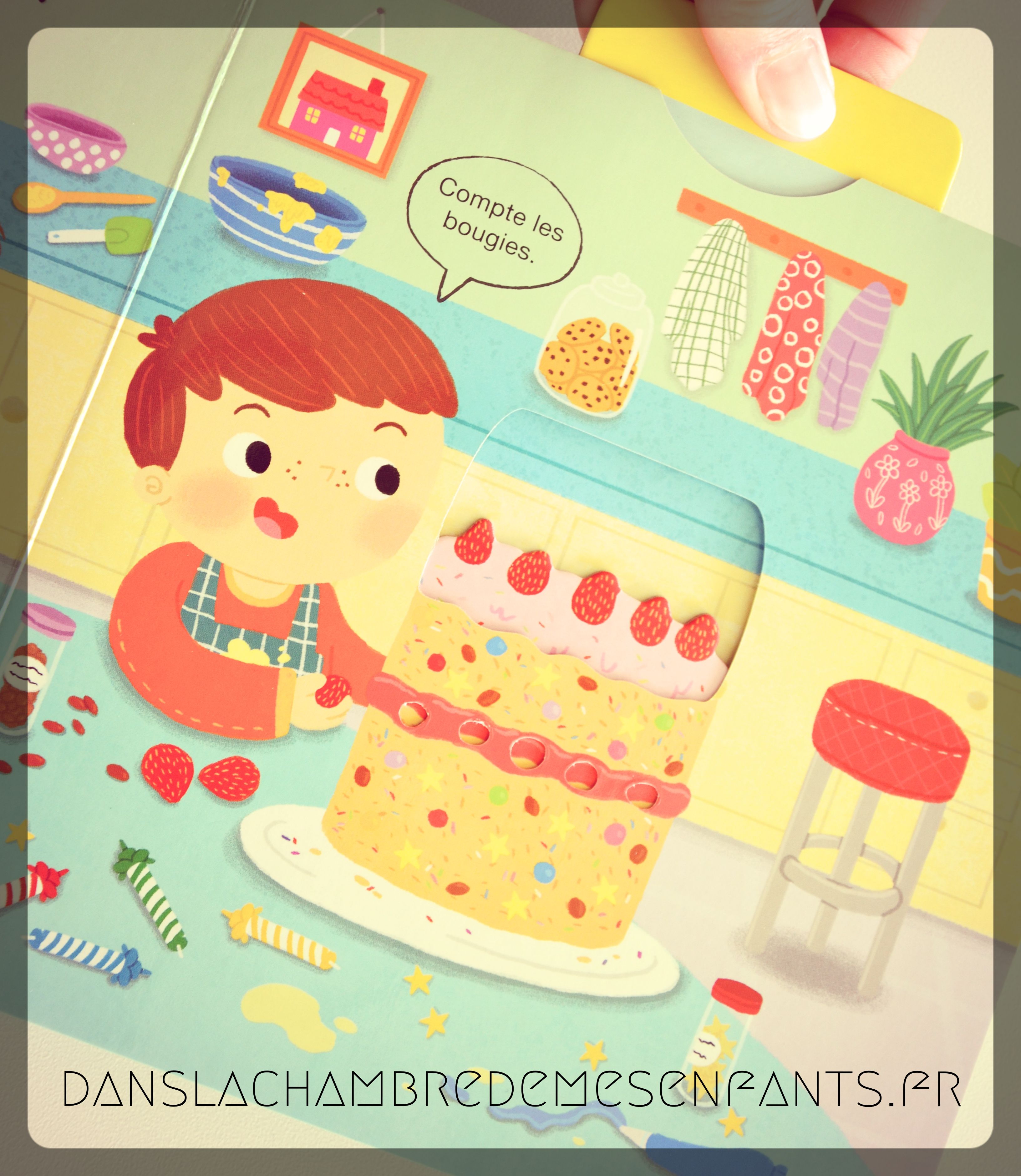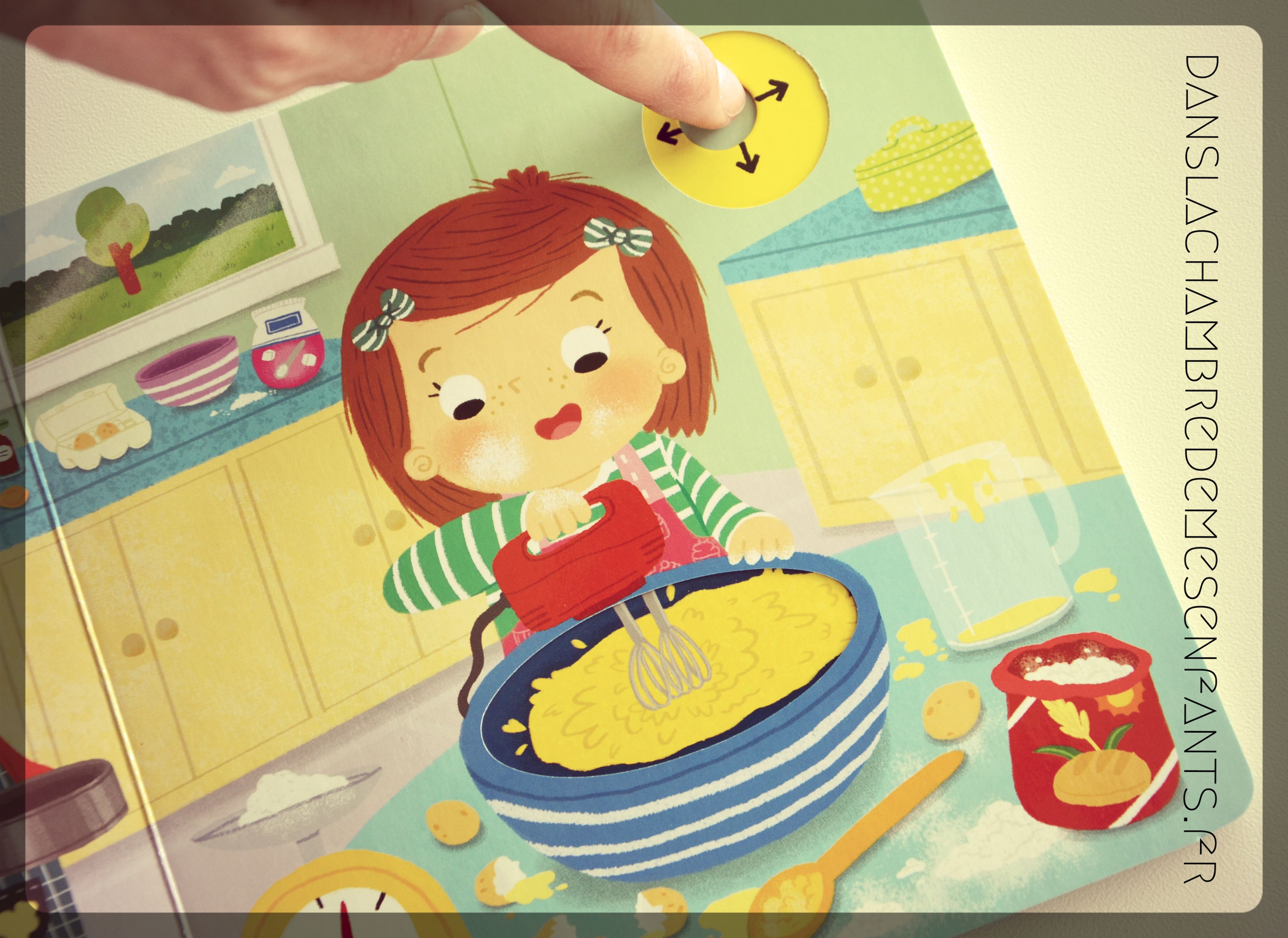 L’avis des enfants : Emi, 2,5 ans, s’est un peu amusée avec ces ouvrages le temps de les parcourir 2 ou 3 fois. C’est d’ailleurs à son âge que sont accessibles les jeux d’observation tels que ceux mis sous la forme interrogative (ex: « Où est la serviette verte ? » « Compte les bougies »). Elle a eu une préférence pour le 1er livre qui lui rappelle un moment qu’elle attend avec impatience, retenant tout particulièrement l’animation du fouet électrique avec le bouton poussoir.