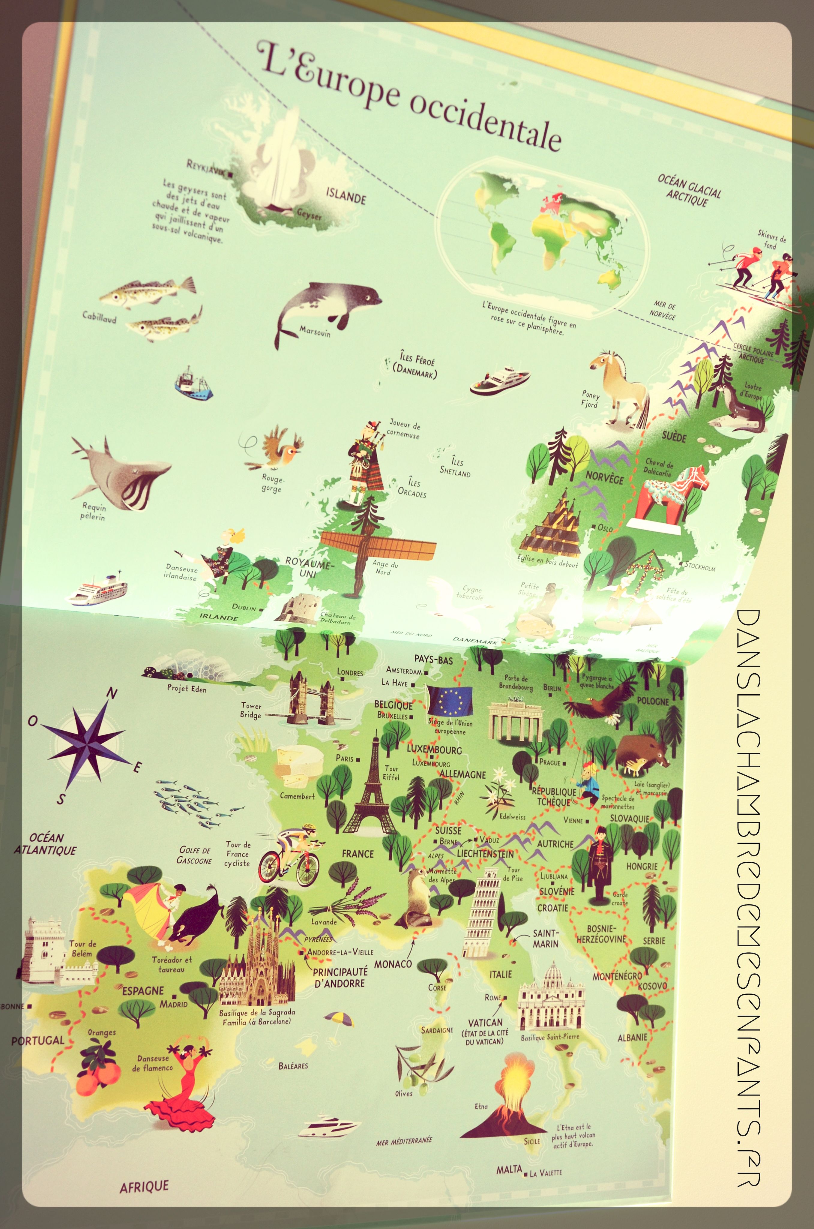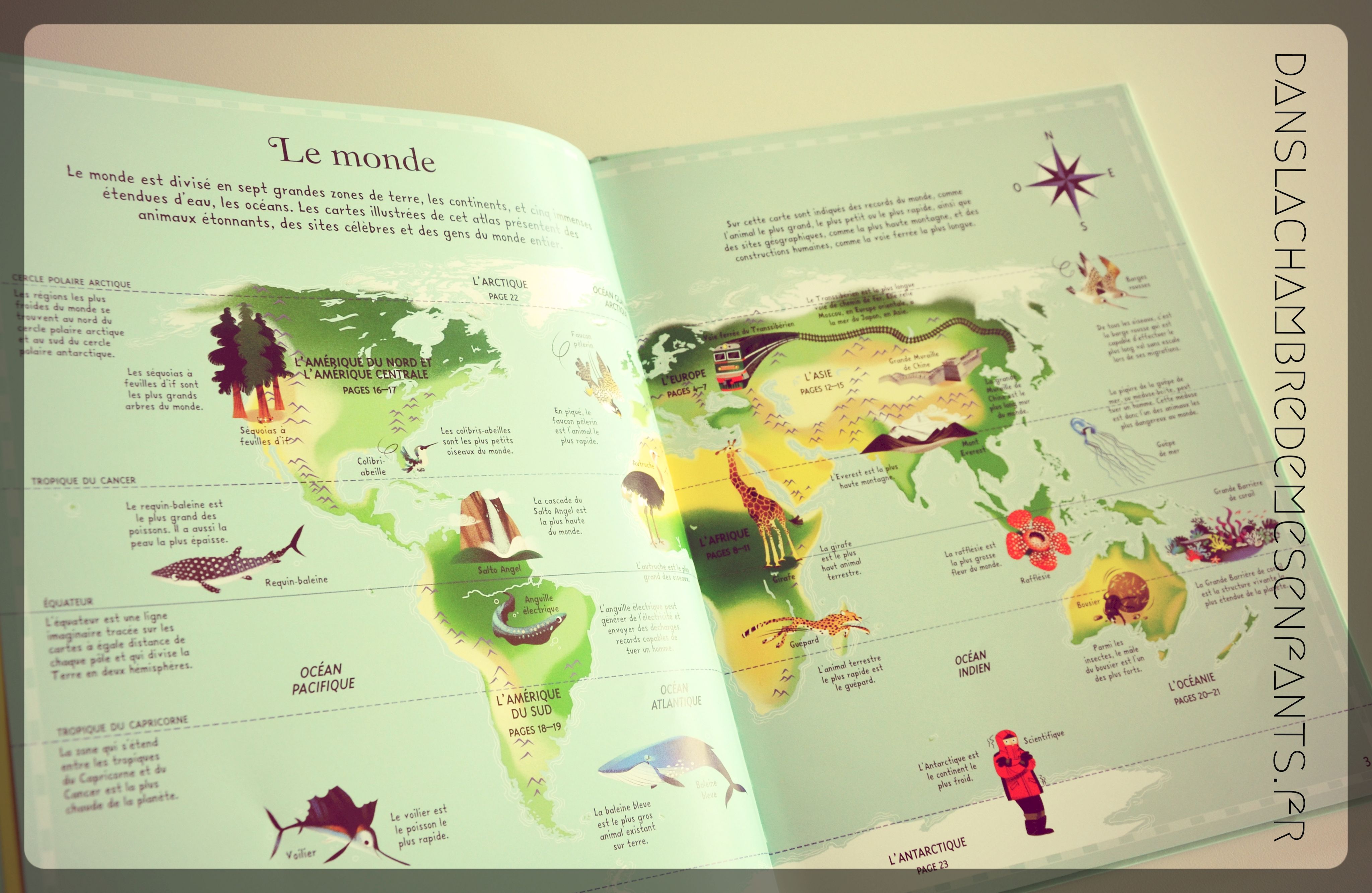 Les cartes (le monde, l’Europe occidentale, l’Europe orientale, l’Afrique septentrionale…) sont illustrées d’éléments à découvrir (ex : faucon pèlerin, rafflésie, Tower Bridge…) suivies des drapeaux du monde, d’une page pour tester les connaissances du lecteur (situer les éléments tels que le Grand Canyon du Colorado, le poisson-globe…) puis d’un index.