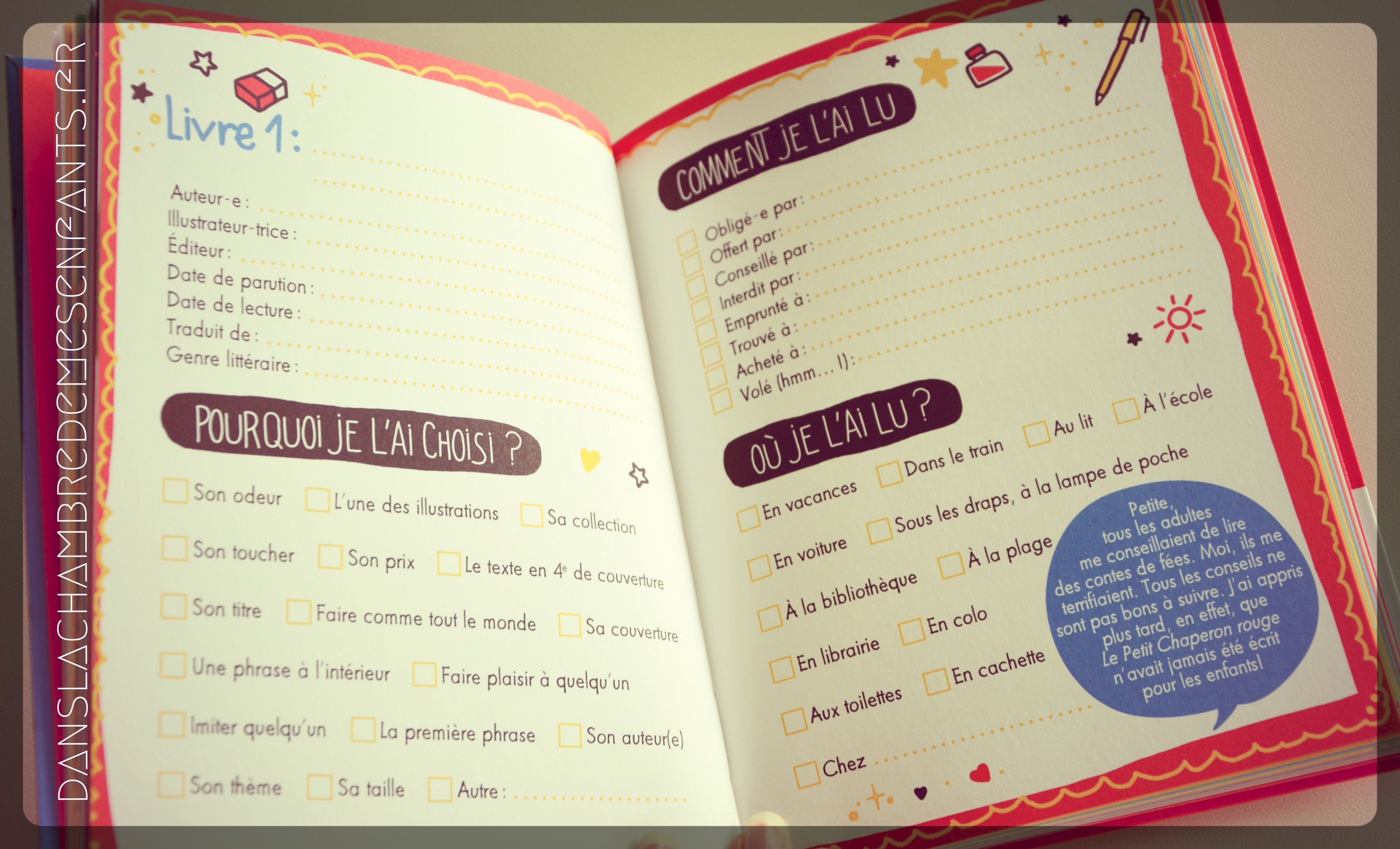 - « Ta collection de livres : […] (ndlr : fiches à compléter) Livre 1 :… Auteur-e :… Illustrateur-trice :… Editeur :… […] Pourquoi je l’ai choisi ? (ndlr : cases à cocher) Son odeur – L’une des illustrations […] Comment je l’ai lu ? […] Où je l’ai lu ? […] Mes phrases préférées […] Ce que ce livre m’a fait […]