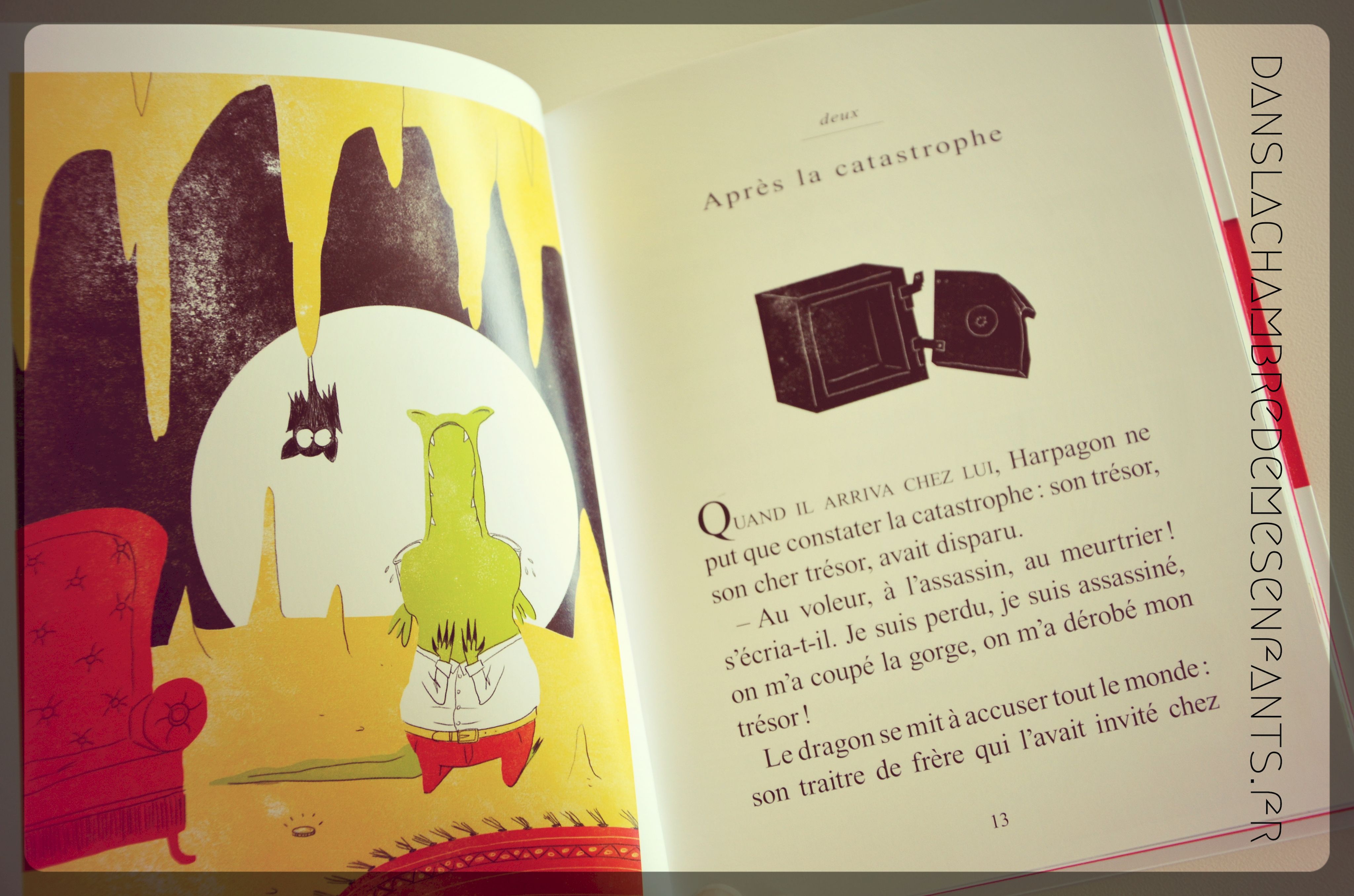 L’avis des enfants : Alex a noté la différence de lecture avec un texte plus long. Le titre l’a tout de même assez intéressé pour aller au-delà de la couverture même s’il aurait préféré un dragon qui ne ressemble pas à un crocodile ! lol Il a dû interrompre sa lecture mais il compte bien savoir ce qu’il arrive à Harpagon car le sujet lui plaît bien.
