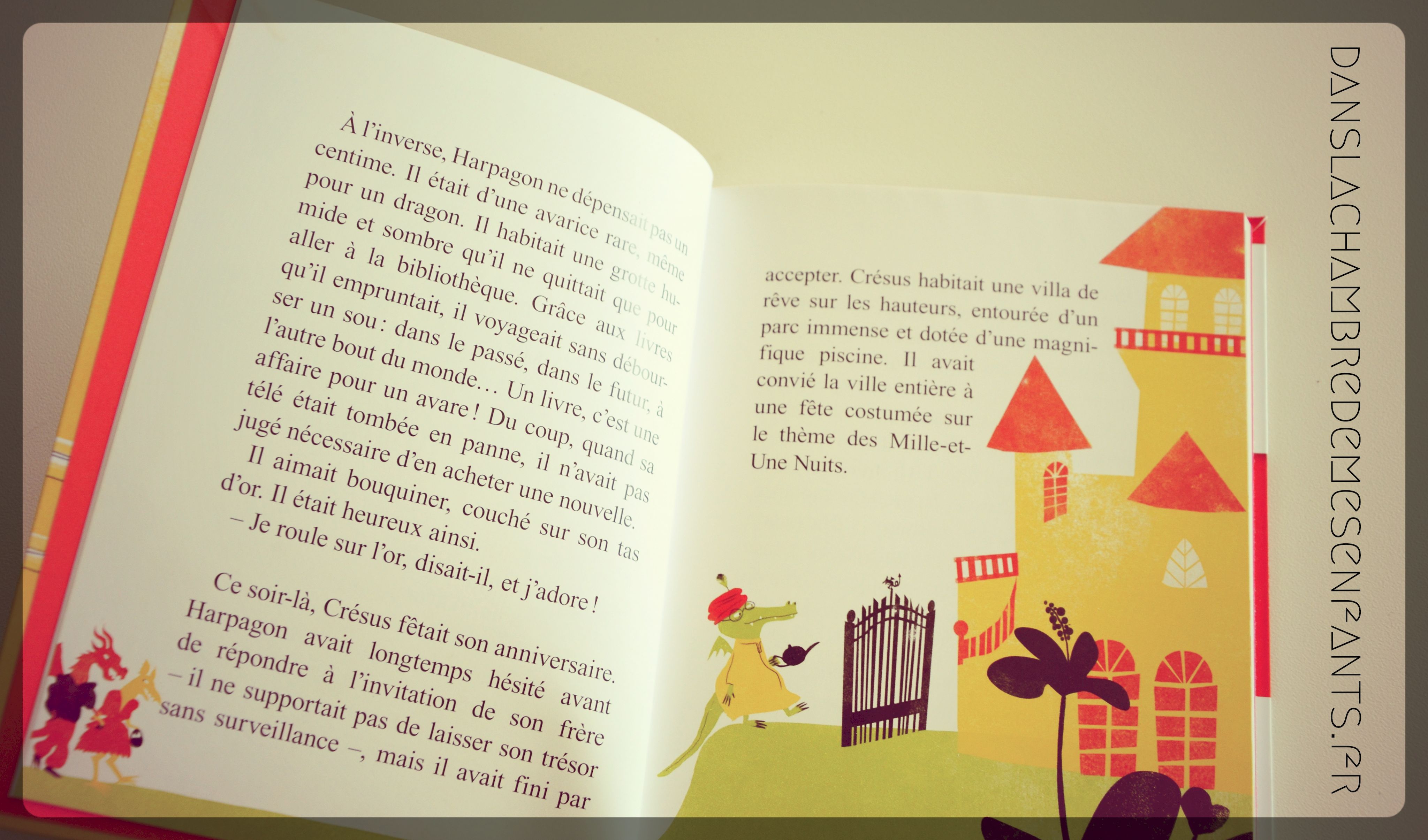 « A la mort de leur père, Harpagon et Crésus s’étaient partagé son trésor à parts égales, mais ils en avaient fait un usage différent. Crésus dépenser sa fortune sans compter [..] A l’inverse, Arpagon ne dépensait pas un centime. Il était d’une avarice rare […] ». Cette histoire se lit comme un conte, en plus amusante. C’est tout de même un roman, avec la même structure, accessible dès 7 ans.