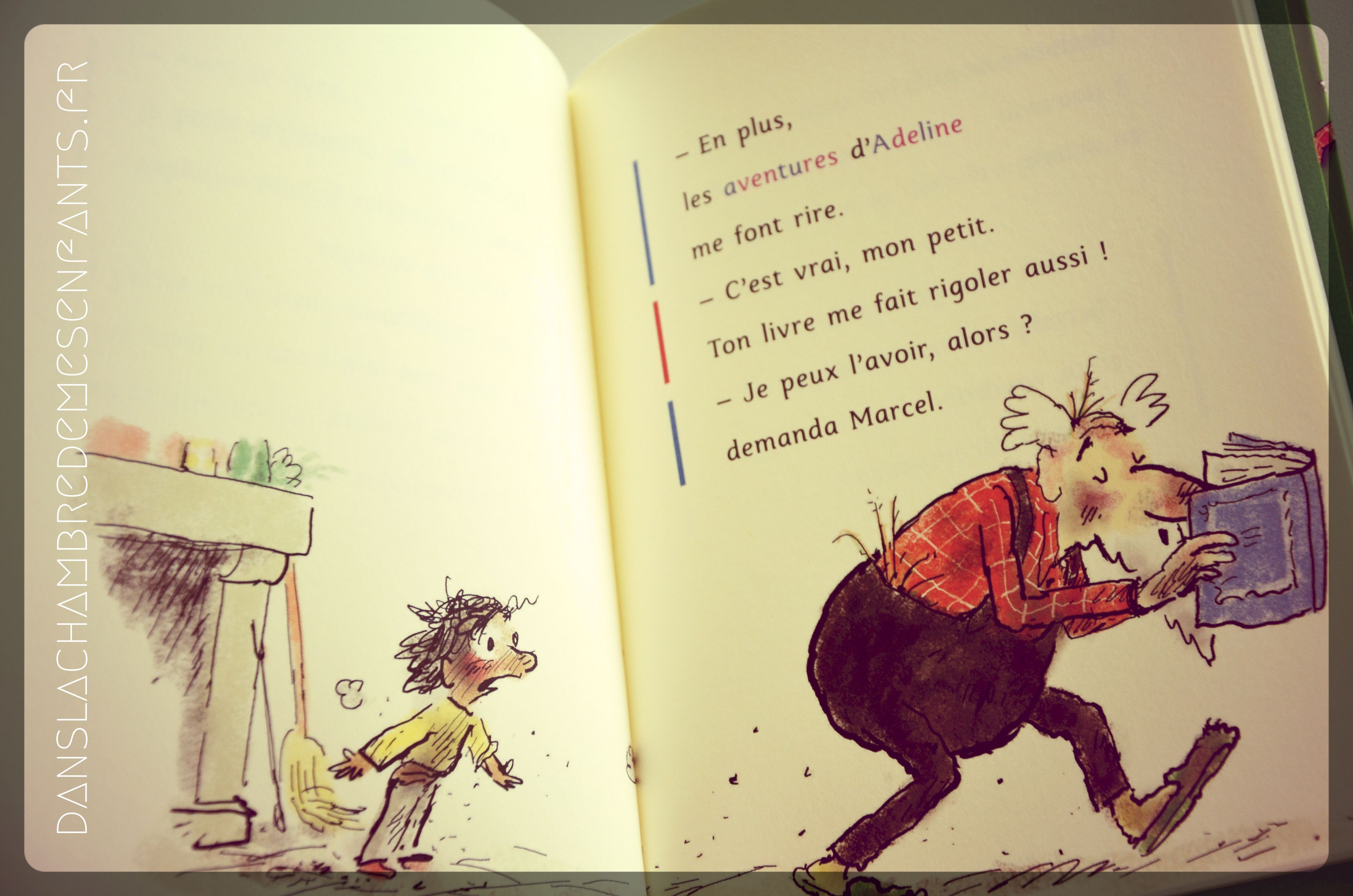 On retrouve aussi le grognon Clodomir Mousqueton qui reçoit par erreur un livre. Il lui trouve de nombreuses utilités détournées comme le repassage de ses chemises. Lorsque Marcel, le petit garçon qui aurait dû en être le destinataire, lui demande de lui rendre, il s’y oppose. Sa ténacité finit, cependant, par le plonger dans « Les drôles aventures d’Adeline Parfaite ».