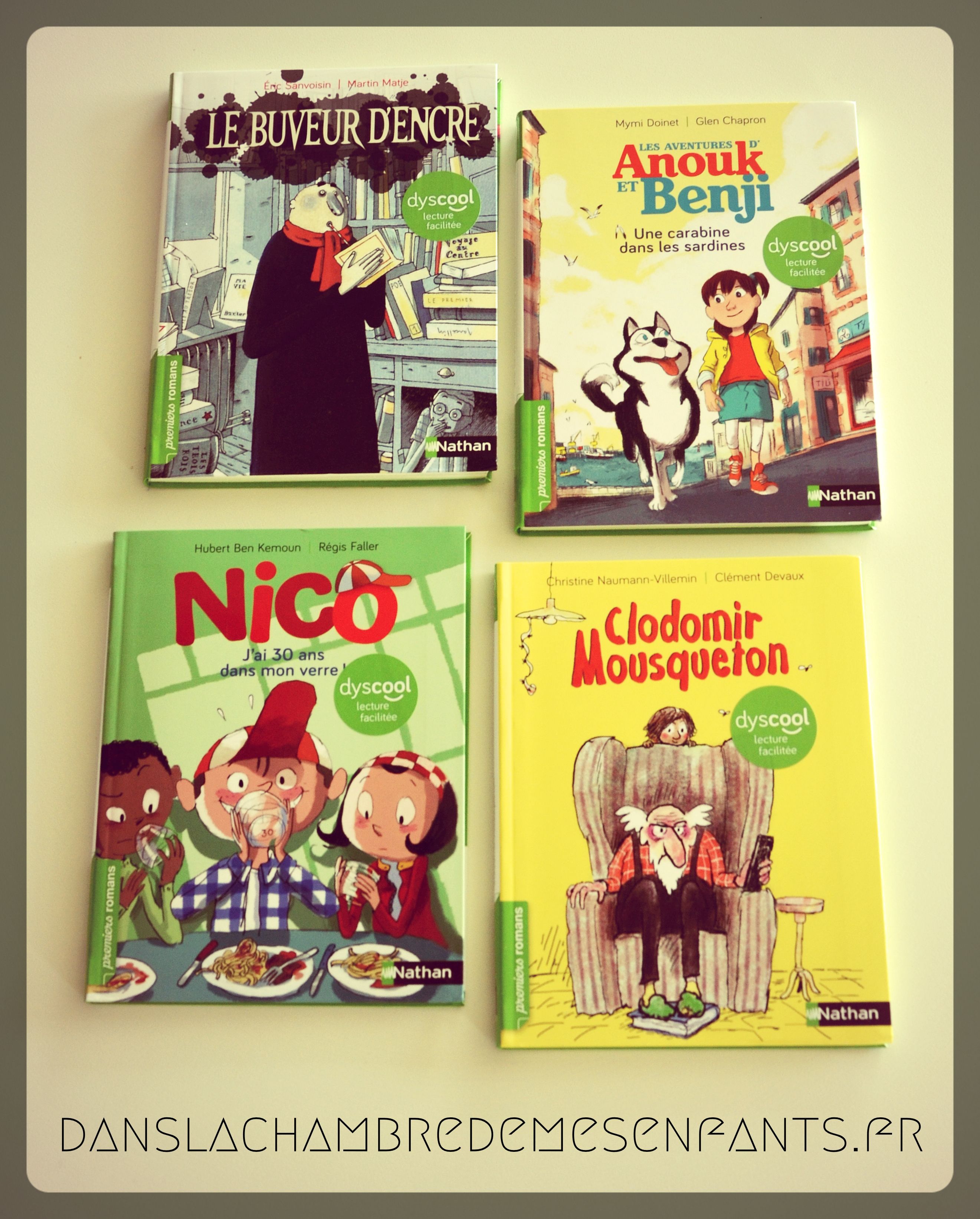 « Nico : J’ai 30 ans dans mon verre ! » – « Clodomir Mousqueton » – « Les aventures d’Anouk et Benji : Une carabine dans les sardines » – « Le buveur d’encre » (Dyscool – Premiers romans)