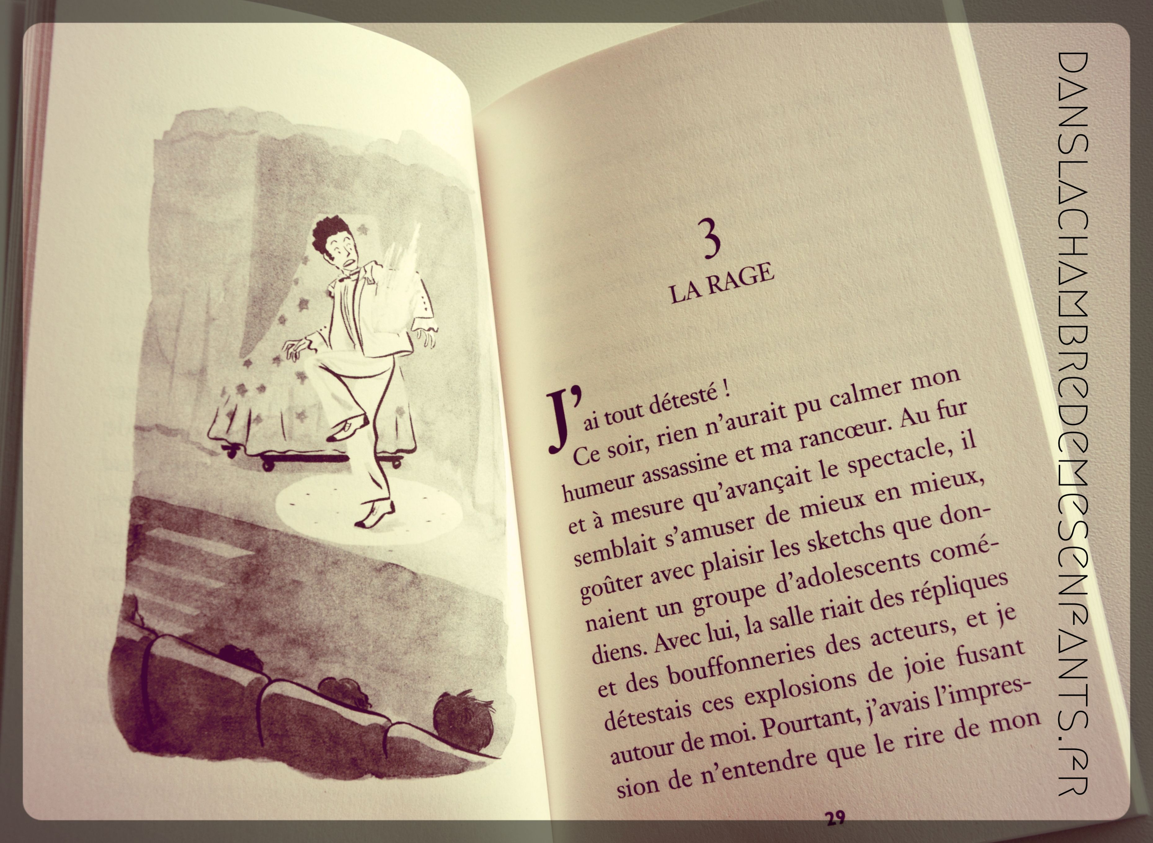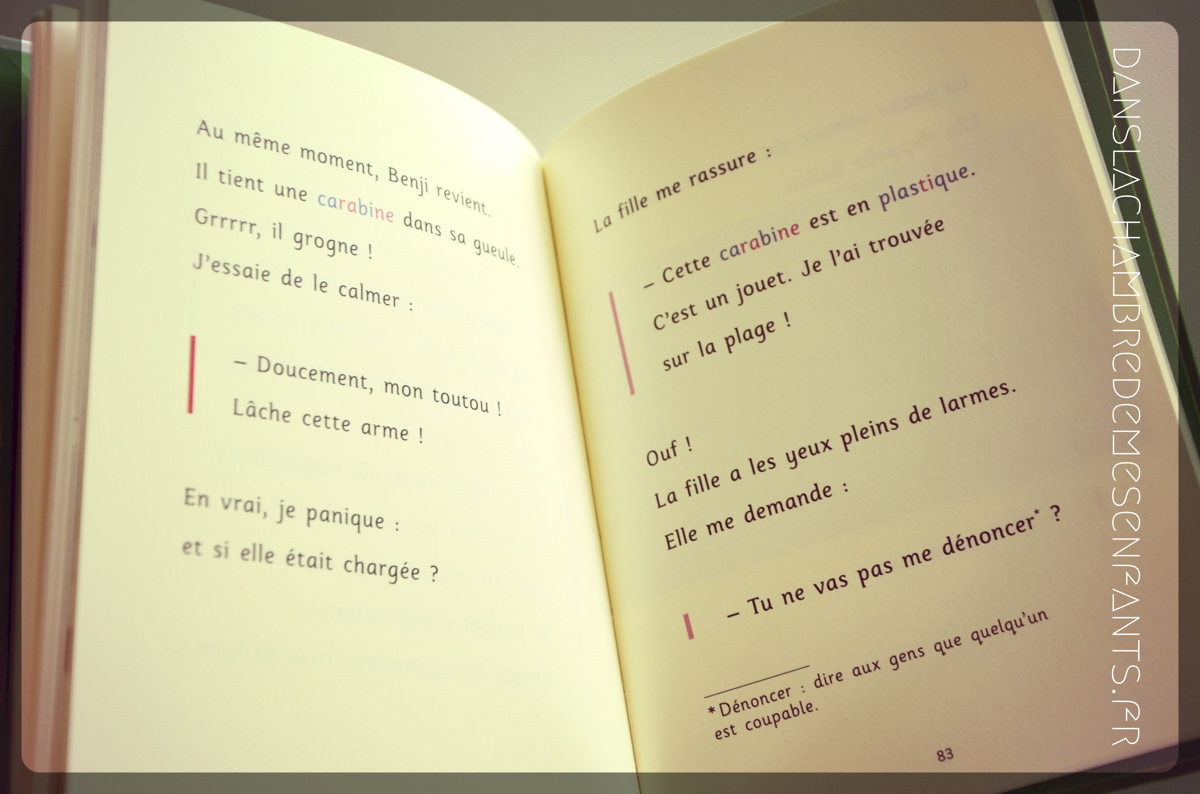 Ce livre n’est pas illustré, et c’est le personnage principal qui présente l’histoire. Le lecteur peut ainsi mieux s’approprier la lecture et mieux comprendre l’emportement, la violence de la colère allant jusqu’au mutisme. Du fait de la nature du sujet et de la façon dont il est traité, il me semble pertinent de réserver cette lecture à des enfants à partir de 9 voire 10 ans. Je trouve que cette lecture est vraiment très intéressante car elle transmet la force des sentiments qui prennent toute la place pour un dénouement tout aussi fort.