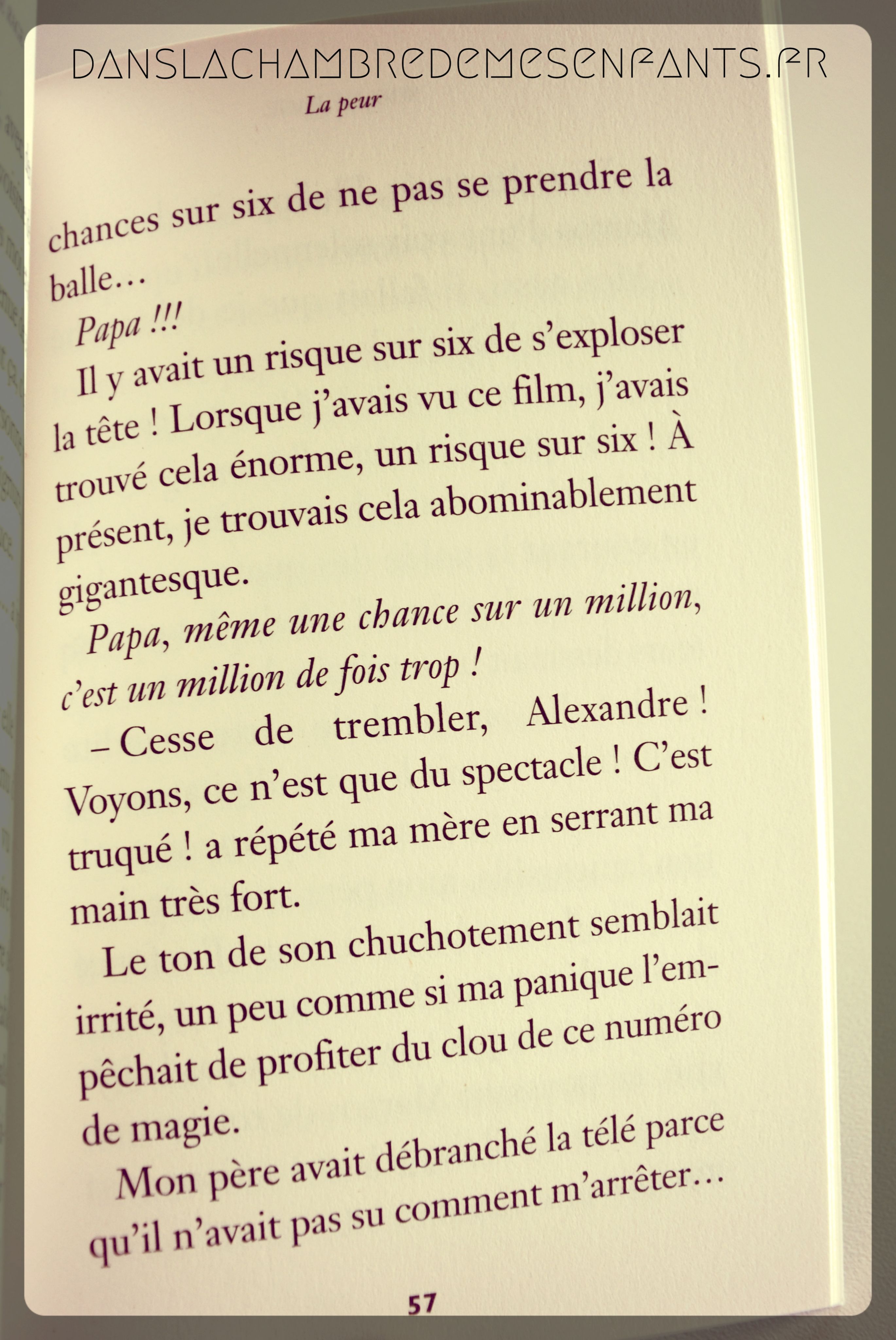 Ce roman parle d’une petite part de vie, un épisode pas si anodin. On y parle de la relation parent/enfant à travers un petit rien qui prend des proportions démesurées. Ca vous parle ? Les émotions sont au cœur du sujet ou plus exactement, plus que de la colère, la haine. Gérer ses émotions est une étape difficile d’autant plus qu’elle revient souvent à nous. Ici, il est question d’Alexandre, 9 ans. Un jeune garçon qui joue aux jeux vidéos à l’heure de se préparer pour se rendre au spectacle de sa sœur. La colère commence d’abord par son père qui interrompt sa partie avant que cette émotion ne devienne celle d’Alexandre. Les 4 chapitres marquent bien l’évolution vers la guerre, puis la rage avant de laisser place à la peur.
