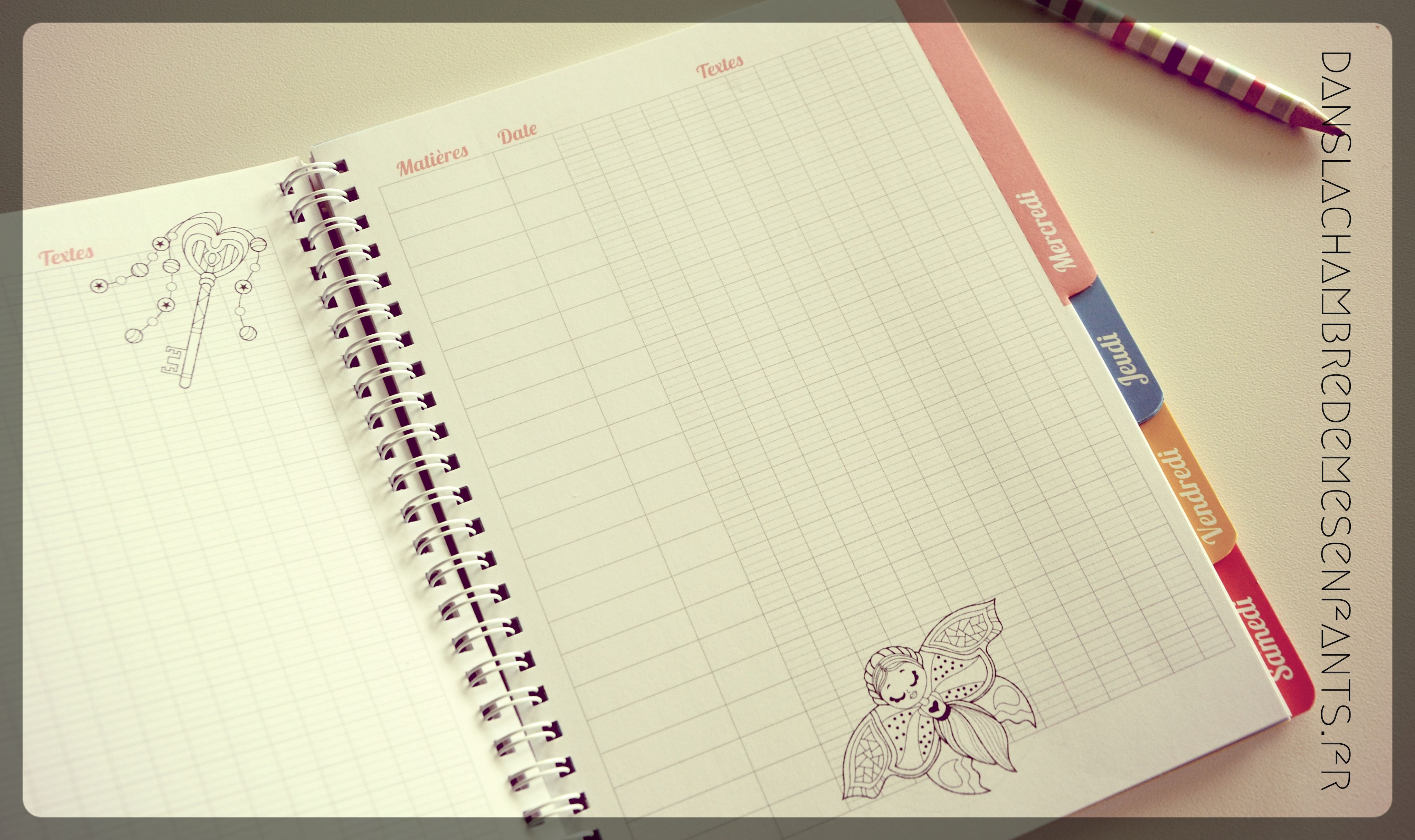 Il se décline également en cahier de texte pour les plus jeunes, dès 6 ans. Il s’agit d’un ouvrage à spirales avec des pages pratiques (informations générales sur le propriétaire, emploi du temps, adresses et tables de multiplications) et les jours de la semaine sont sous onglets prédécoupées (pour les ôter après remplissage de la page). Chaque intercalaire cartonnée propose 2 grands coloriages (1 fois sur 2 avec fond coloré) et chaque page dispose d’un petit dessin en coin à colorier (cœur, fruit, renard, fleur…). C’est un cahier accueillant et tout aussi séduisant grâce aux magnifiques illustrations d’Eugénie Varone.