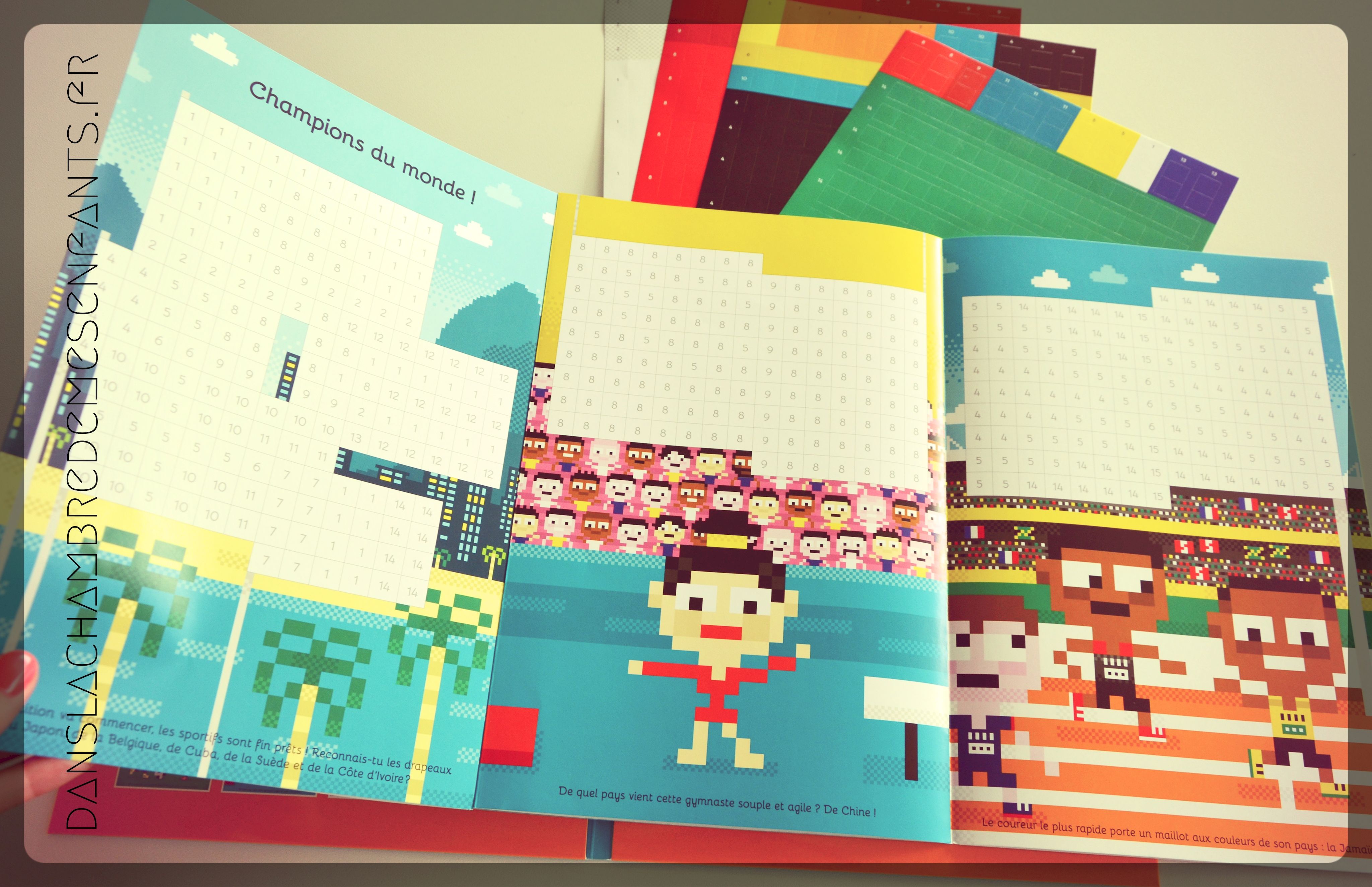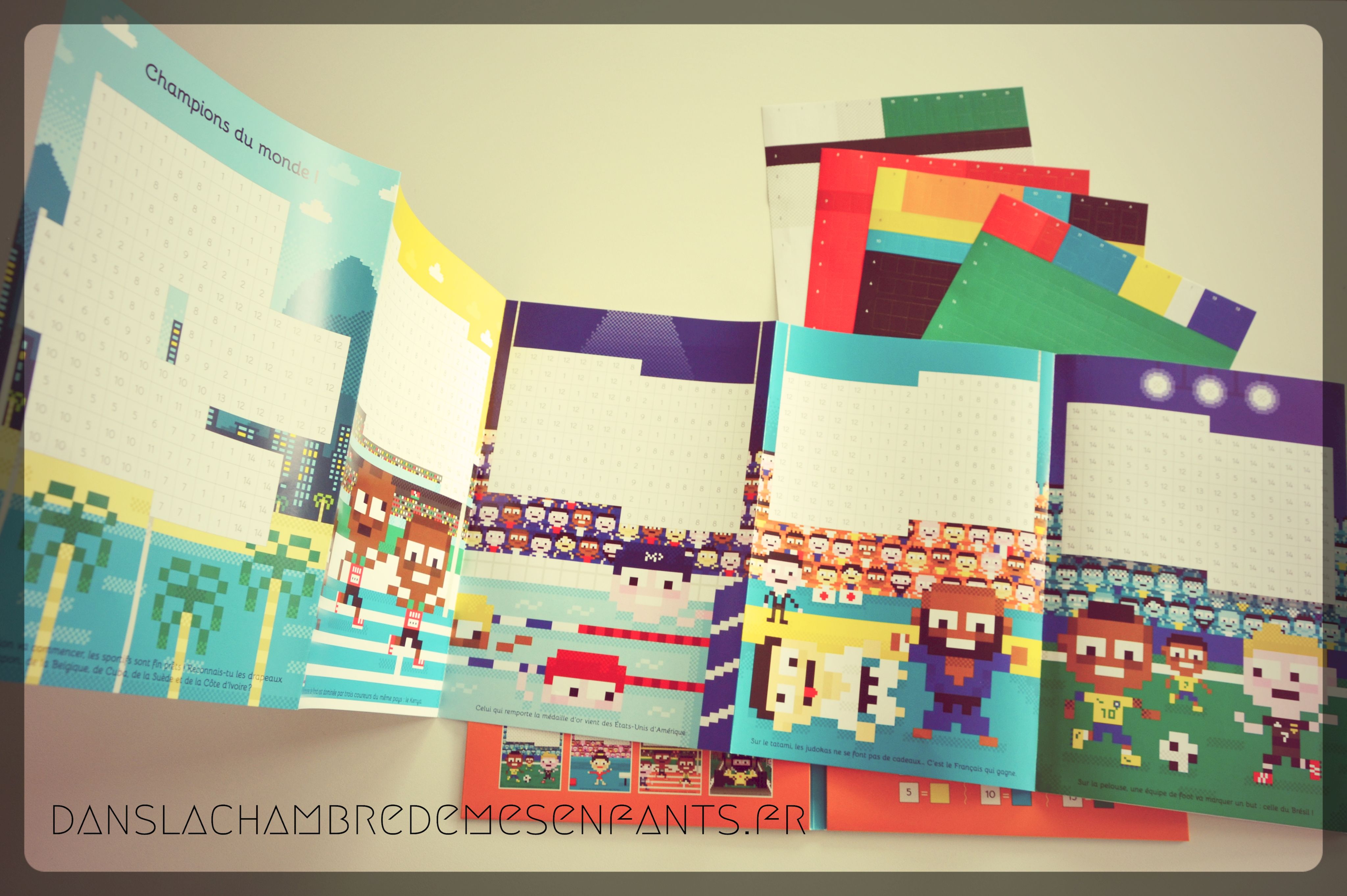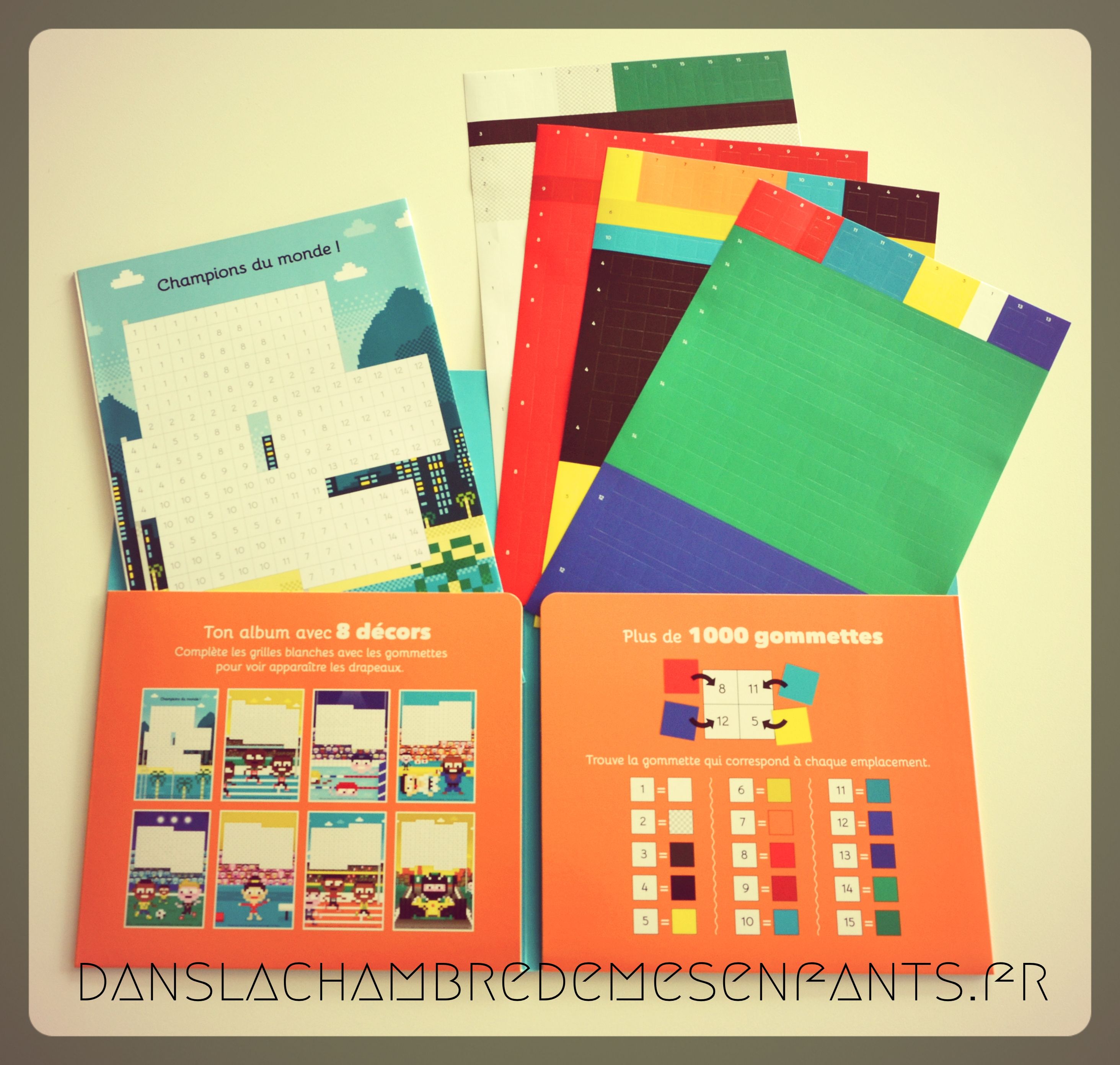 - « Champions du monde ! » : 8 scènes avec des sportifs (GRS, natation, judo…) à compléter en apposant plus de 1.000 gommettes pour coloriser des drapeaux, accessible dès 5 ans.