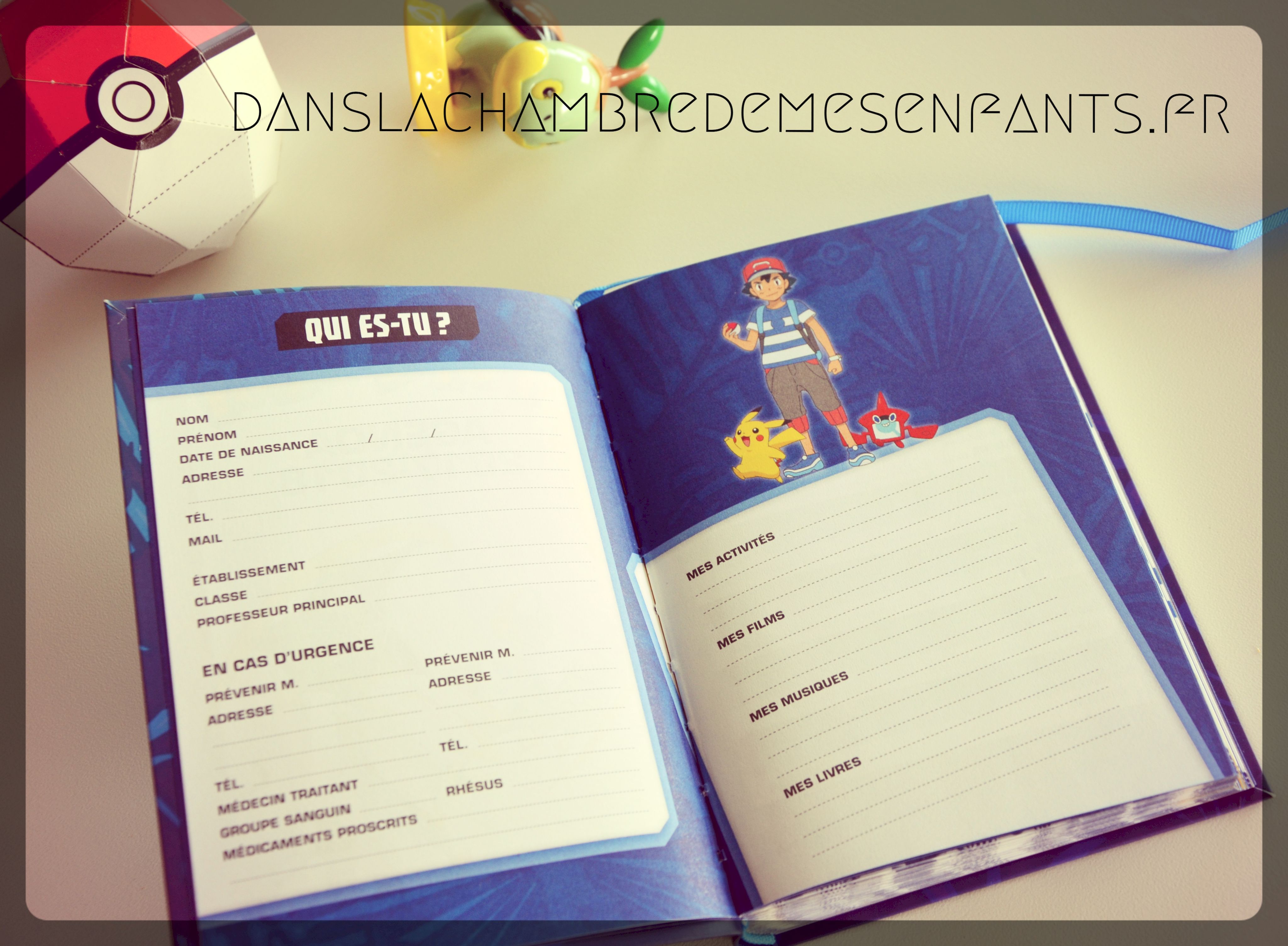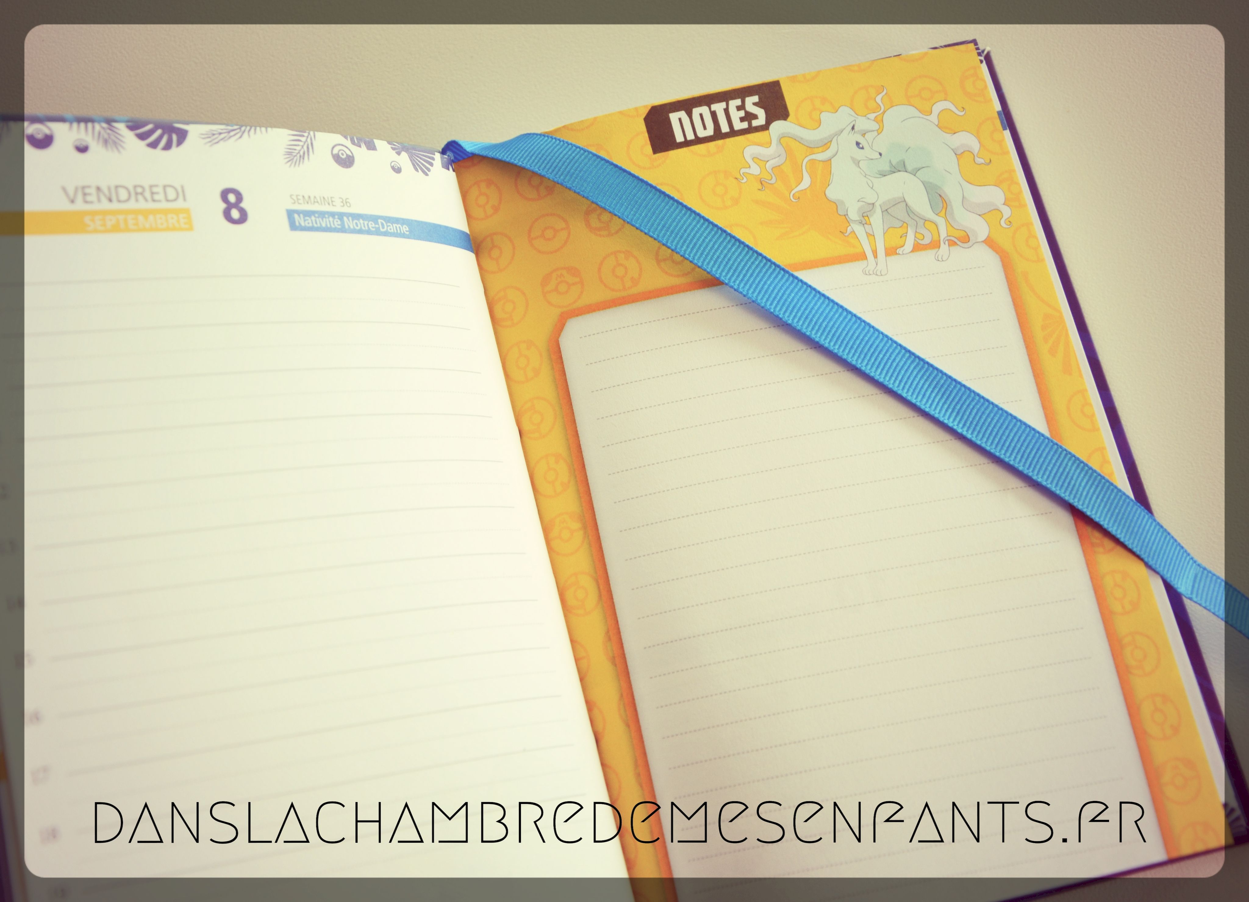 Je le conseille à partir de 8 ans (CE1) même si j’avoue tenter plus tôt pour Alex. En effet, il m’est difficile de présenter cet agenda qui lui fait tant envie et de lui donner un cahier de texte, pourtant plus simple d’utilisation (existe aussi en version Pokémon). Puisqu’il a de très bonnes notions de temps, j’ai accepté de lui confier. Il n’aura pas l’utilité de certaines parties telles que la liste des professeurs par matière, la conjugaison… ce qui pourrait l’encombrer mais il s’amusera à rechercher les pokéball cachées dans les pages. C’est aussi une des limites car je ne veux pas que cela détourne son attention en classe.