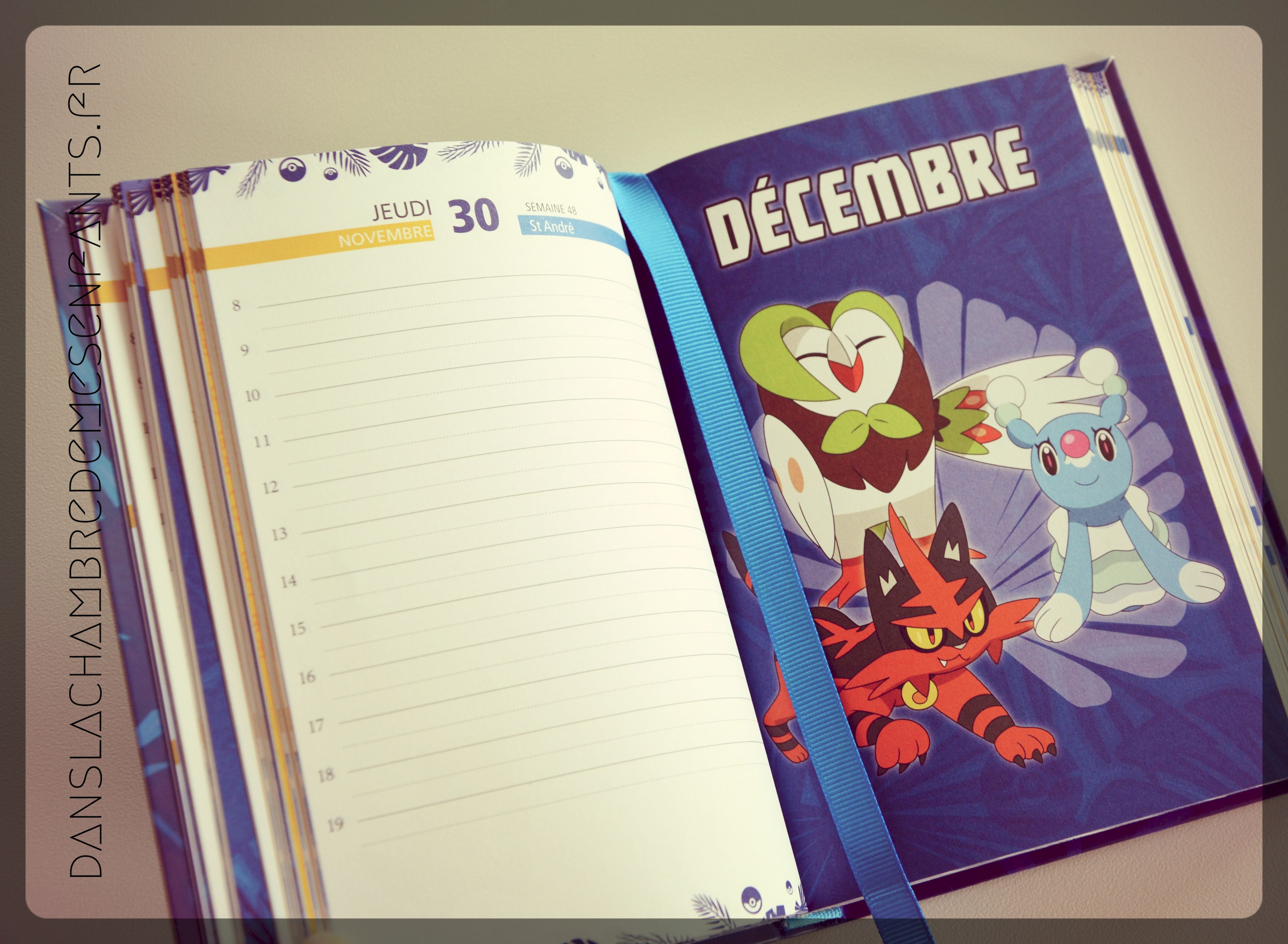 Cet ouvrage dispose des parties pratiques (emploi du temps, répertoire, anniversaire, conjugaison…), d’une page par jour (sauf en week-end) et de nombreuses pages de notes. Pour rythmer l’année, chaque mois commence par la présentation de Pokémon (catégorie, type, taille, poids…) et de régulières illustrations colorées figurent en coin de page.