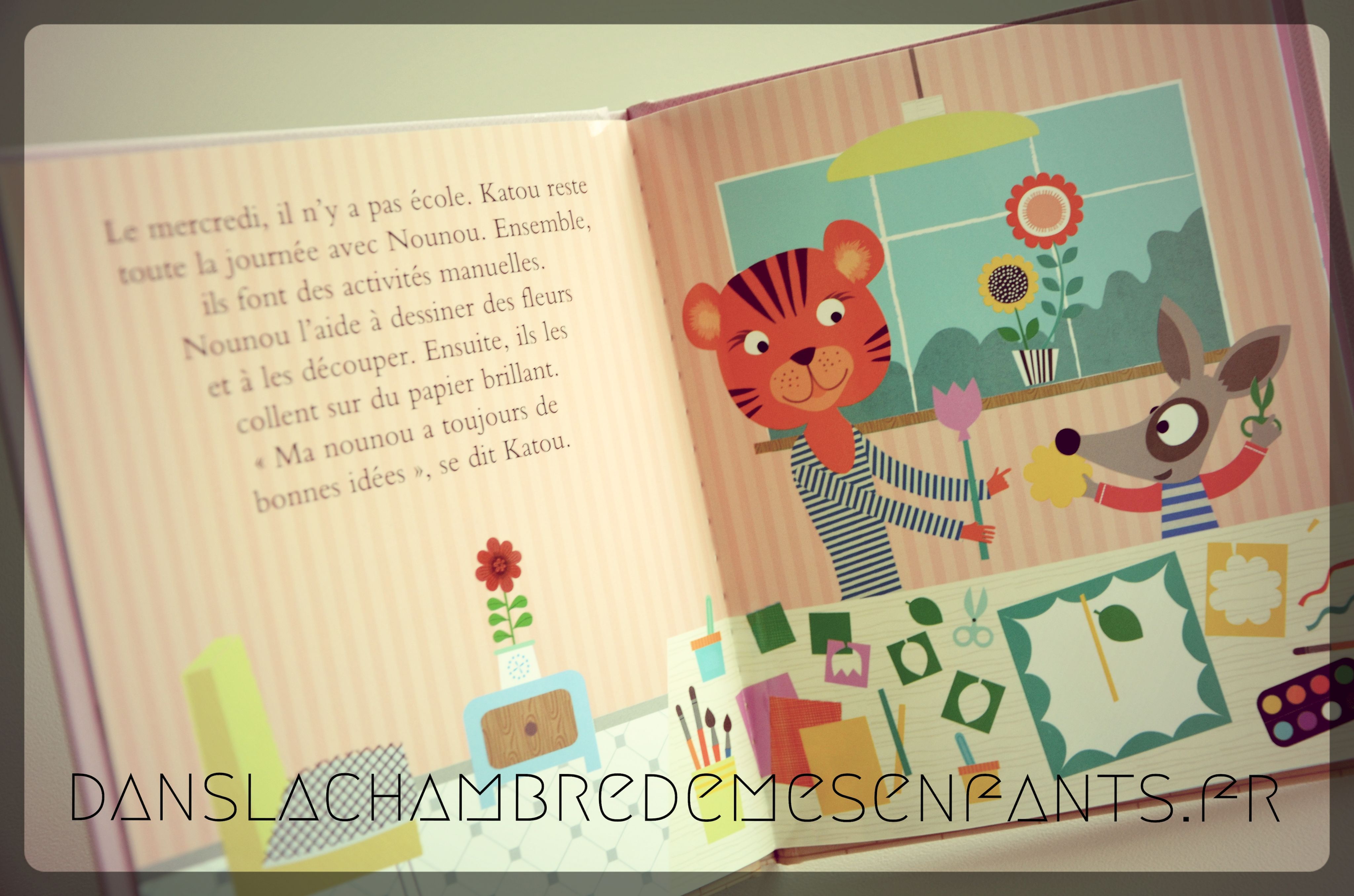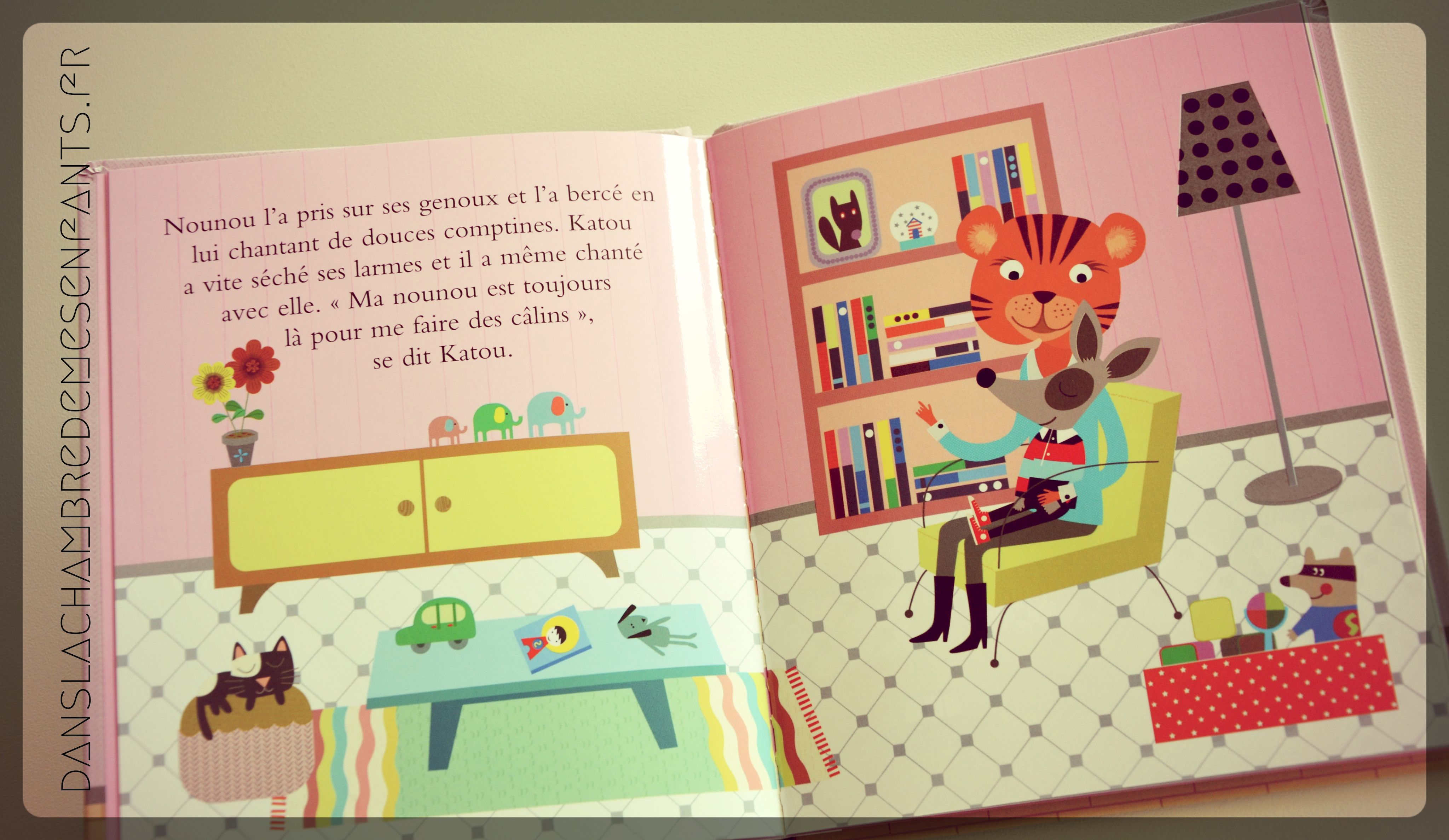 Côté histoire, on découvre le petit kangourou Katou qui est déjà scolarisé et il aussi gardé en périscolaire chez la nounou. Il est donc habitué, mais ce matin il ne veut pas quitter son père. La journée se passe en commençant par une douce comptine, puis le départ pour l’école, une promenade… on retrouve les principaux temps qui composent la journée de l’enfant (en abordant aussi les mercredis sans école et les soirs gardés) jusqu’au retour de son père avec le sourire. Katou observe et remarque celle qui le garde : « Ma nounou fait toujours très attention à moi » « Avec ma nounou, je m’amuse vraiment bien »…
