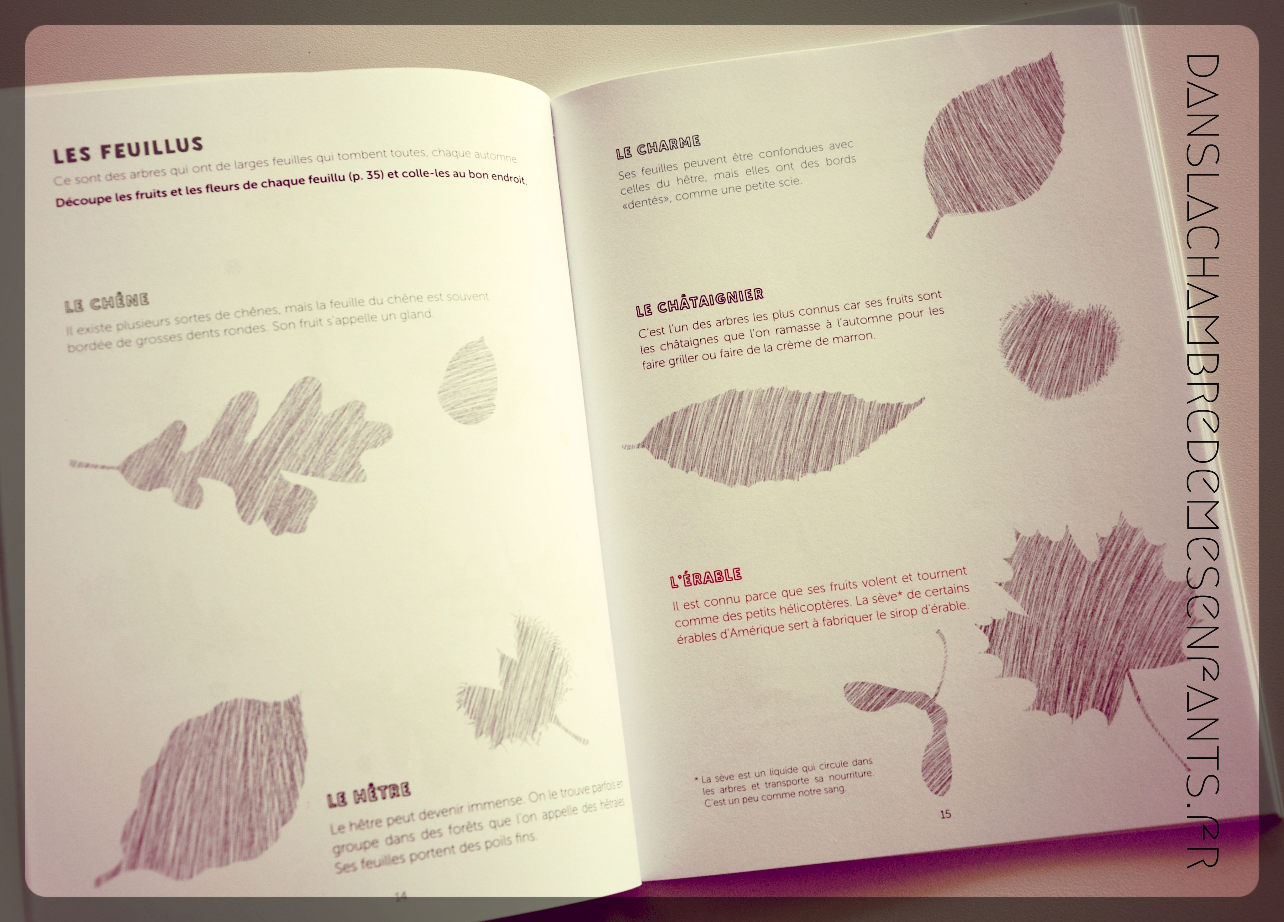 Dans un style épuré, régulièrement illustré par des dessins réalistes, la thématique est renseignée de façon dynamique en alternant découverte (ex : la vie des fourmis, le cycle de vie des arbres) et courtes activités diversifiés et commentées, telles que le dessin (ex : points à relier, libre expression accompagnant la présentation du fonctionnement du repérage par les insectes) et le coloriage, le découpage et collage parfois alliés à un jeu de recherche (ex : placer les noms aux bons endroits en recherchant des indices), la mise en œuvre d’ateliers (ex : attirer des papillons avec 4 techniques, recette de la crème de marrons après avoir appris à différencier les marrons des châtaignes).