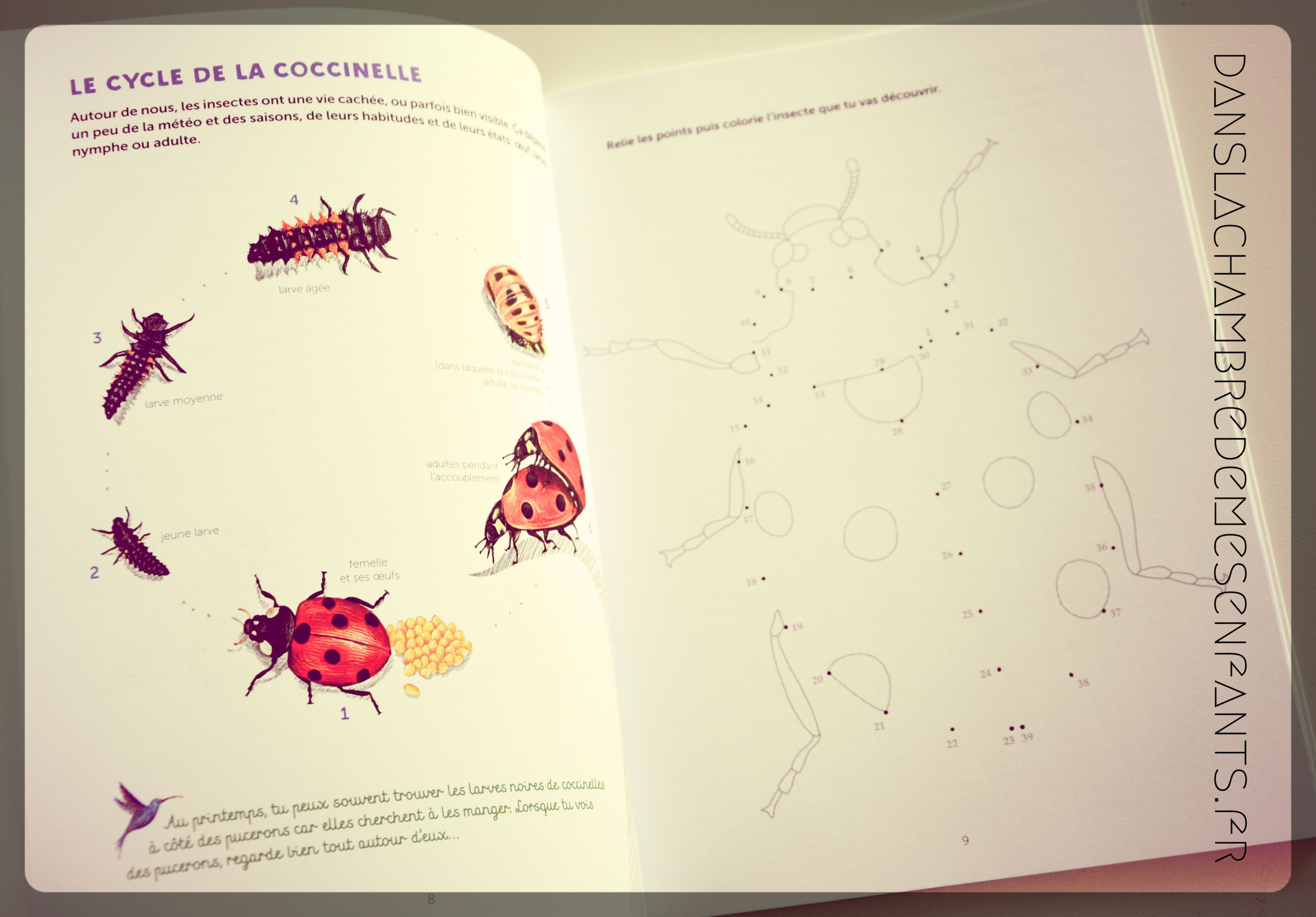 L’avis des enfants : Alex, 7 ans, avait déjà été intéressé par ce type de format. Il apprécie aussi beaucoup les documentaires. Il est donc un lecteur et observateur idéal pour ces ouvrages ! Il voudrait partir de suite sur le « terrain » et observer la nature. Il a donc fallu que je fasse avec son impatience pour qu’il prenne le temps de se pencher sur les activités sur papier, certaines ayant forcément plus sa préférence (ex : la vie des fourmis).