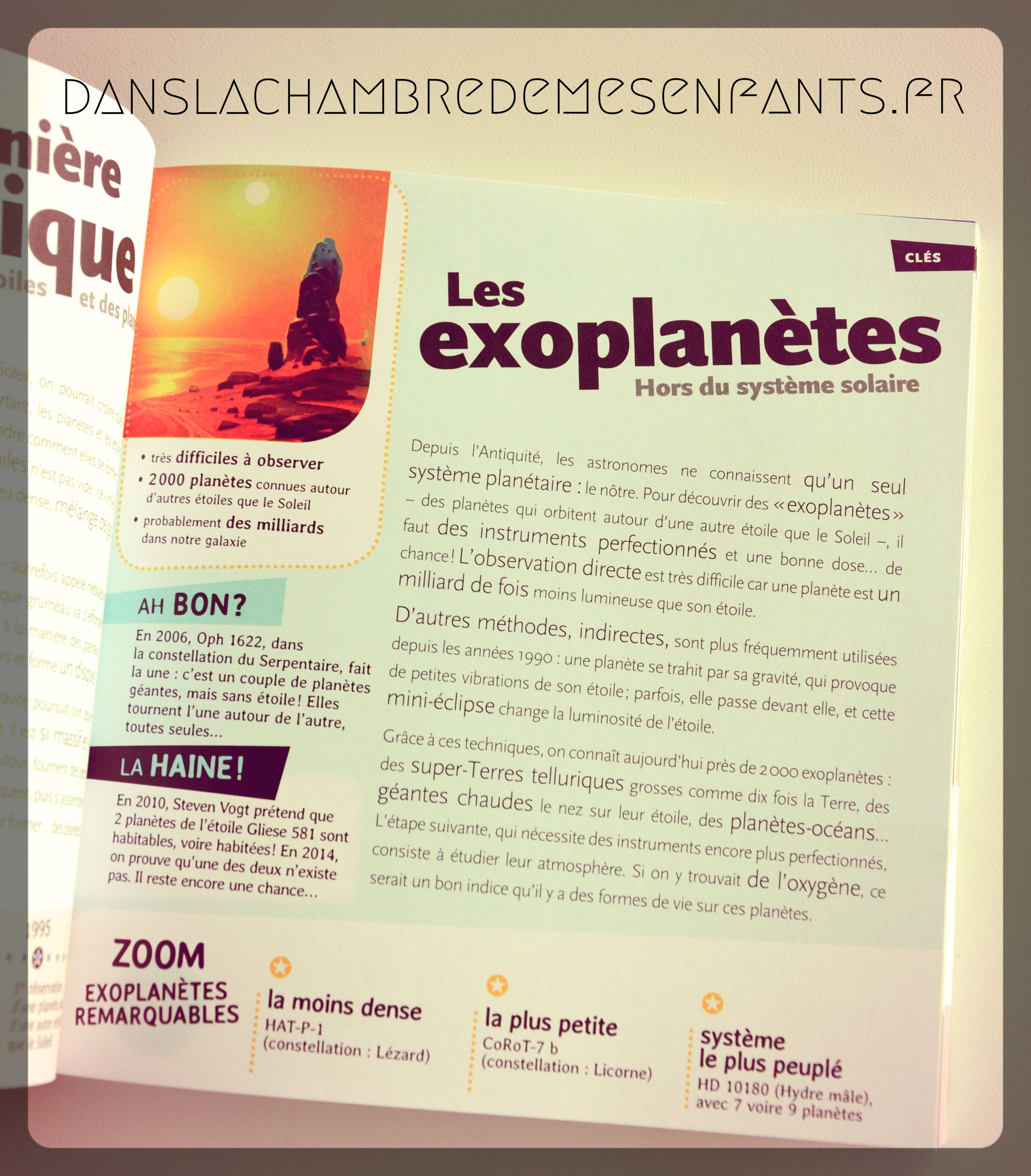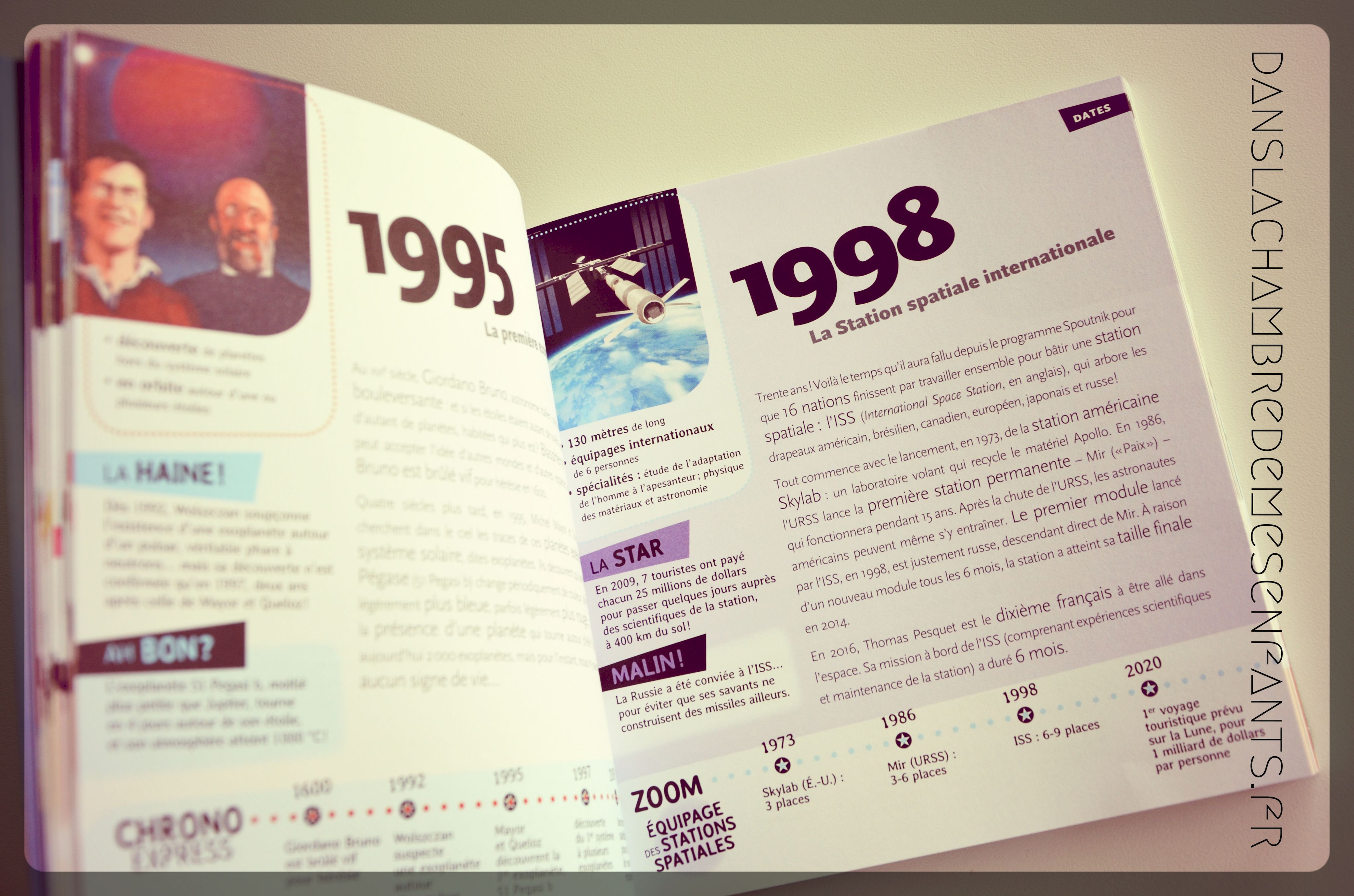 L’avis des enfants : Alex, 7 ans, est fan de documentaire et, tout particulièrement ces temps-ci, de l’espace encore que les animaux sauvages passent en 1ère place depuis cet été. Il n’est pas habitué au format peu linéaire mais il se rend compte qu’il peut décider de sa lecture à sa façon. Bien entendu, il est un peu jeune pour s’intéresser à tous les points développés.