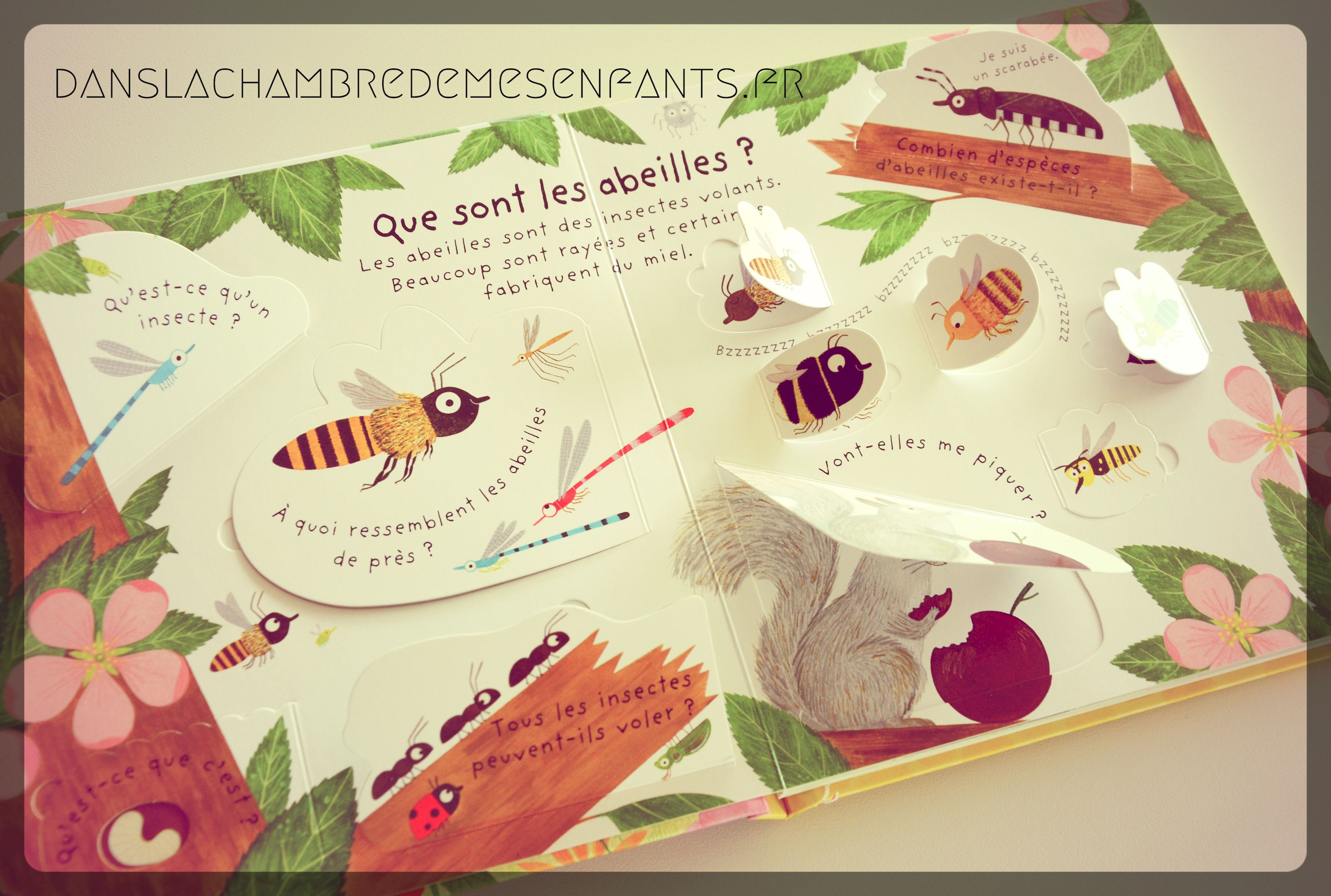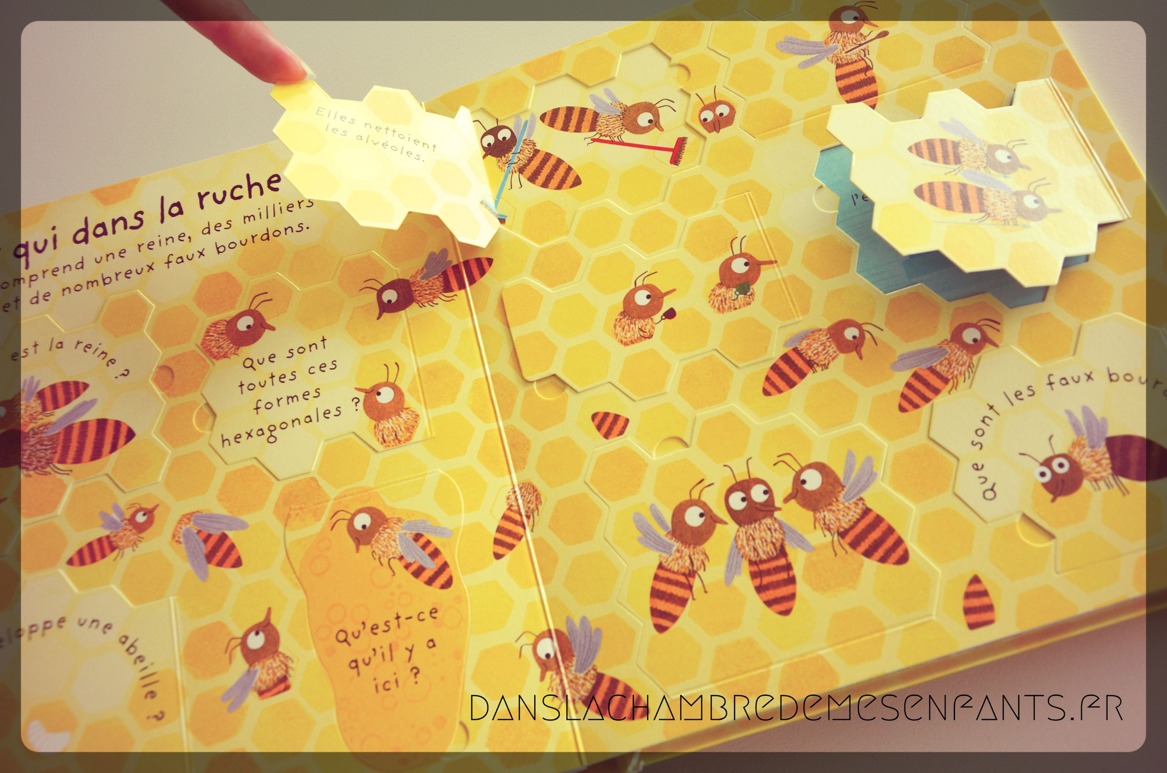 Les questions sont effectivement traitées en plusieurs points, plusieurs sous-questions donnant lieu à de plus nombreux rabats par double page. L’organisation des abeilles est un modèle souvent donné en exemple aux enfants ; c’est donc un sujet incontournable :