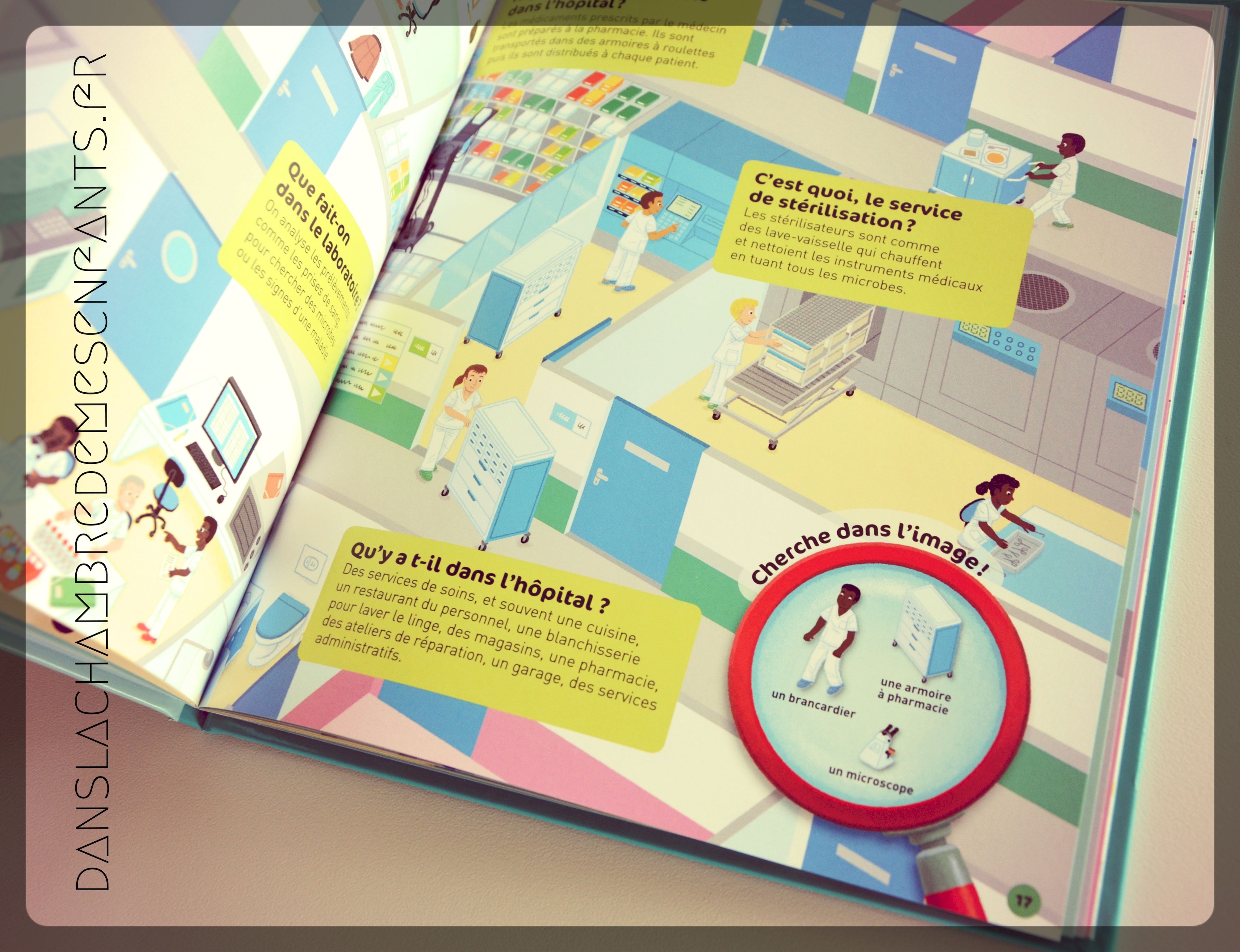 Quit à parler microbes, parlons aussi d’un lieu de soins : l’hôpital. A travers de grandes illustrations, le sujet est présenté sous divers points, présentés par double page, commentés sous petits encadrés pour répondre aux questions des enfants :