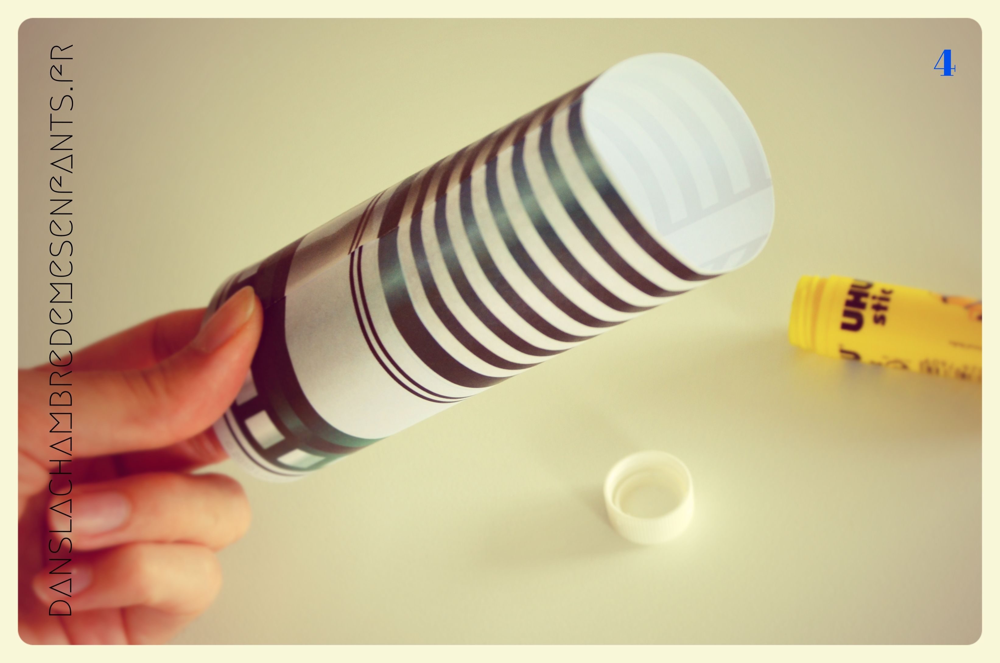 5 – Assembler en enroulant la feuille cartonnée (texte vers l’intérieur) avant de passer une extrémité dans la poignée en papier (comme une bague).