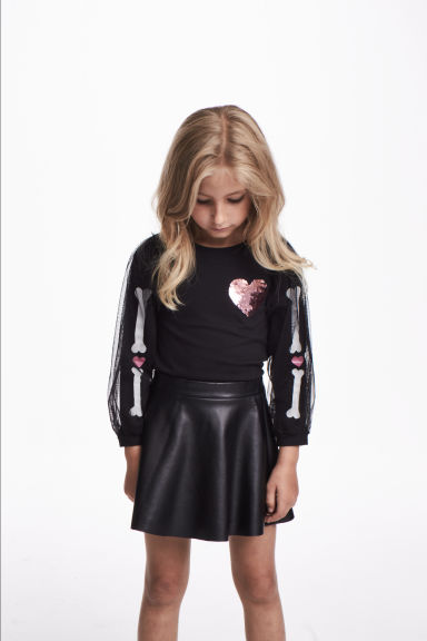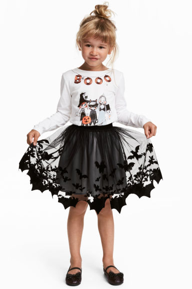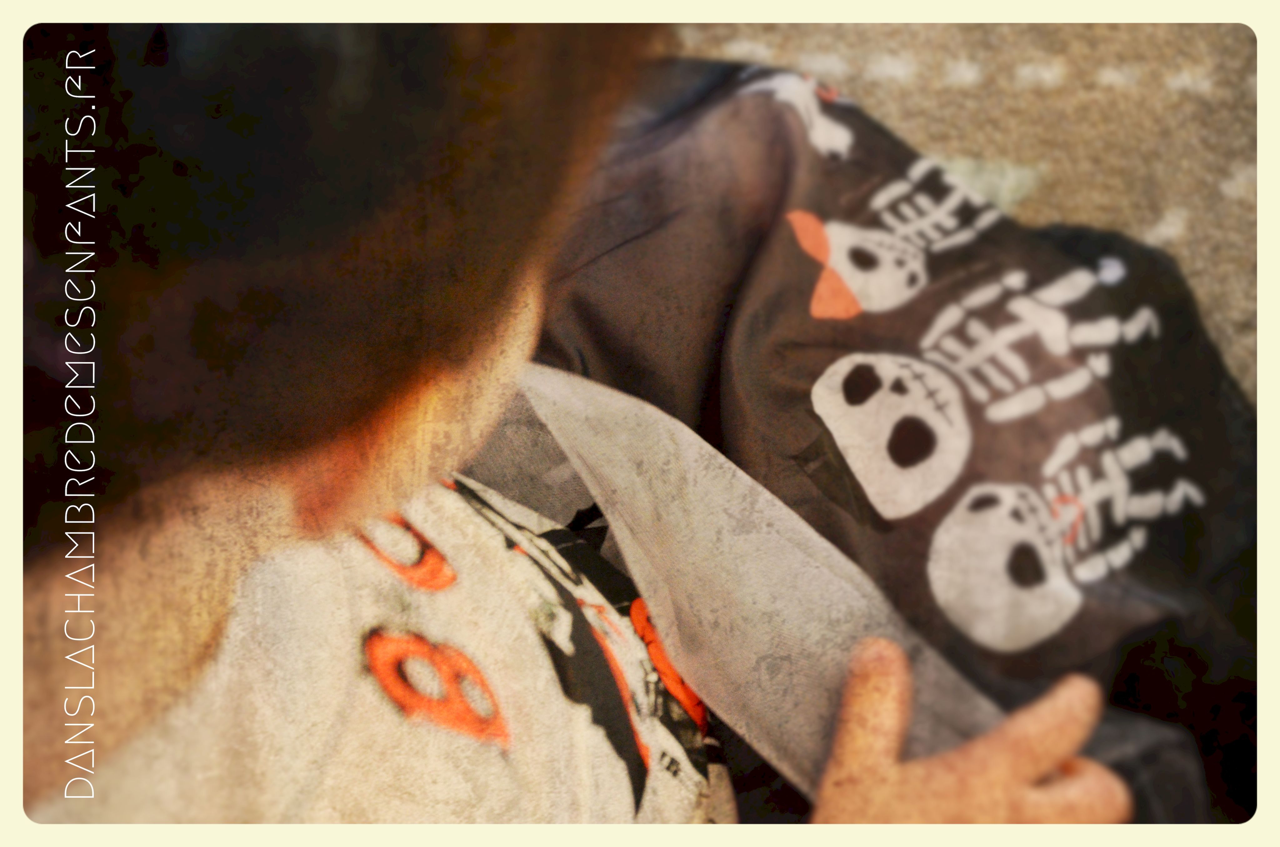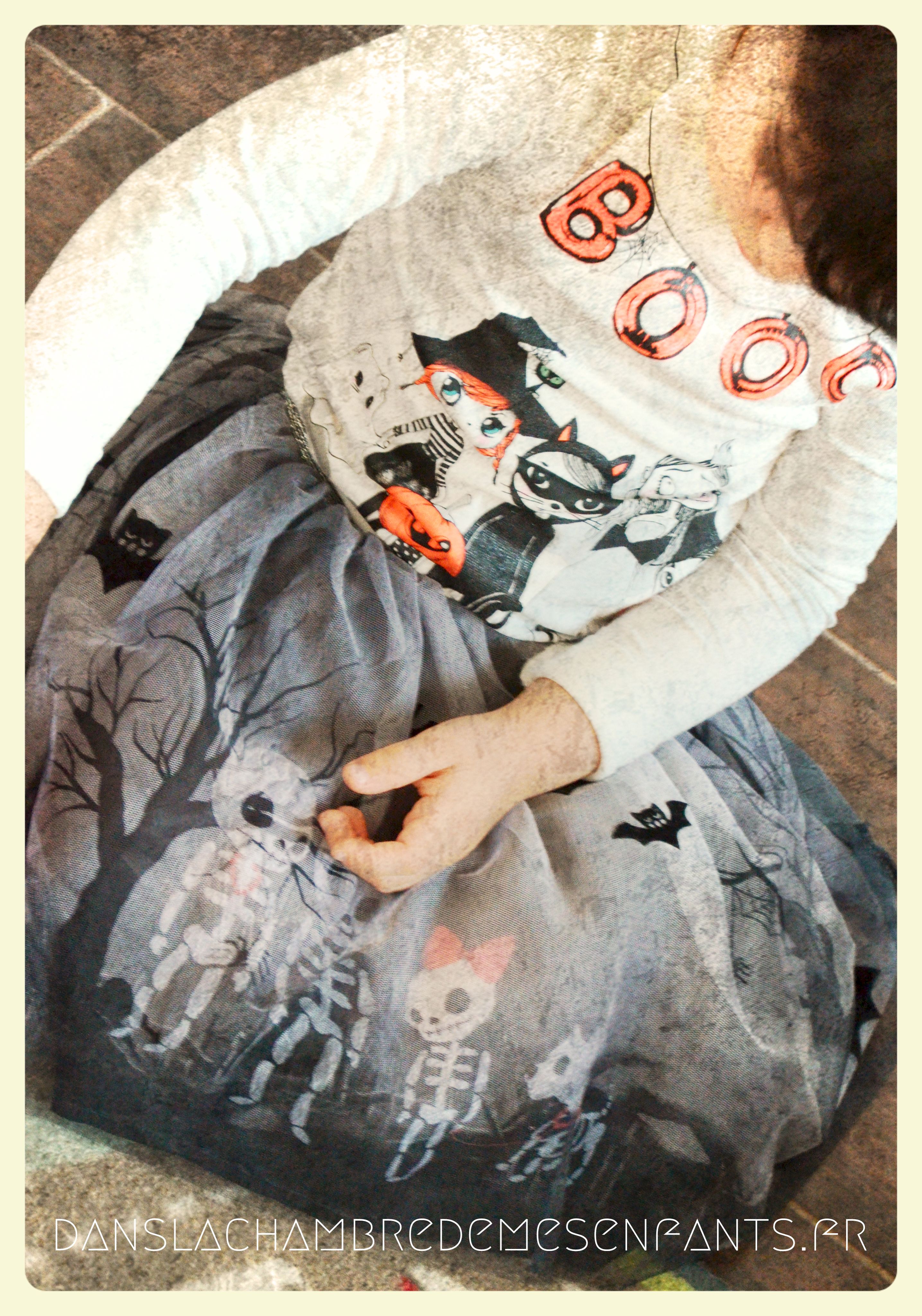 Pour Alex et Emi, j’ai fait un petit tour chez H&M il y a déjà quelques semaines car j’ai opté pour des vêtements qu’ils peuvent porter en dehors de la fête du 31 octobre. C’est un bon compromis et ils sont ravis de pouvoir être déjà dans le thème. Alex en a profité pour choisir une jupe et un masque chauve-souris pour une copine qui fêtait ses 8 ans il a bon goût mon fils 🙂 : Emi : t-shirt imprimé, jupe en tulle & barrettes ; Alex : jogging squelette ; jupe en tulle à motif chauve-souris & masque chauve-souris.