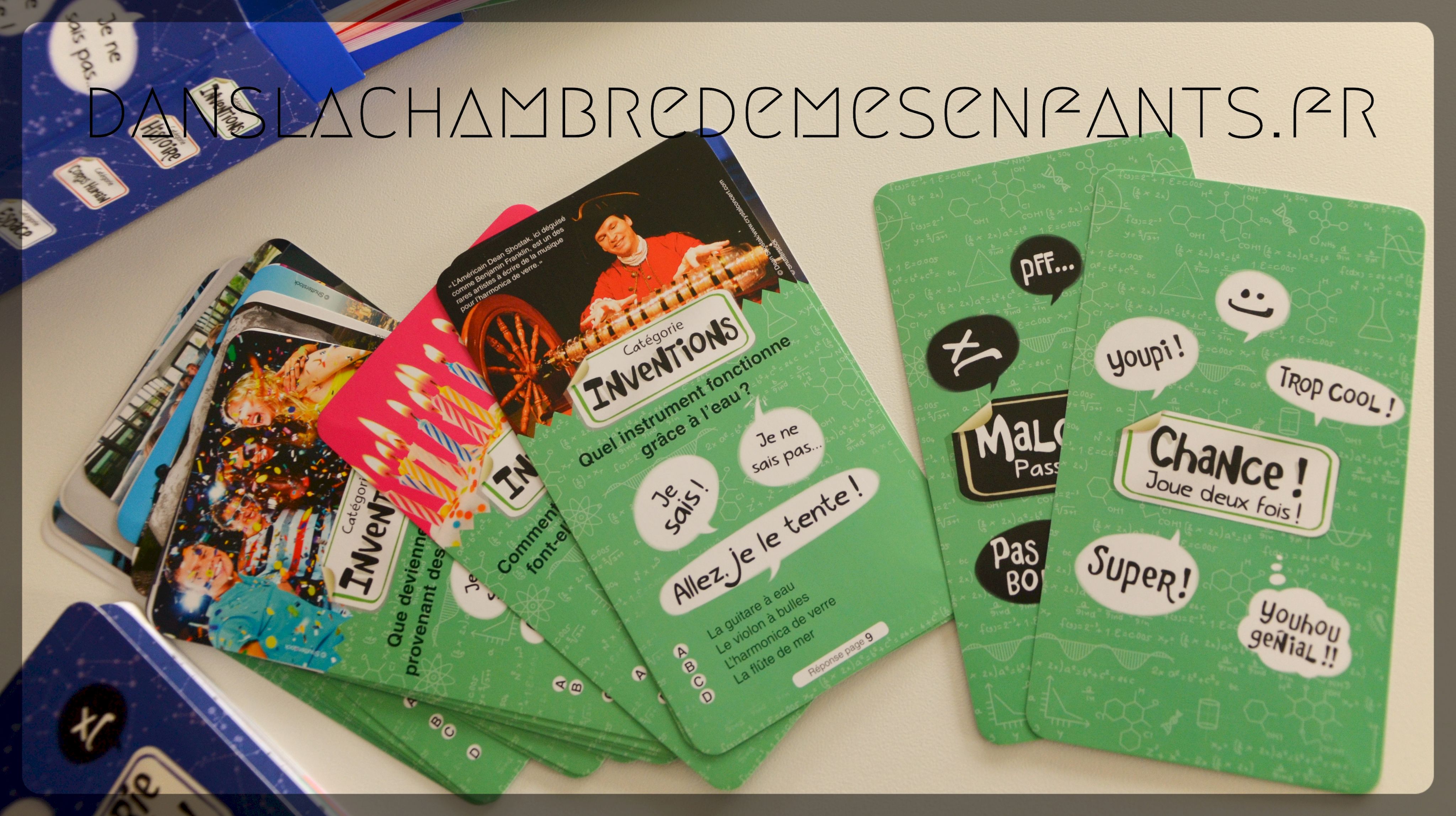 Il s’agit de fiches questions accompagnées d’un carnet avec les règles du jeu et les réponses développées. Le principe est de gagner des points en donnant les bonnes réponses soit en tentant sa chance dès que la question est posée (« Je sais ! ») soit, à moindre gain, à partir d’un choix multiple (« Allez, je le tente ! ») mais on a aussi le droit de renoncer (« Je ne sais pas »). L’enjeu est d’autant plus intéressant que, dans la première hypothèse, la personne qui questionne peut remporter des points en cas de mauvaise réponse. Des cartes « Chance » et « Malchance » viennent ajouter au côté ludique.