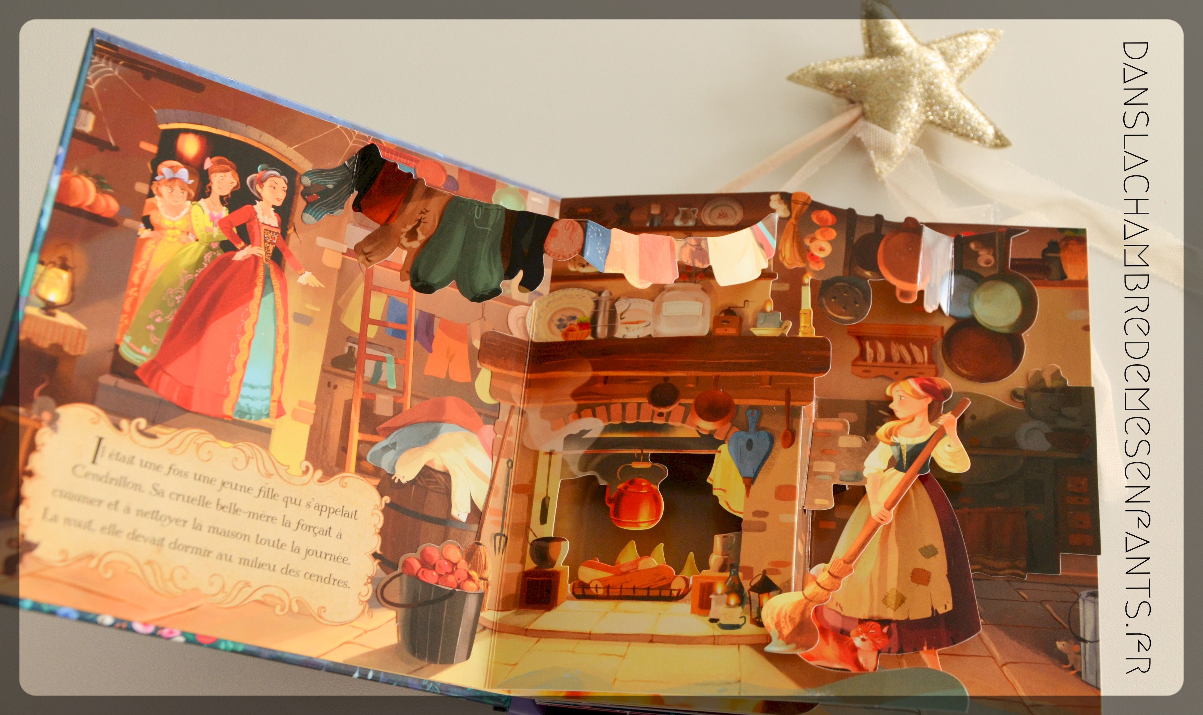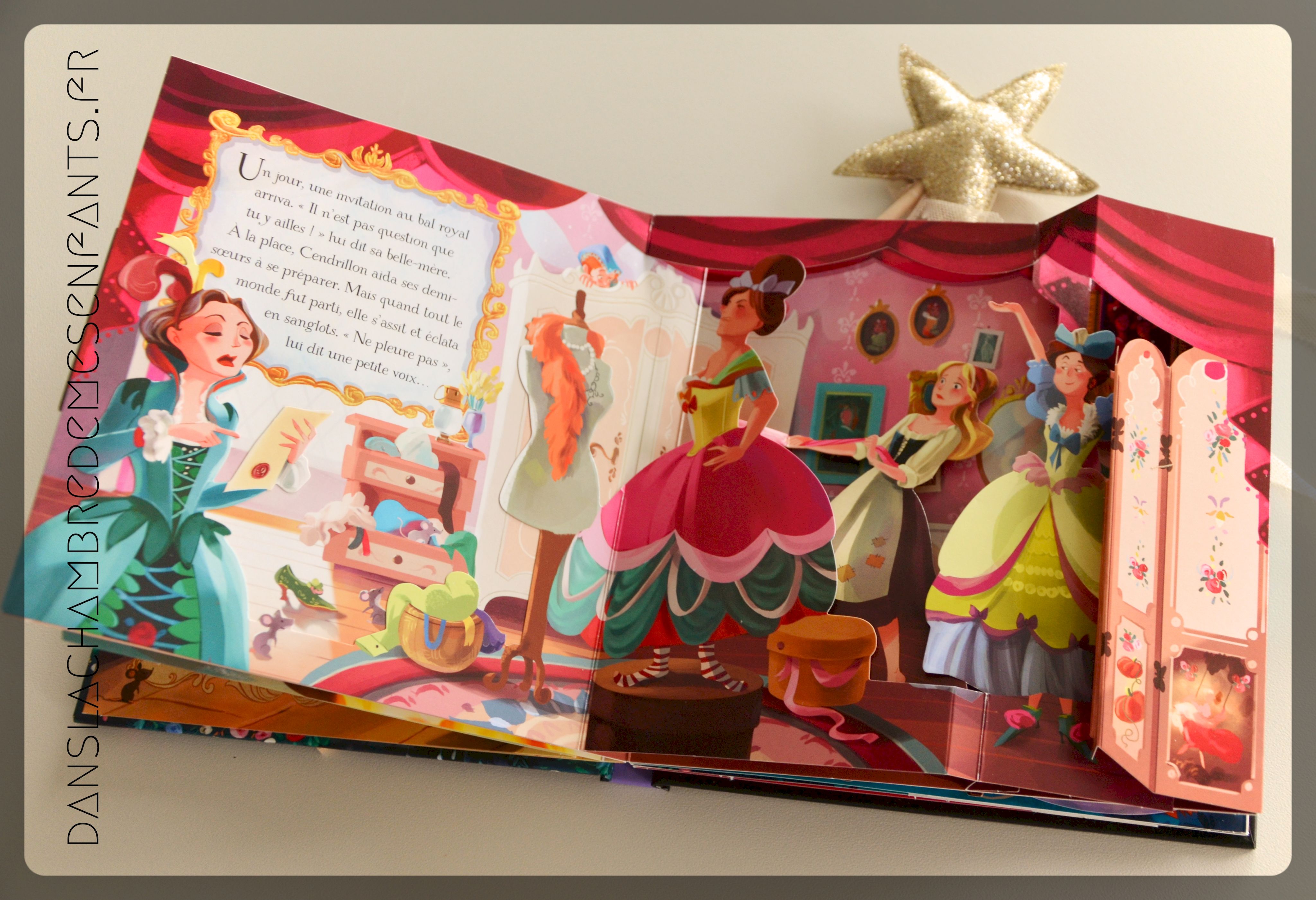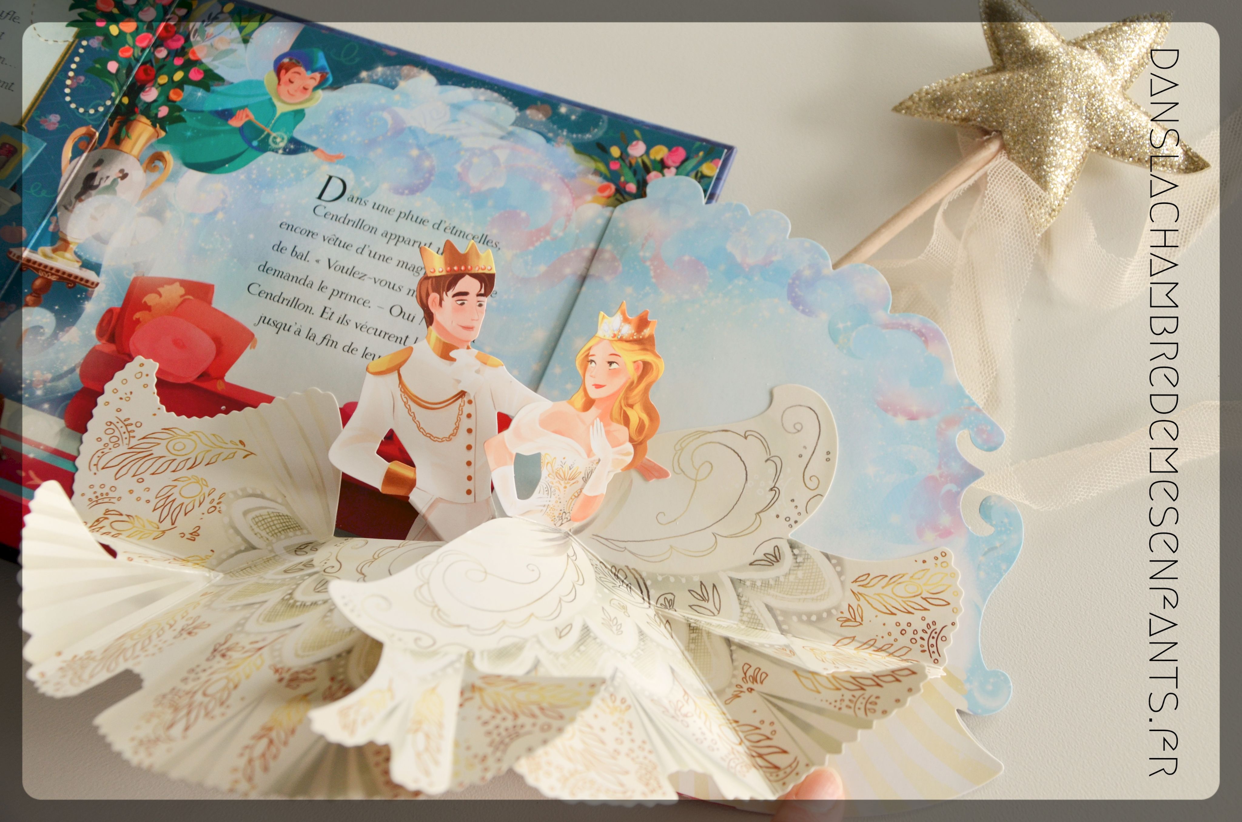 Soucis du détails, qualité de l’ouvrage, on tourne les pages en faisant des « Ohhhh ! » à chaque scène jusqu’à la dernière double page. Comment ? Pas de château qui semble sortir du livre, pas même un carrosse… en poussant le volet, on découvre les amoureux transformés par la magie de la marraine qui les surplombe, la robe blanche de Cendrillon se déployant tel un cygne. Et là on fait « Ahhhh ! » 🙂