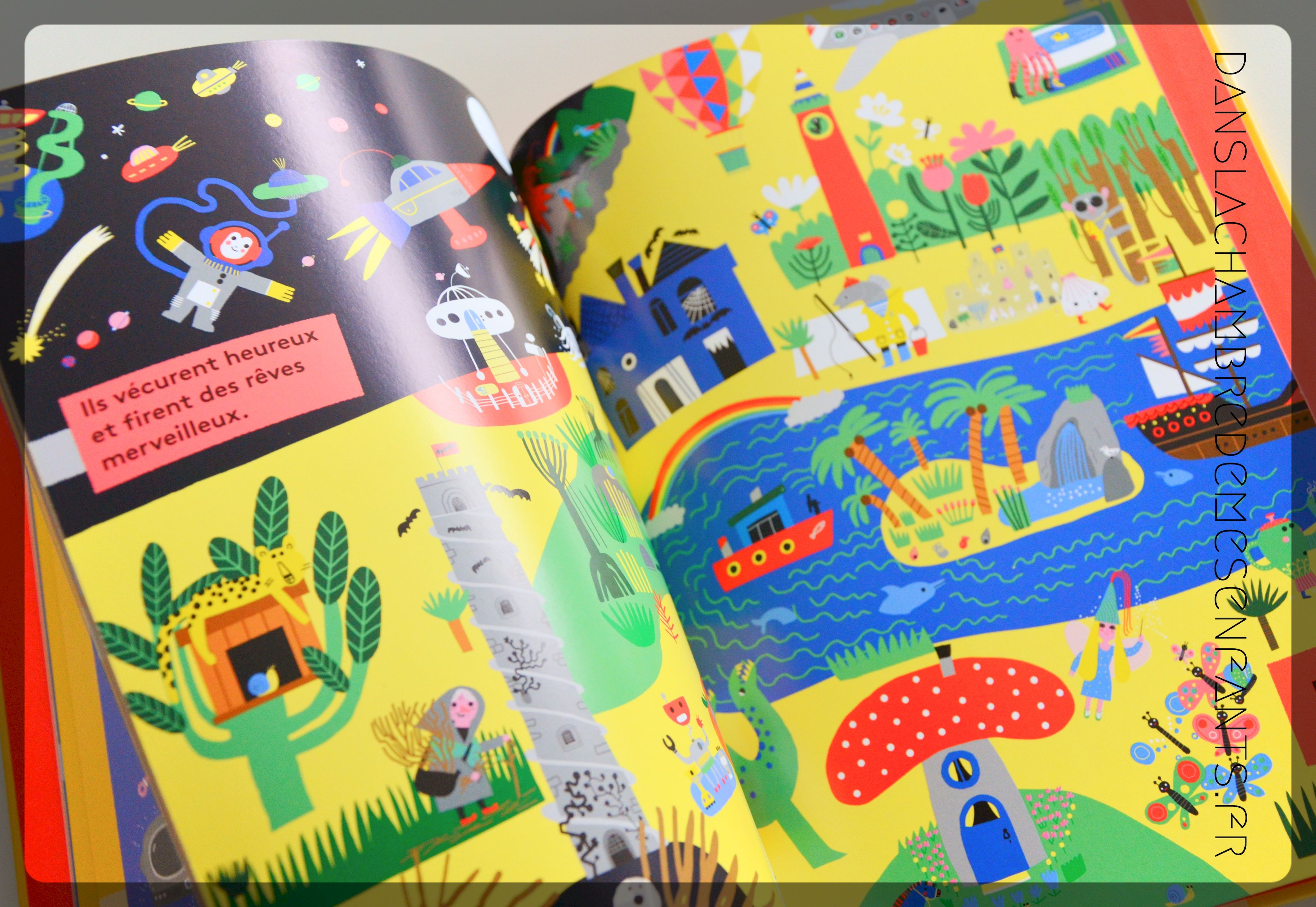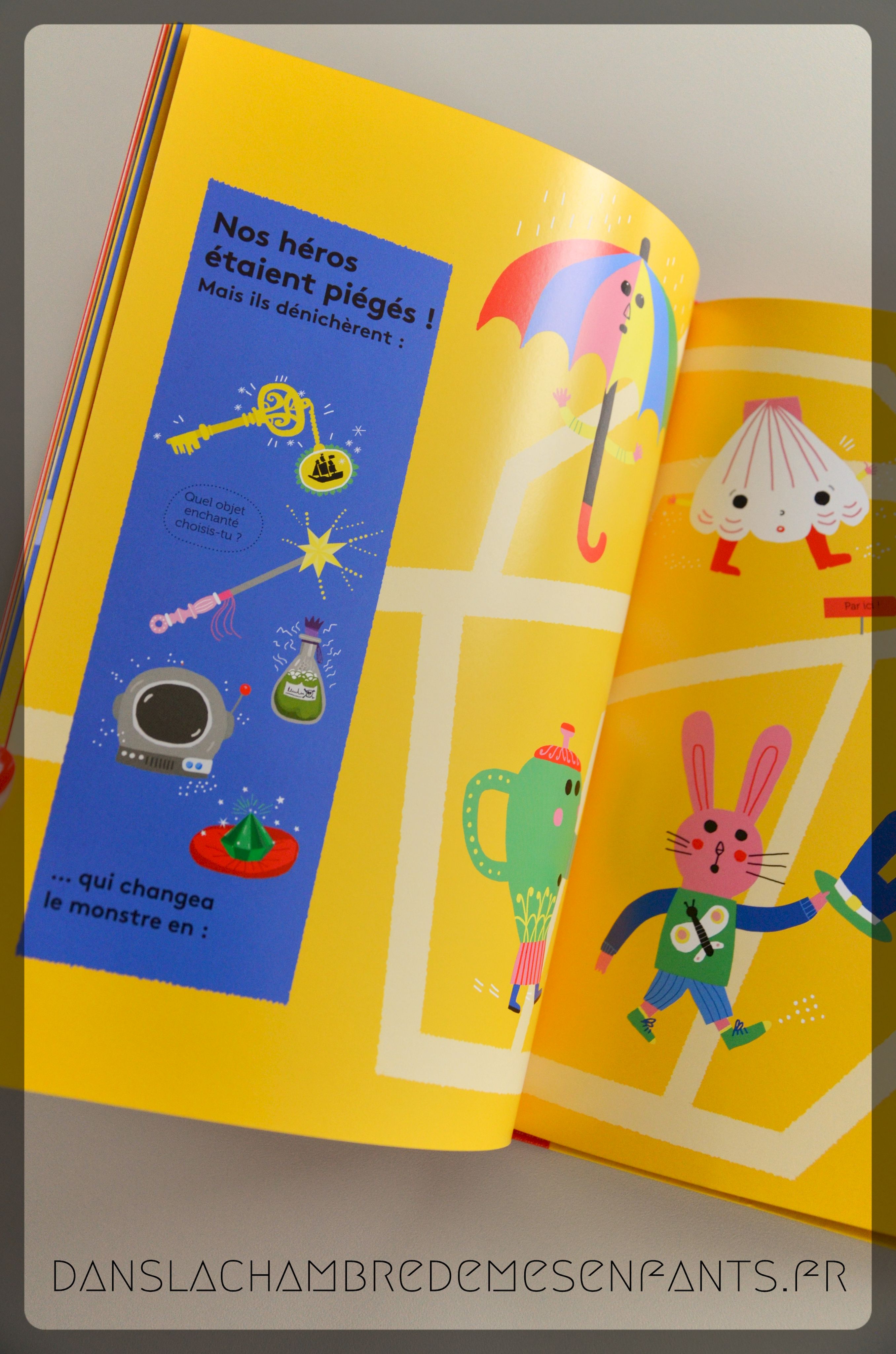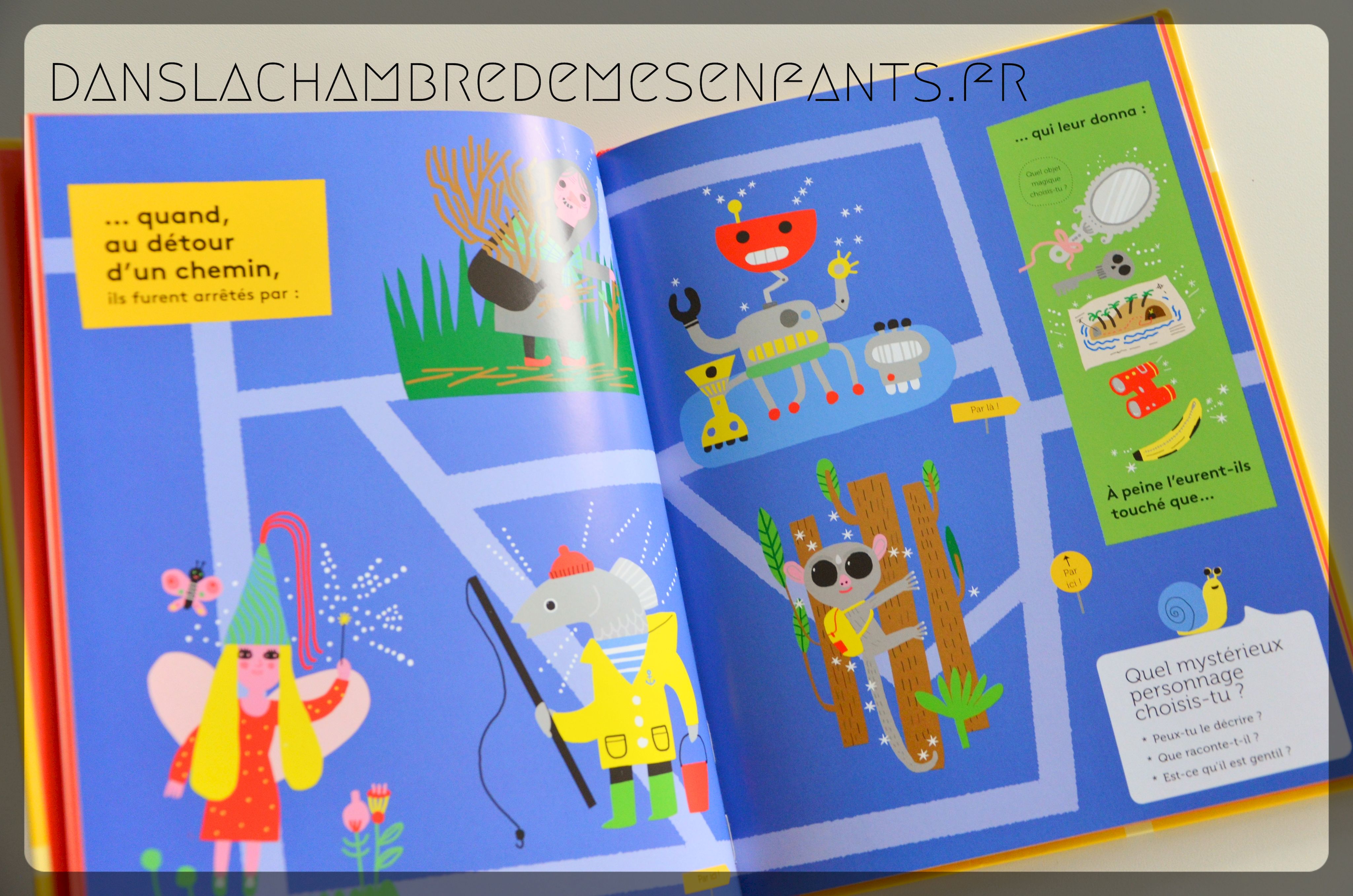 Robots, animaux sauvages, fées et princesses, extraterrestres, monstres, licornes, super-héros… tout ces incontournables d’histoires pour enfants sont dans cet ouvrage. Pour accompagner leur imagination et les faire participer à la narration, chaque double page propose une multitude de chemins jalonnés d’éléments de récits (ex : personnages, costumes, lieux, moyens de transport…). Après une très brève introduction, l’enfant poursuit en décrivant le dessin rencontré sur le chemin choisi. Pour aider davantage, un petit escargot en coin de page propose des questions permettant le développement (ex : « Quel déguisement choisis-tu ? De quelle couleur est-il ? Est-ce que c’est un bon déguisement pour s’enfuir discrètement ? »).