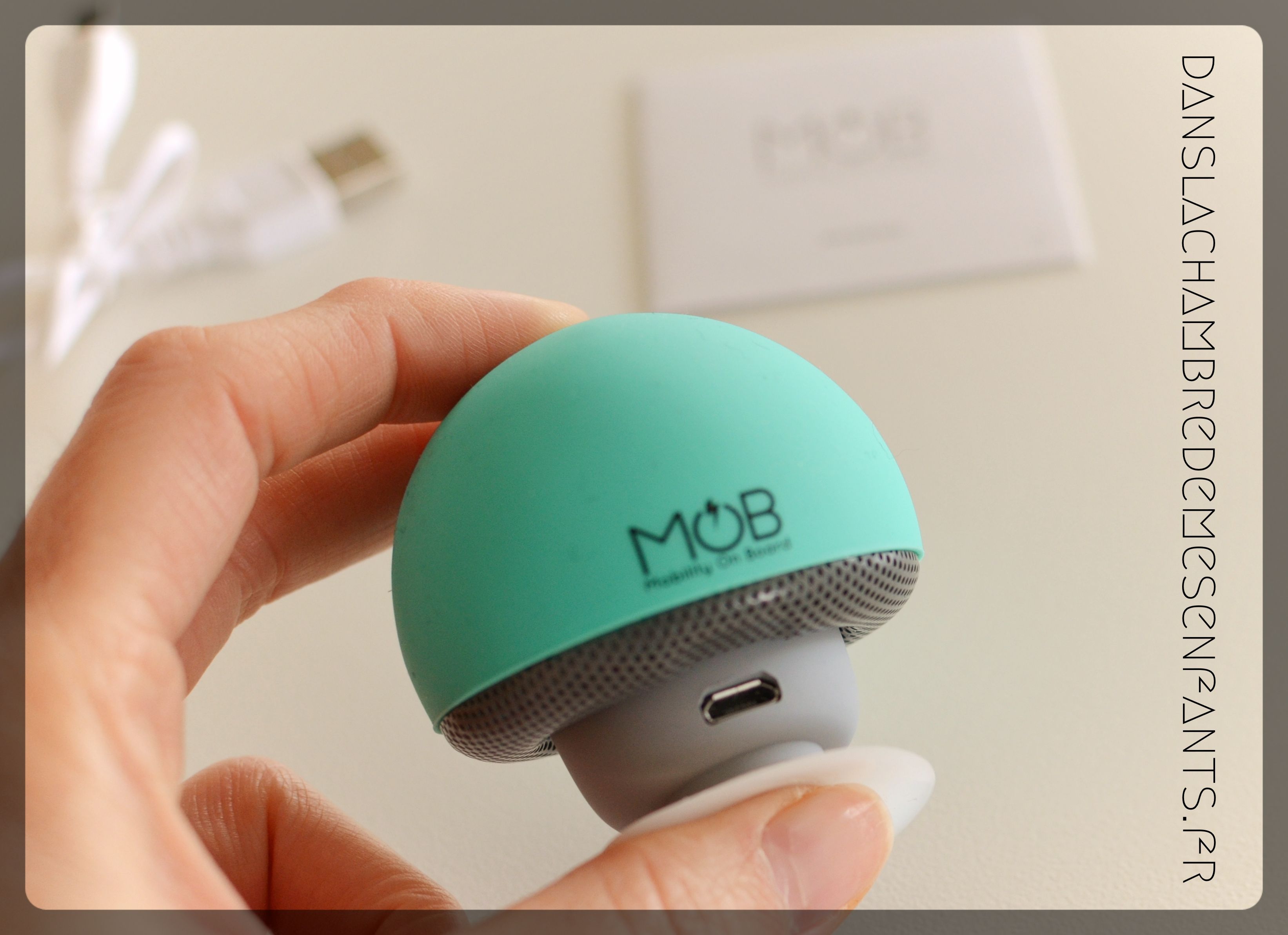 MOB chez commentseruiner.com - prix de vente : 24,95 € - Dimensions : 55 x 55 x 55 mm 5 coloris disponibles (dans l'art : modèle "bleu clair") Bluetooth V3.0 - Ventouse - Autonomie : 3 H - Puissance : 3 W - Waterproof IPX4