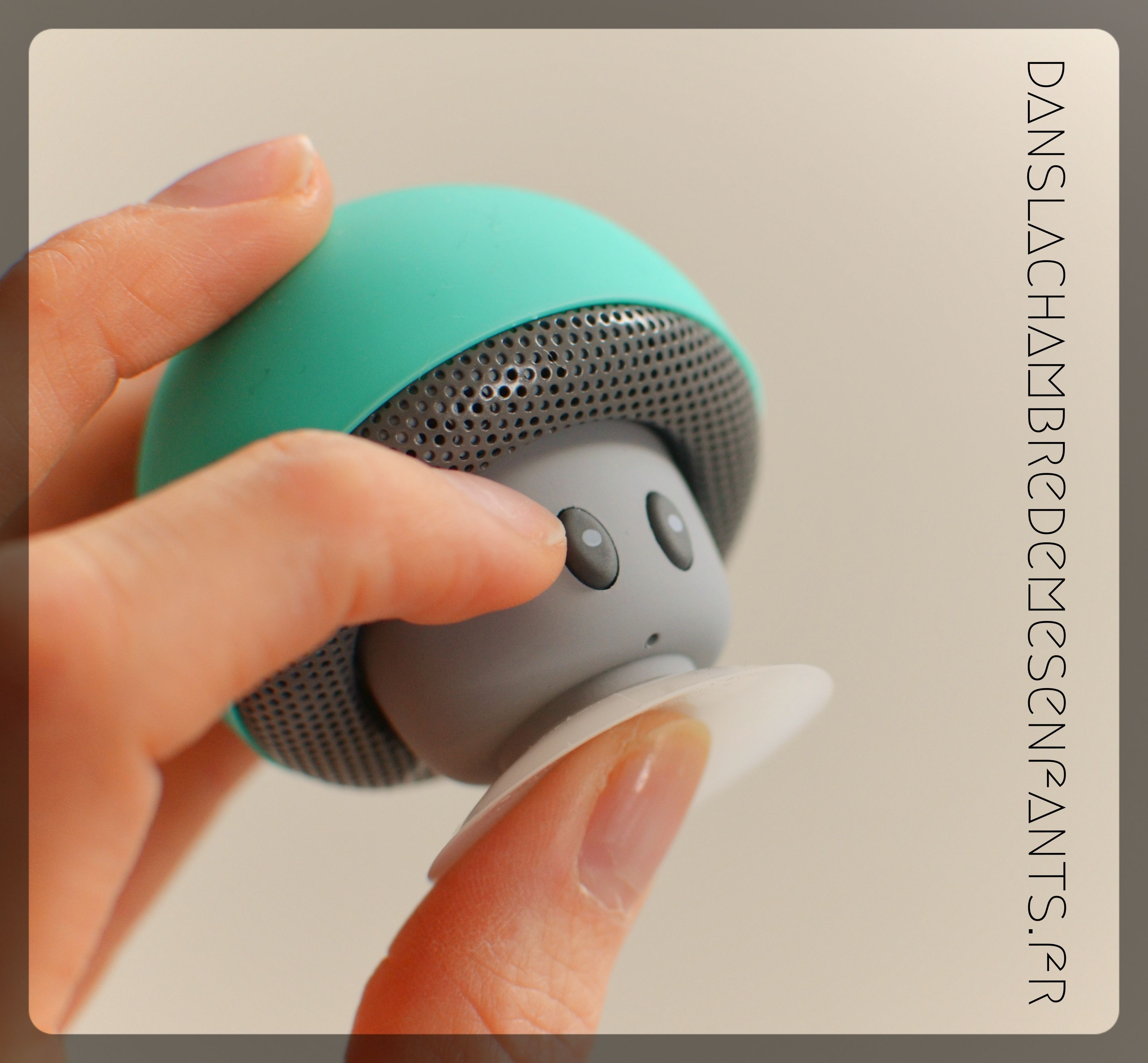 Tout d’abord, il est très simple d’utilisation : il s’allume et s’éteint par pression sur la tête du champignon, ses yeux permettent de contrôler le volume du son et il se recharge par prise USB à l’arrière.