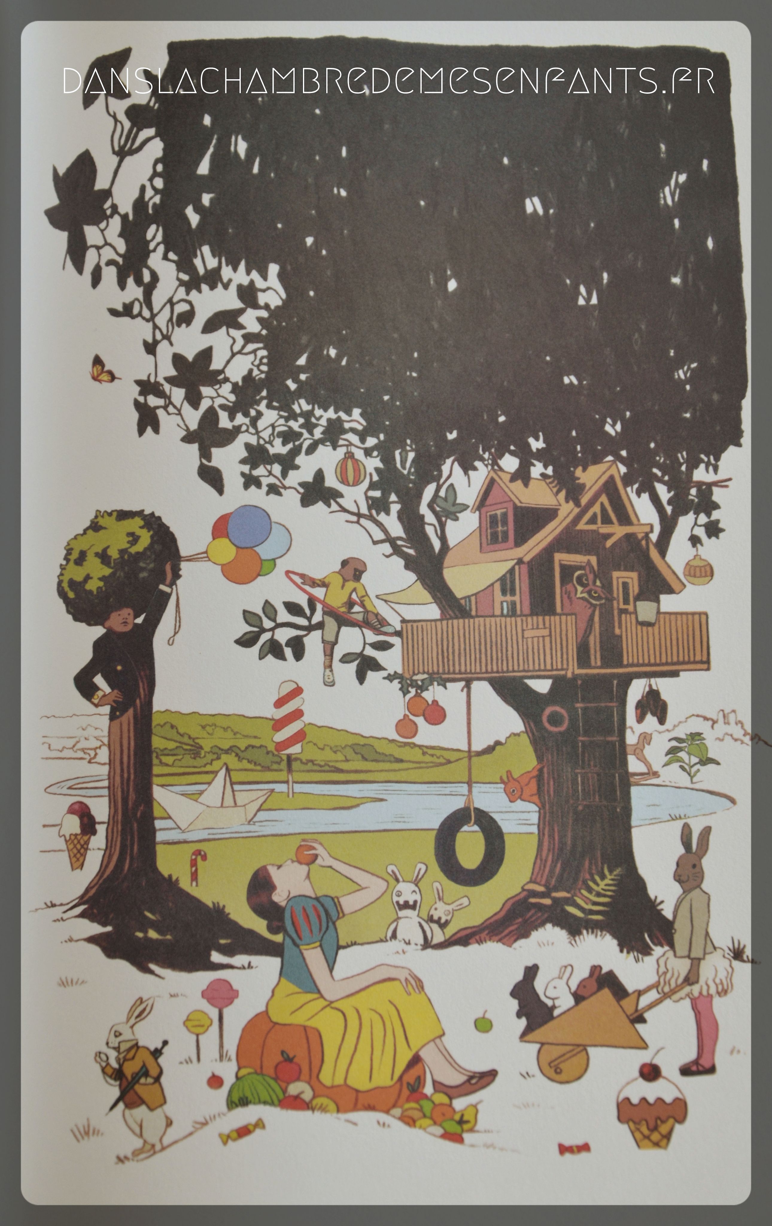 On y découvre un monde où tout est possible et ludique, sans crainte, celui que rêve de créer et de partager ce père : « Ton palais le voici, c’est mon cœur […] Dans mon cœur tu trouveras aussi une immense prairie […] Au cœur de mon jardin sera ton jardin secret, tu y cultiveras ma patience, tu y feras pousser mes soucis, éclore mes plus éclatantes pensées […] C’est un royaume sans murs, mon cœur, ouvert, c’est un château-fort sans guerres où les armures sont des pyjamas […] Mon amour sera ta forteresse et l’éclat de ton rire le plus sûr rempart contre ma tristesse […] ». Cette promesse d’amour inconditionnel s’accorde avec les illustrations qui semblent faire fi du temps qui passe à travers des détails d’époques anciennes et actuelles pour créer un pont entre les générations.