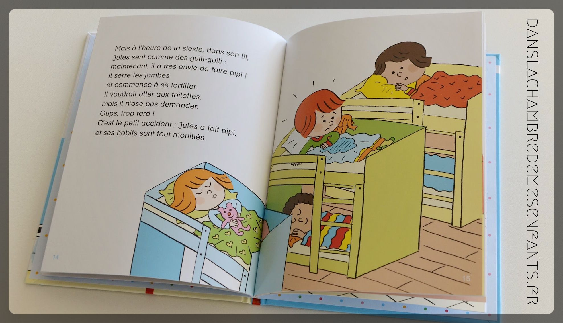 Côté histoire, il s’agit d’une journée dans la classe de petite section de maternelle : les enfants sont enjoués dont Jules mais ce dernier repousse sans cesse la pause pipi, jusqu’au moment intenable lors de la sieste. Malgré la honte qu’il ressent, c’est l’occasion de rappeler l’intérêt des arrêts toilettes réguliers et de marquer ainsi le rythme collectif de ce nouveau petit groupe.